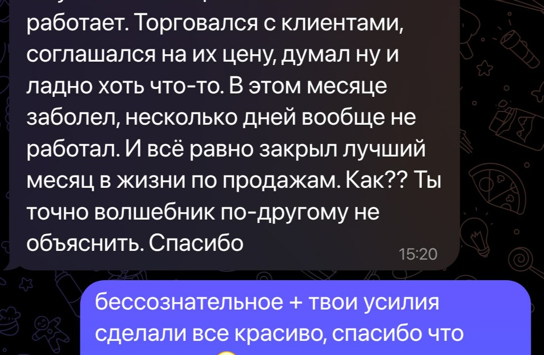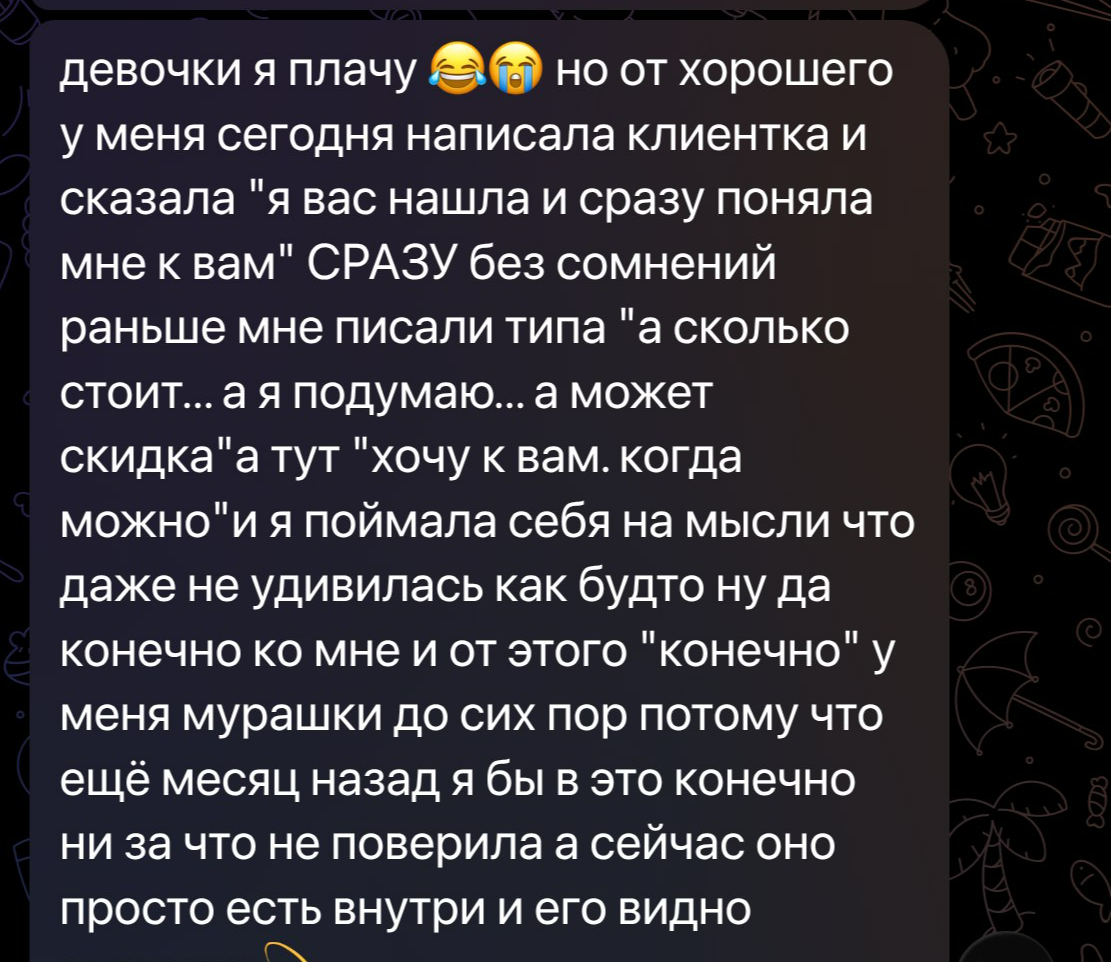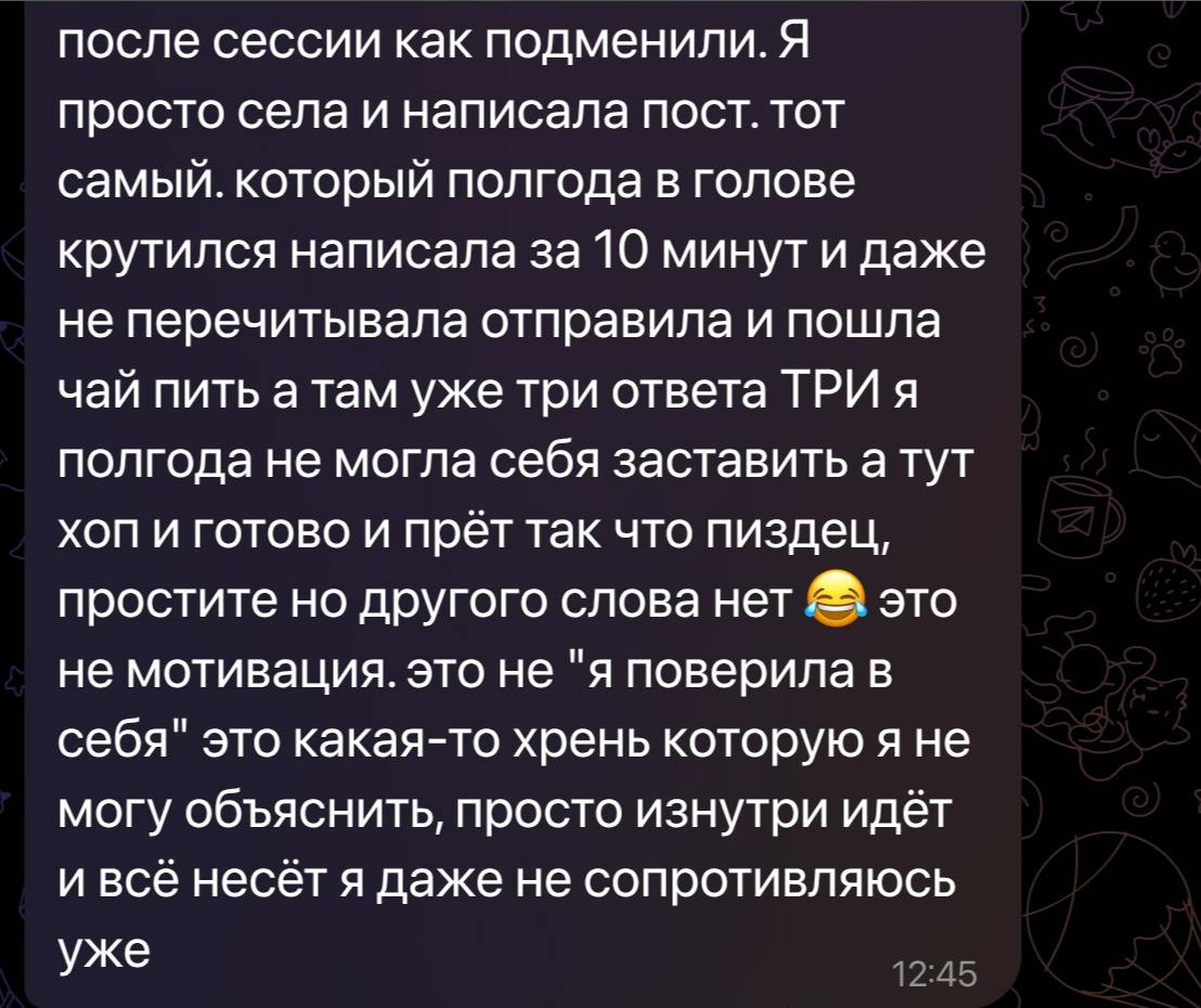 - Вы привыкли что результат приходит быстро или не приходит вообще. Здесь по-другому. Бессознательное не работает по дедлайнам. Иногда сдвиг виден через неделю. Иногда через месяц когда оглядываешься и понимаешь что что то изменилось. Если вы из тех кто бросает на третий день - лучше не начинать.