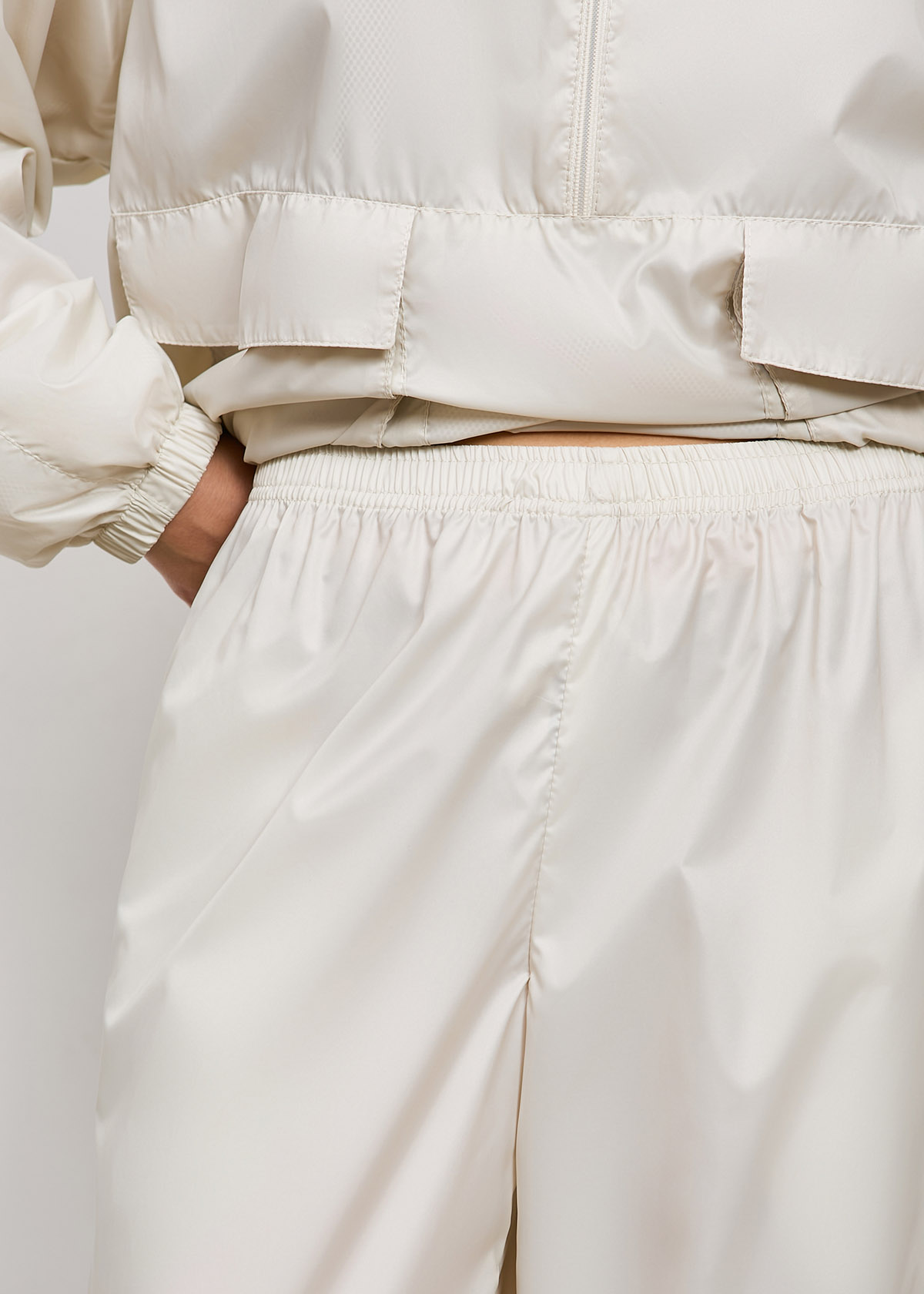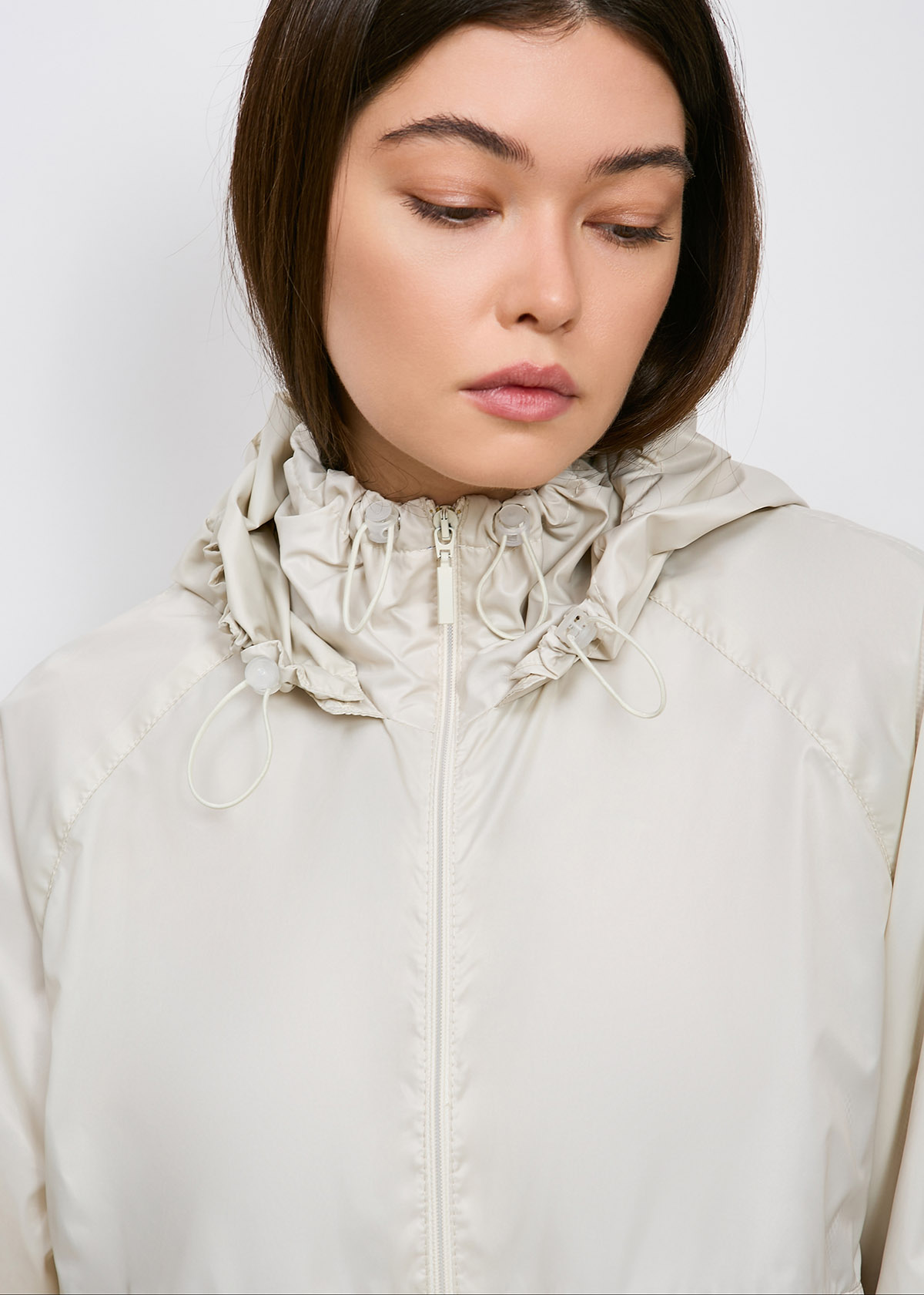 В кулиски верхнего среза воротника, капюшона, а также по низу изделия установлены люверсы, через которые продет эластичный шнур с фиксаторами. По низу куртки люверсы и фиксаторы расположены в области боковых швов.