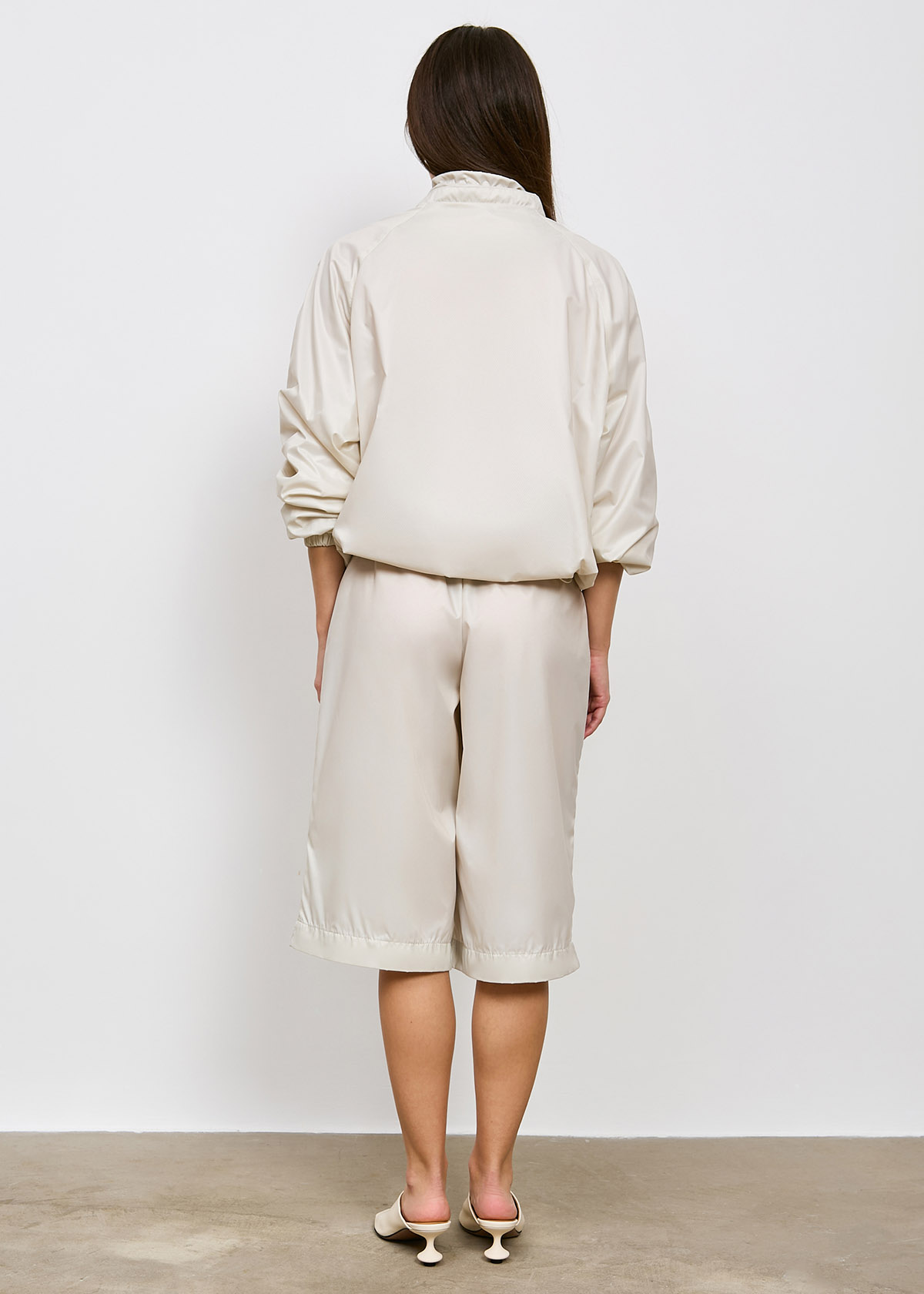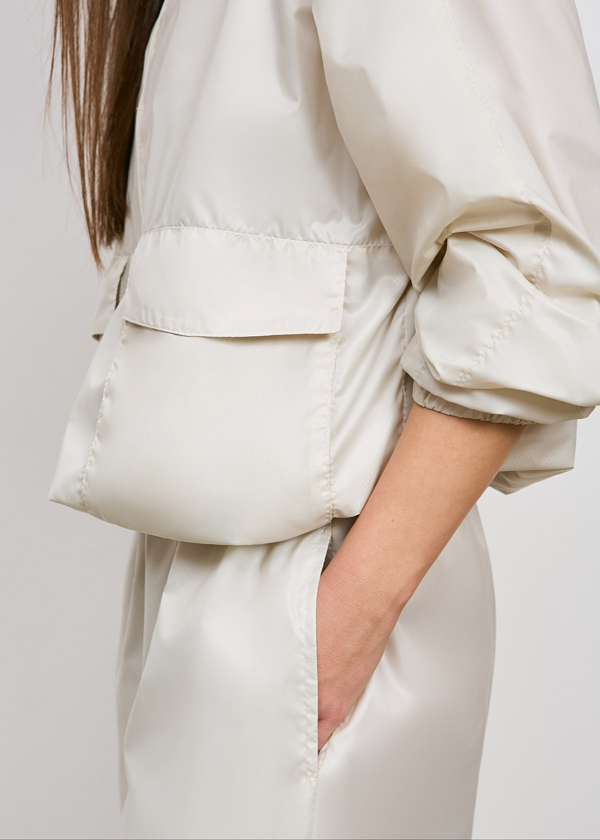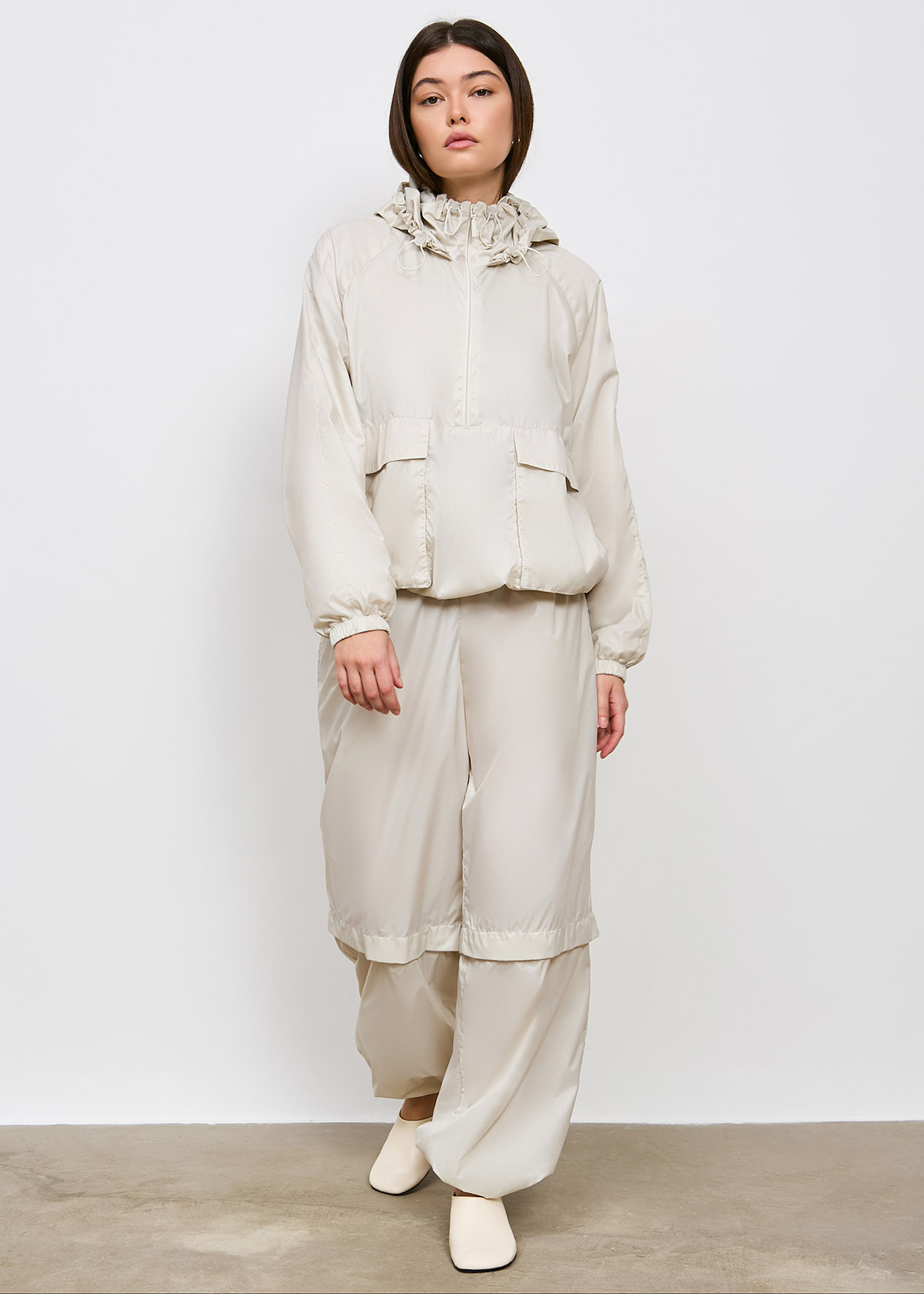 Анорак большого объема, прямого силуэта, длиной до линии бедер, с рукавом реглан.