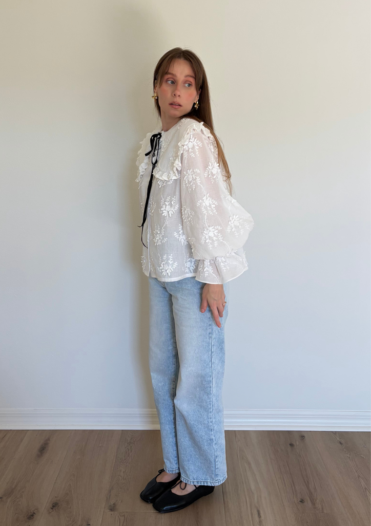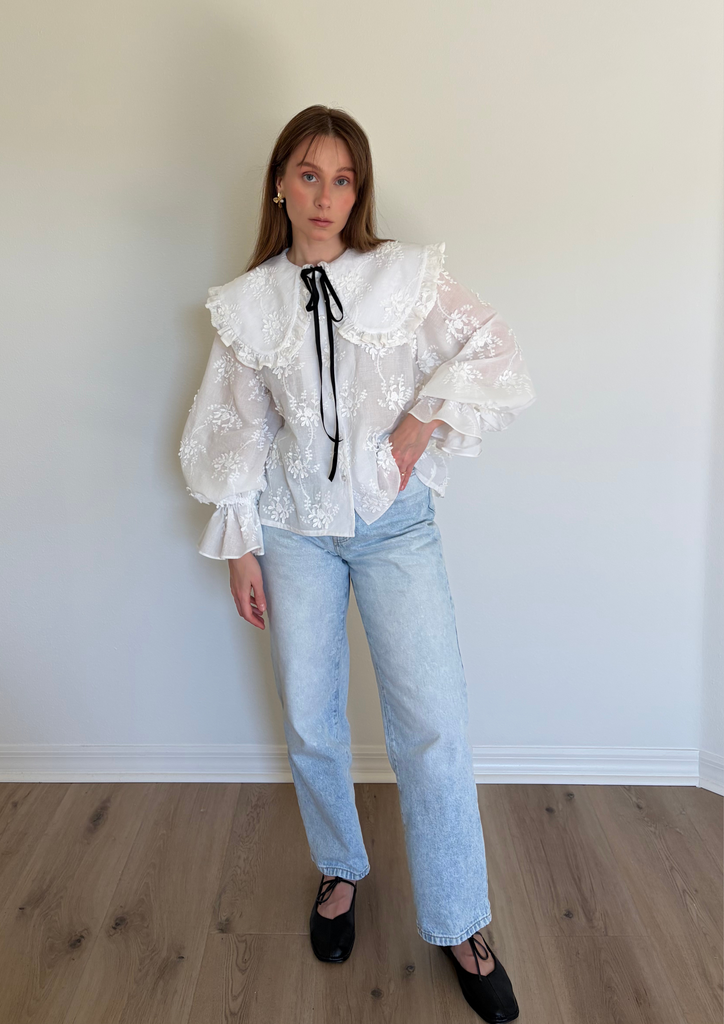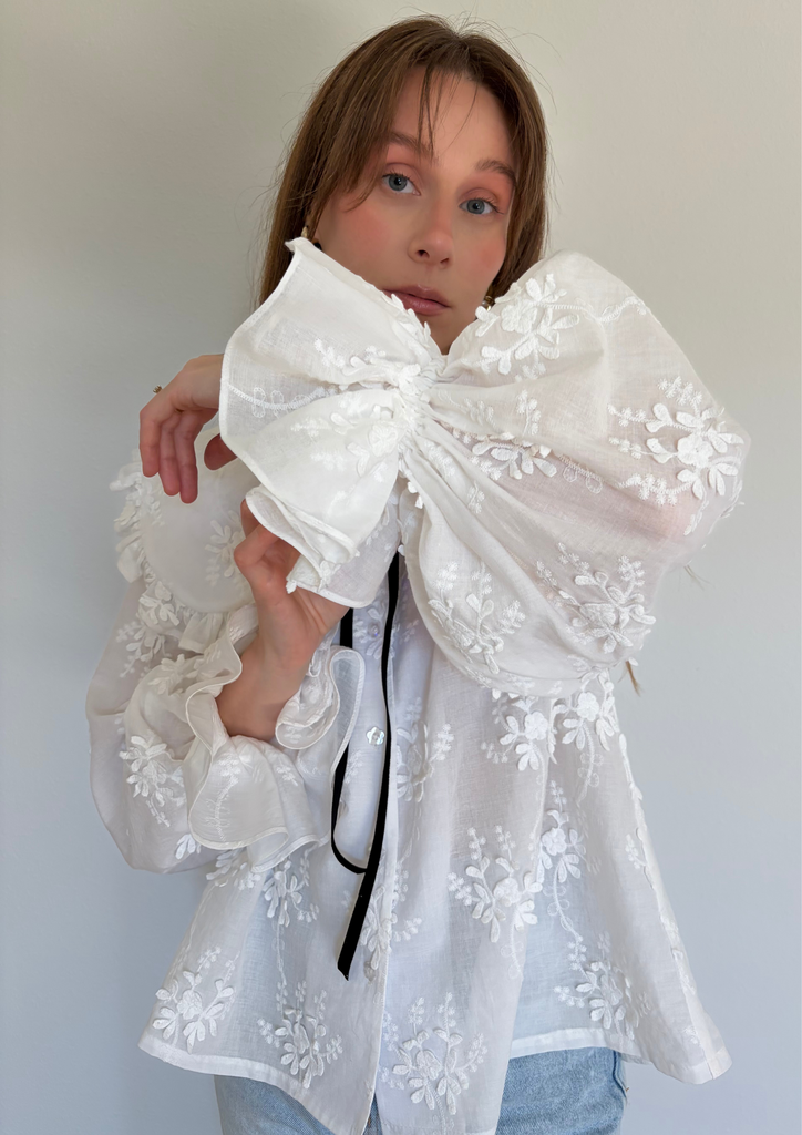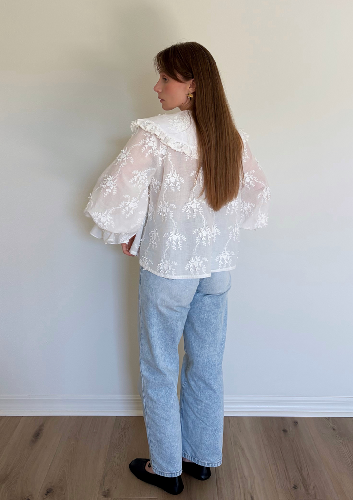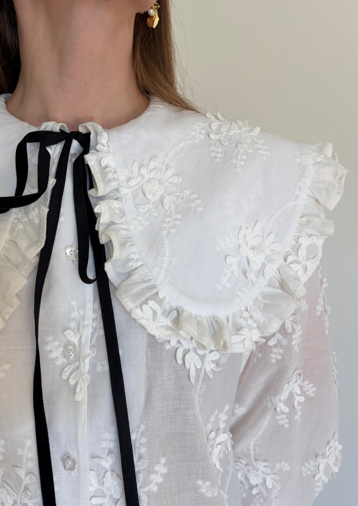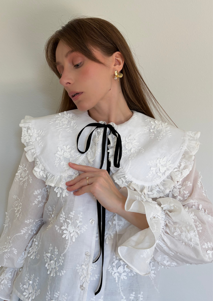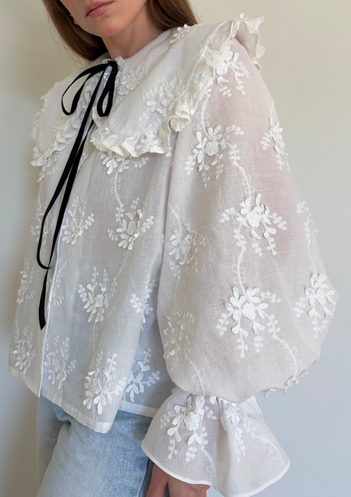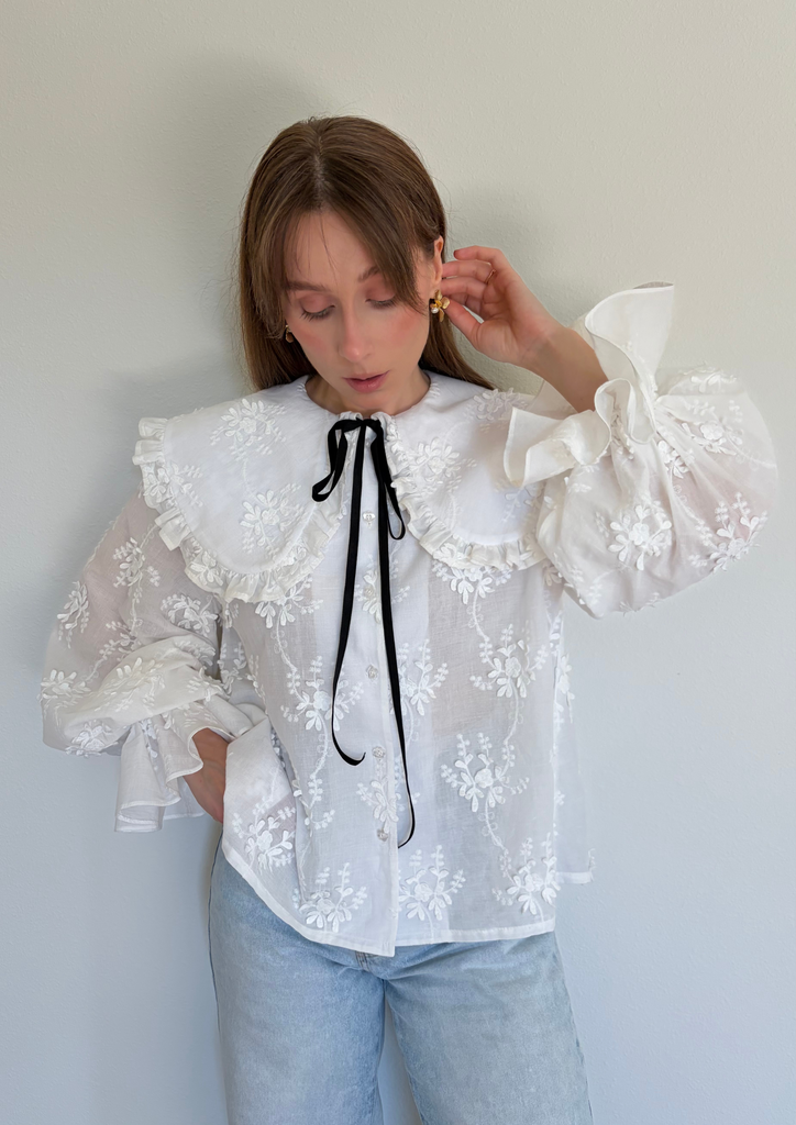 На модели блуза выполнена из батиста с объёмной вышивкой: