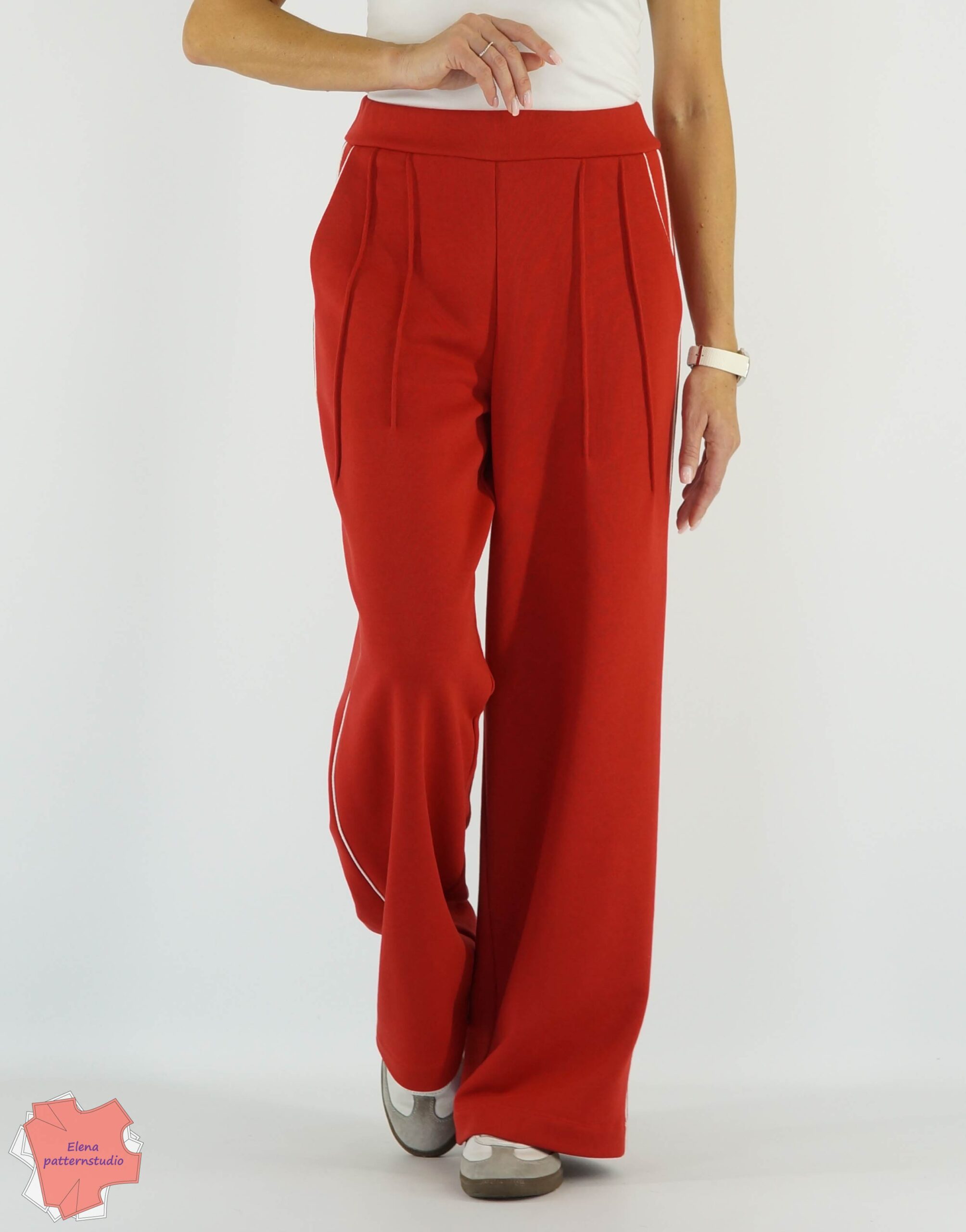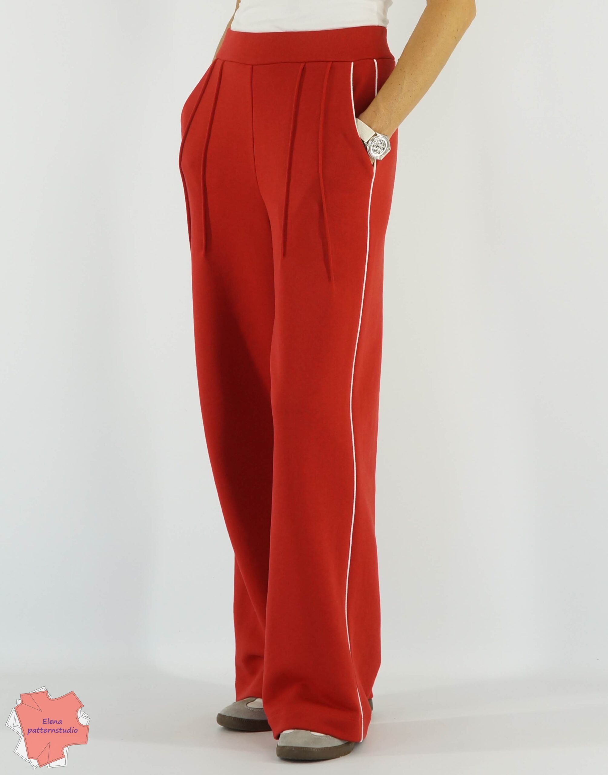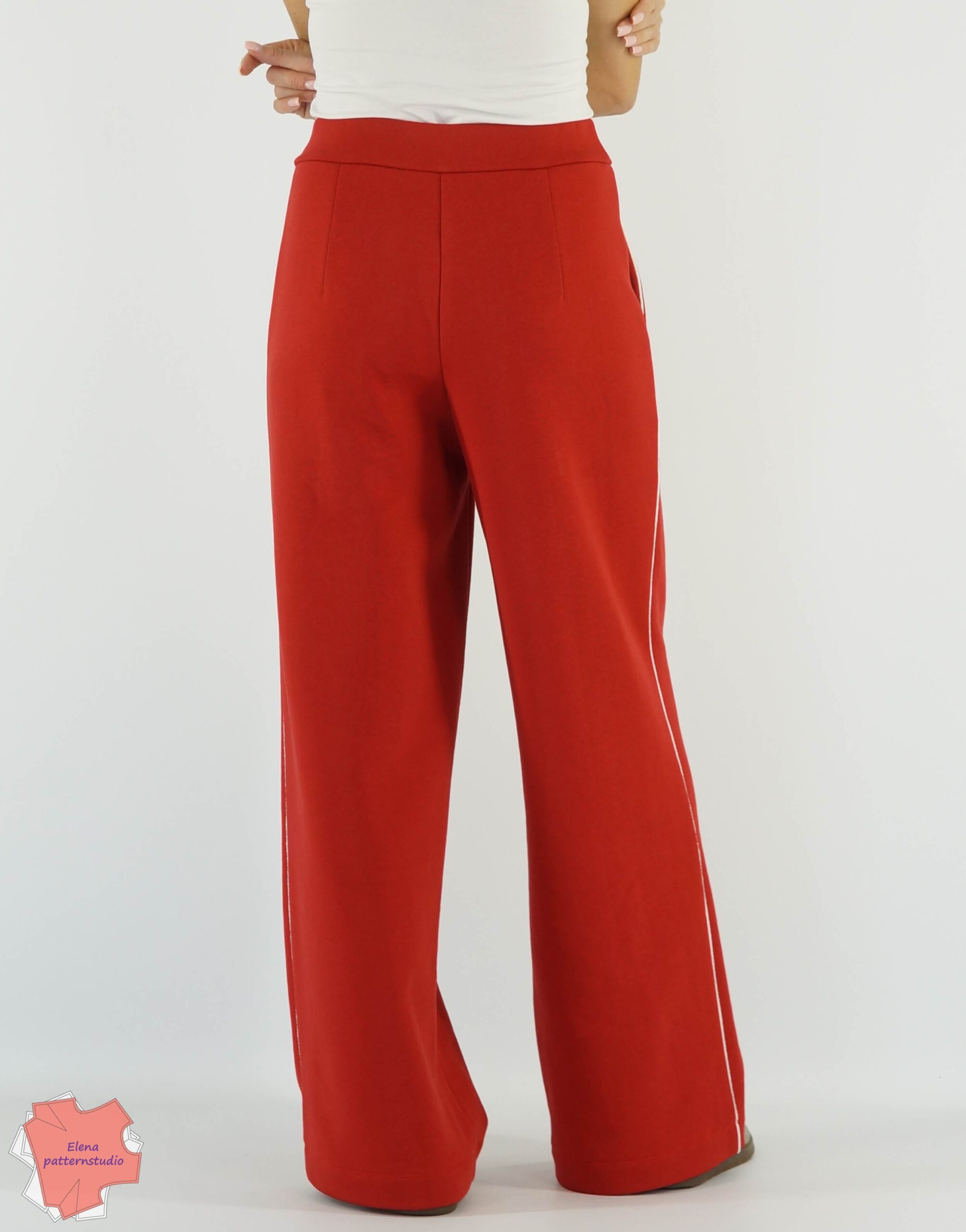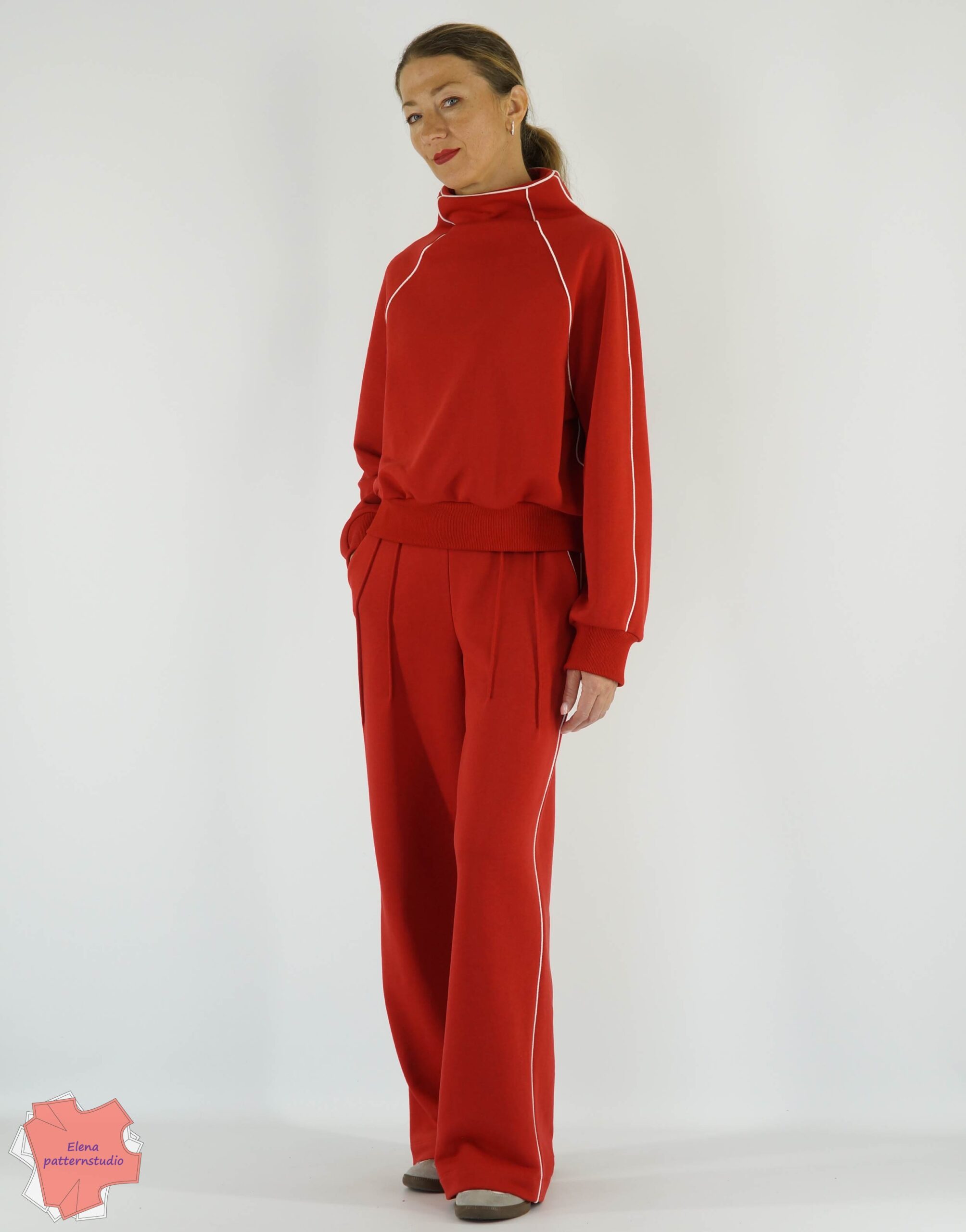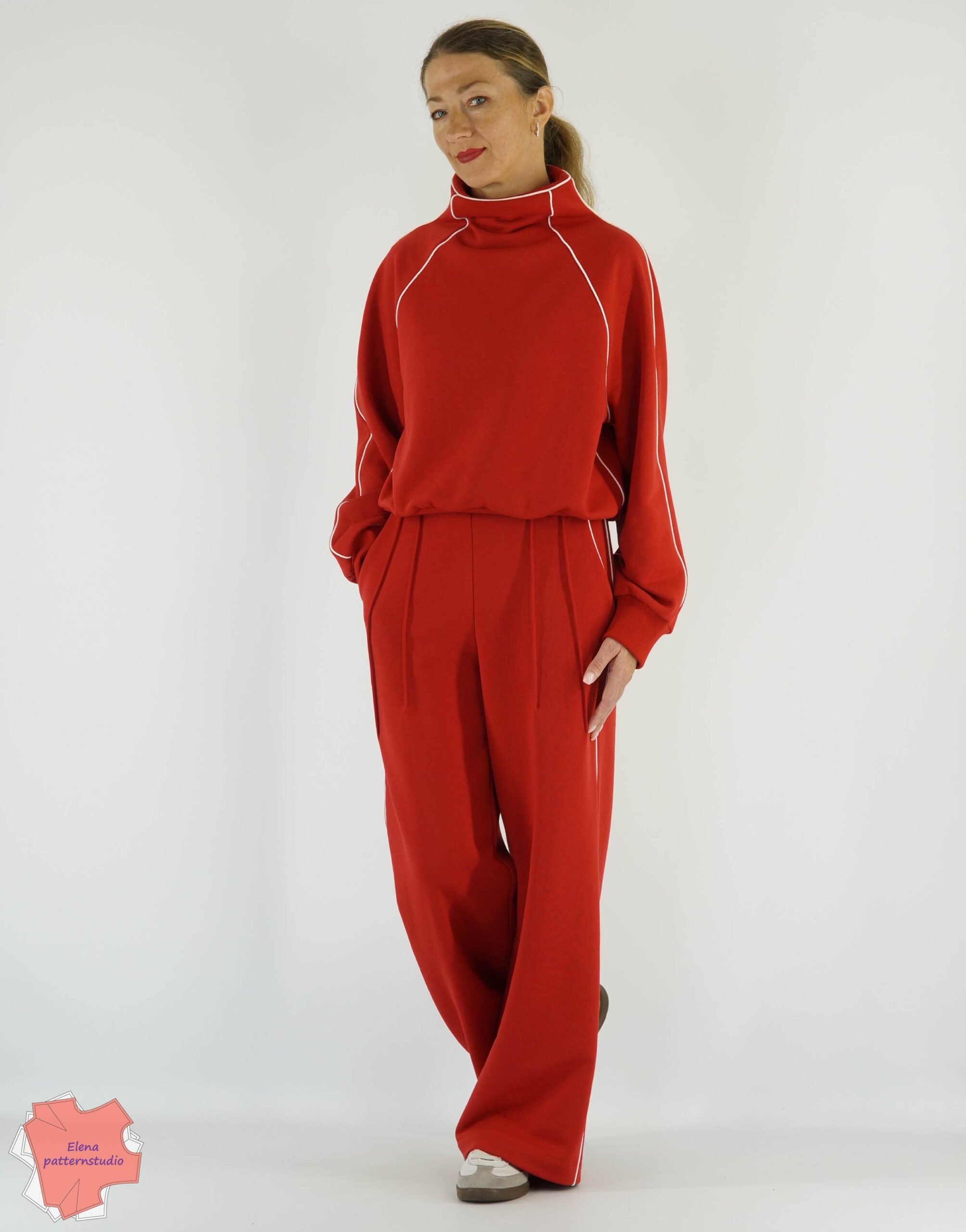 Брюки на фото Elenapatternstudio выполнены из петельного 3-х ниточного футера, состав: 65% хлопок, 35% полиэстер, плотность 320 г/м2.