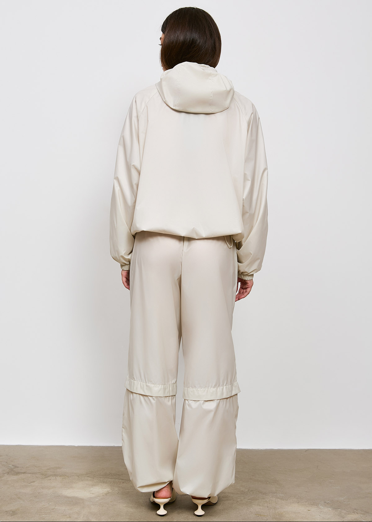 Брюки с отстёгивающейся нижней частью. Разделение штанины выполнено с помощью супатной застежки с цельнокроеной планкой с застежкой на прорезные петли и пуговицы.