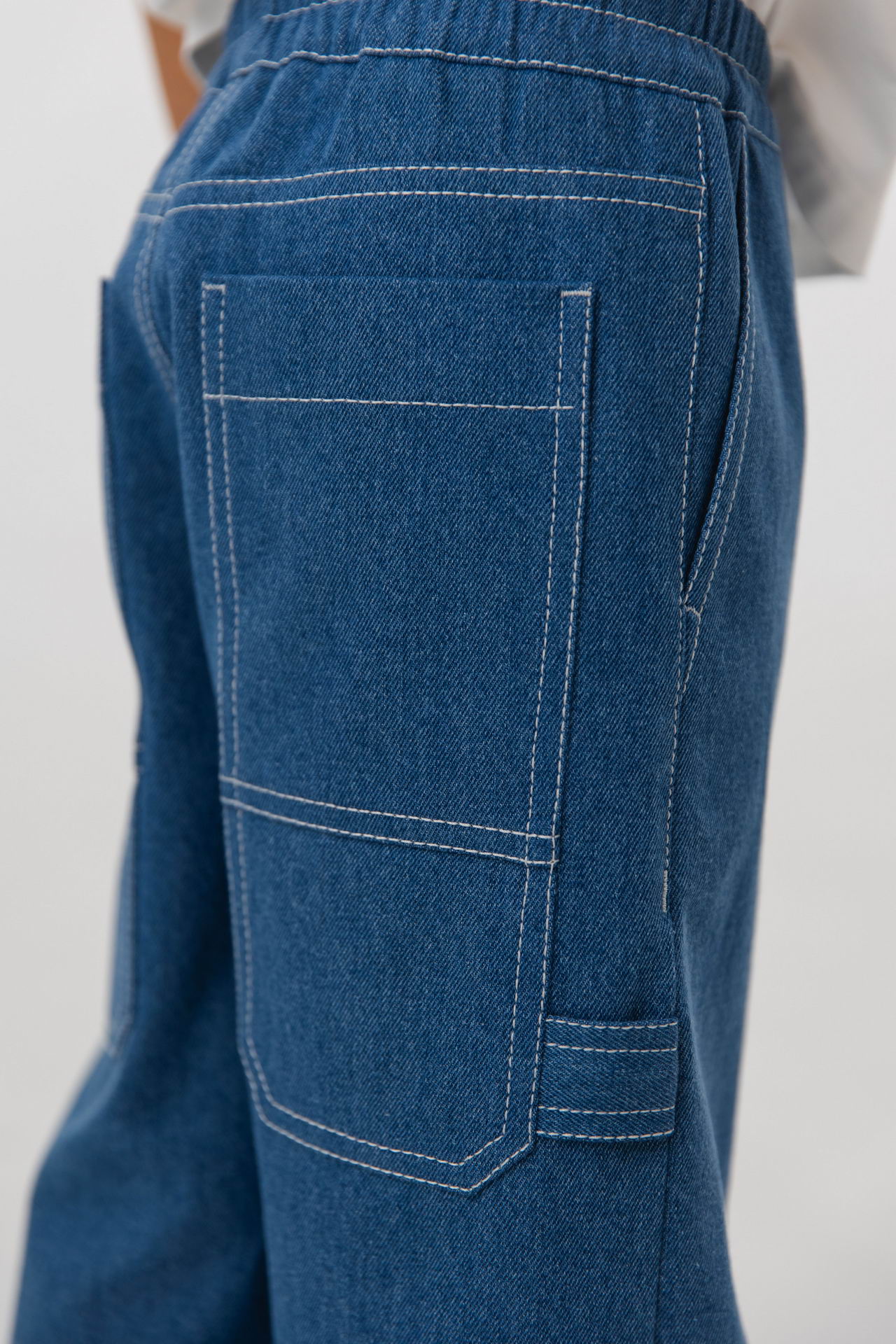 Брюки умеренного объема, прямого кроя. Притачной пояс находится чуть ниже линии талии. В пояс вставлена эластичная тесьма (резинка). На передних половинках брюк карманы с отрезной боковой частью. На задних половинках брюк отрезная кокетка и накладные глубокие карманы фигурной формы. Длина брюк ниже линии щиколотки.