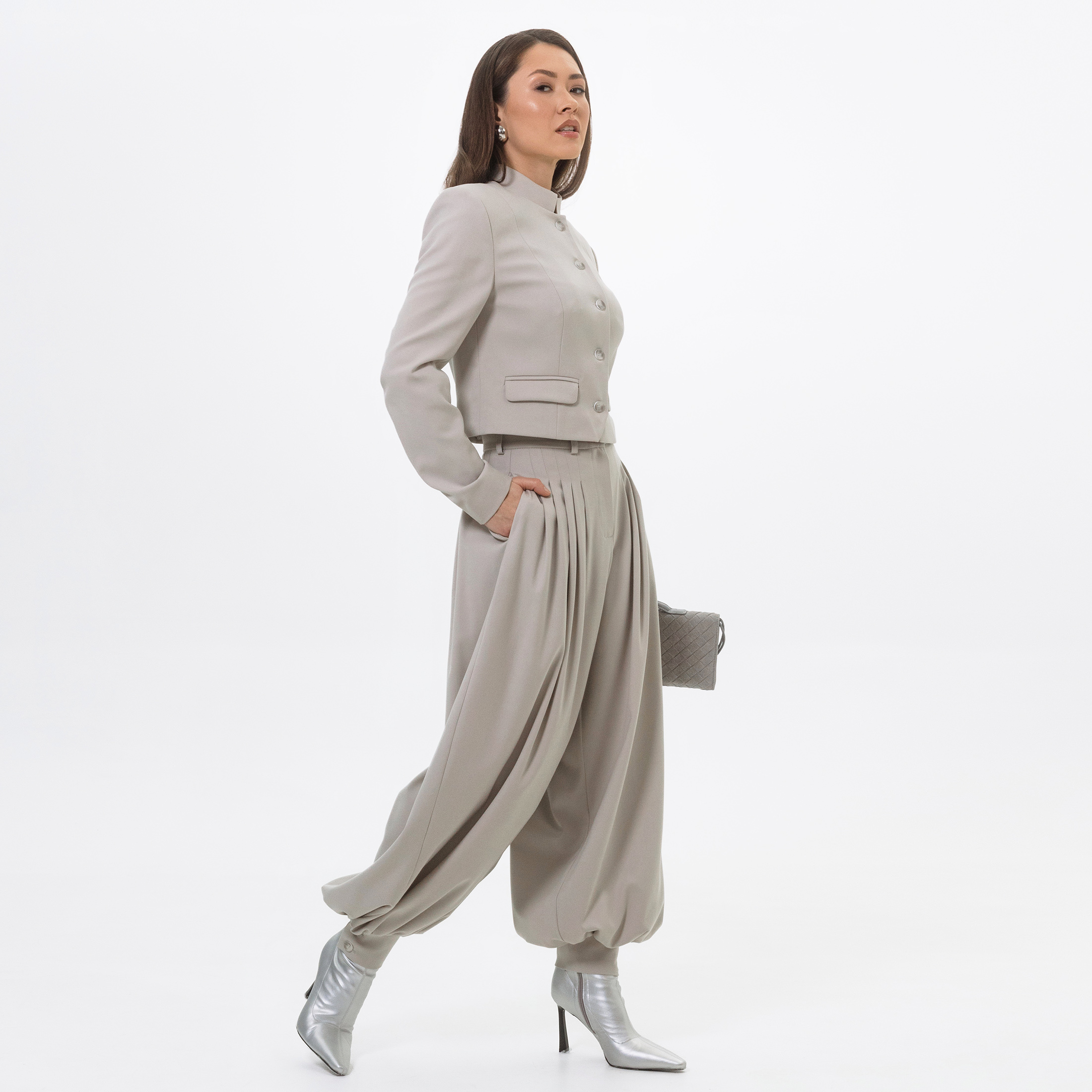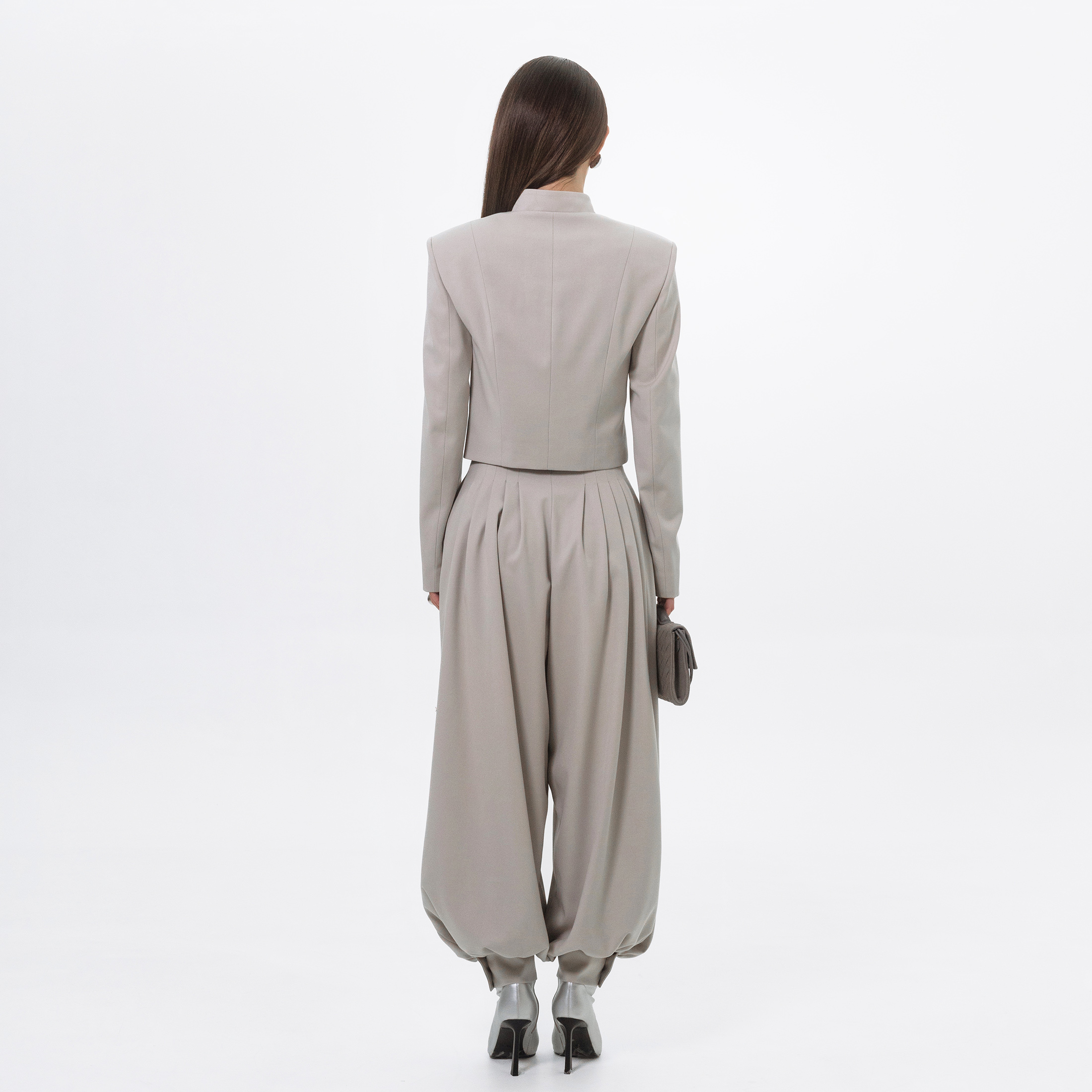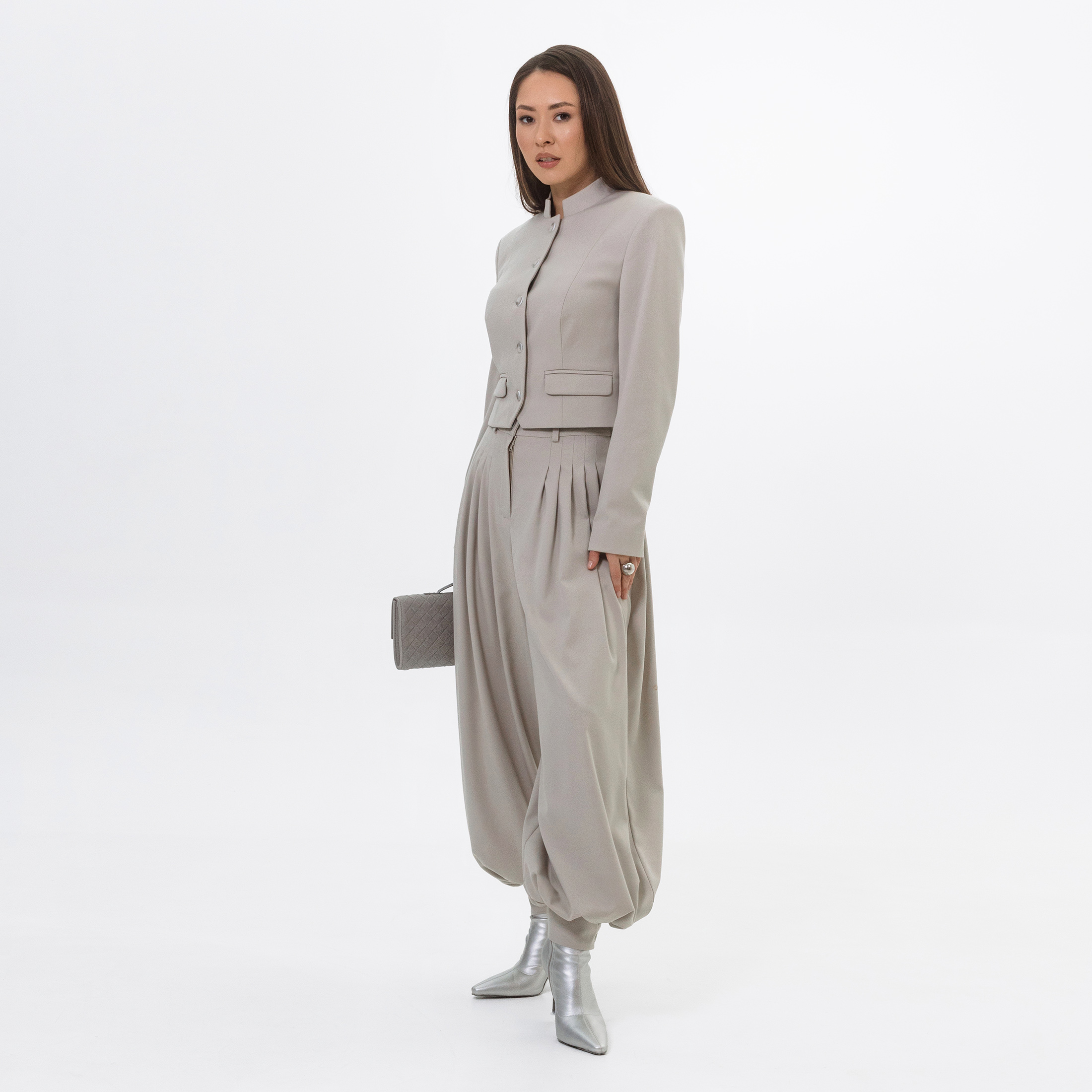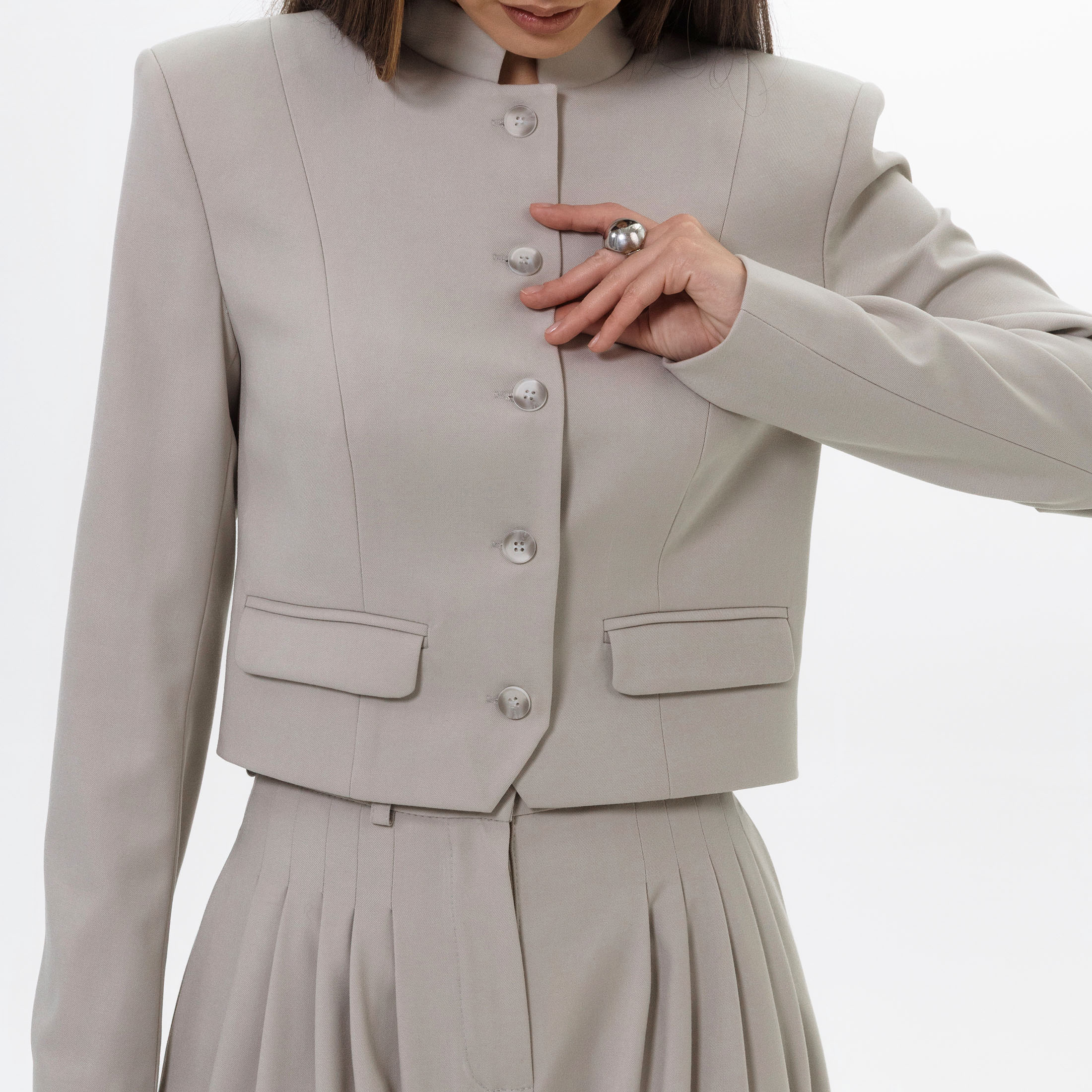 Однобортный жакет прямого силуэта, среднего объема, длиной чуть ниже линии талии. На полочках – прямые рельефы, выходящие из плечевого шва, и прорезные карманы в рамку с клапаном. По спинке – средний шов и рельефы, выходящие из плечевого шва. Застежка на пять петель и пуговиц. Нижний край борта скошен под углом. Воротник – стойка, высотой 4,0 см. Рукав втачной, длинный, состоящий из двух деталей. Жакет на притачной подкладке.