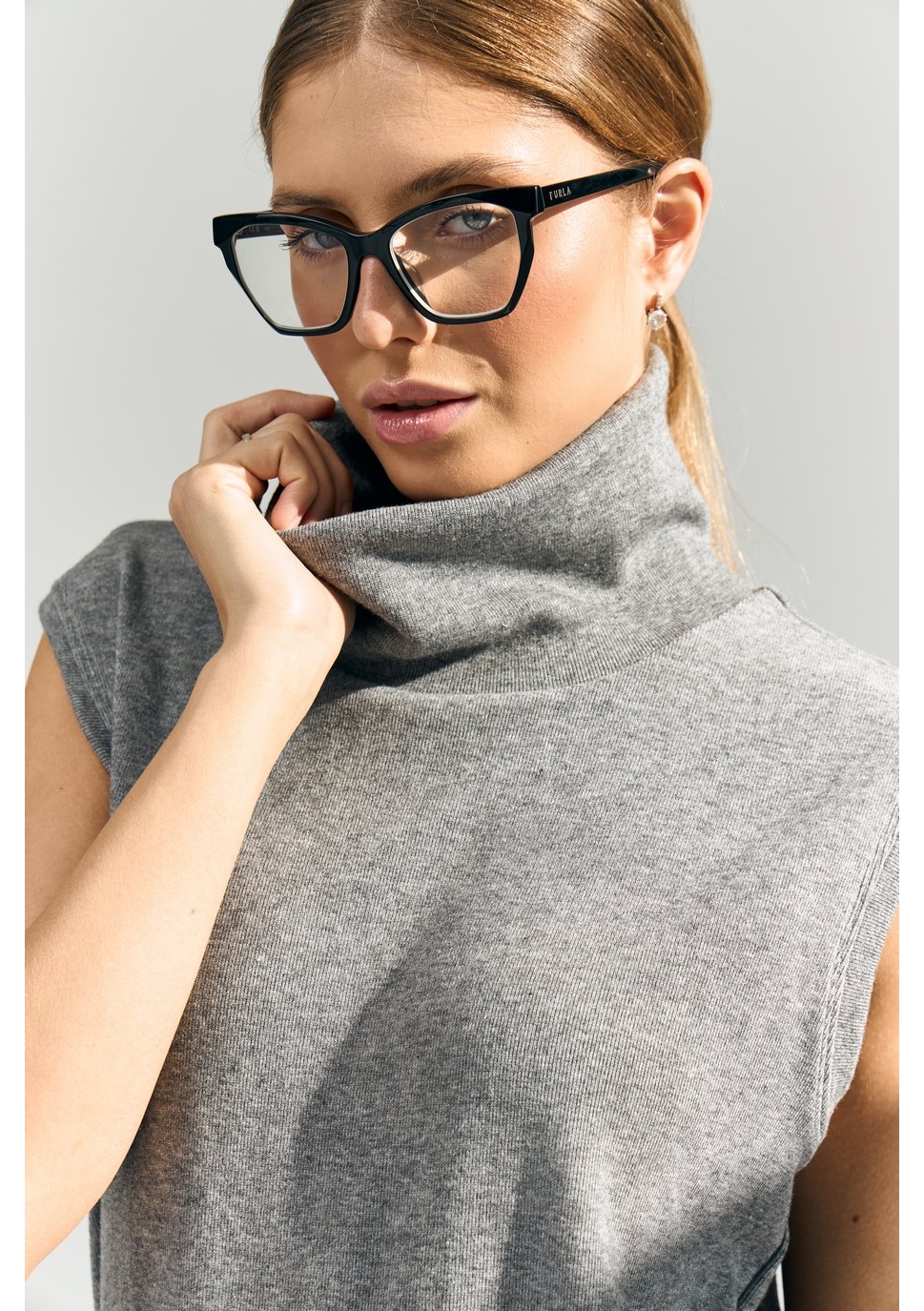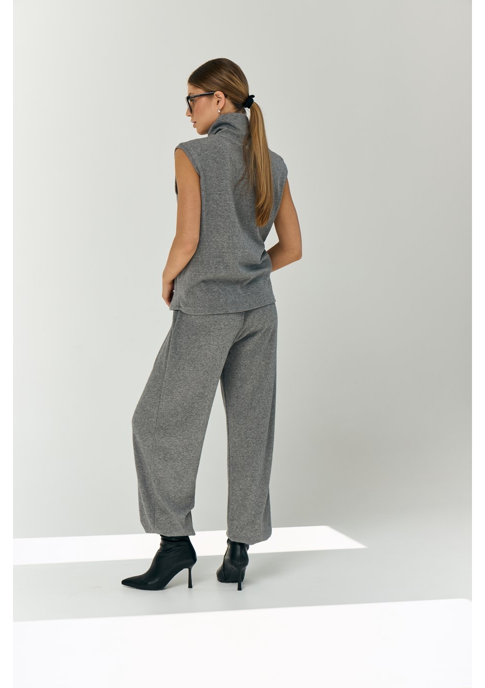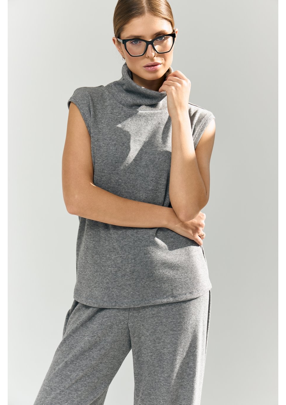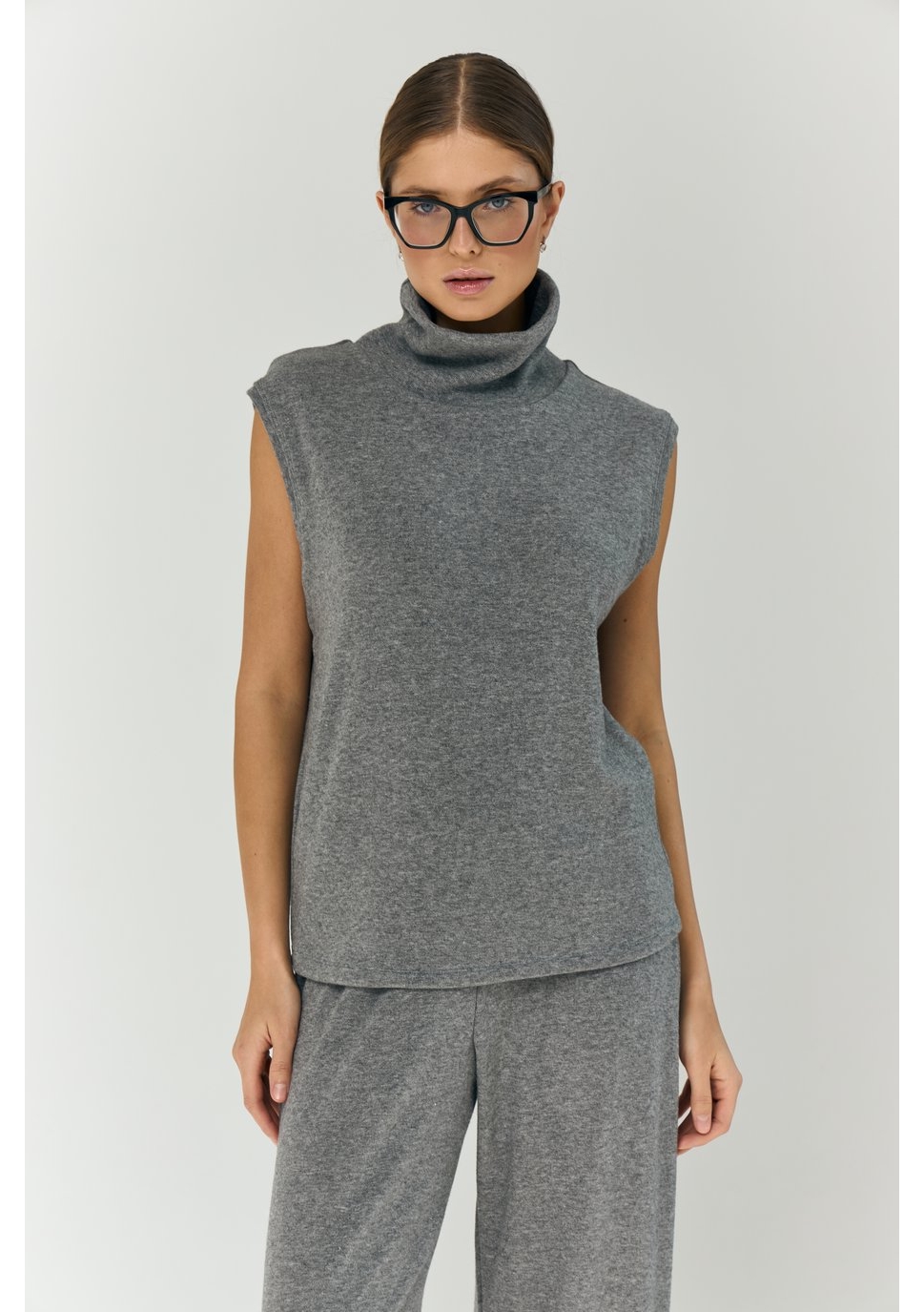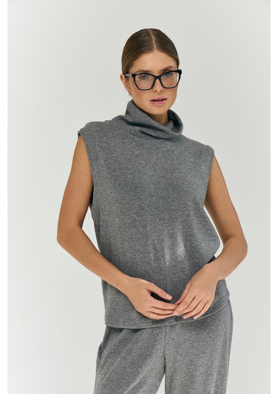 Жилетка умеренного объёма, свободного силуэта, длиной выше линии бедра. Воротник-стойка со сгибом по верхнему краю, высокий. Пройма обрабатывается обтачкой из основного материала.