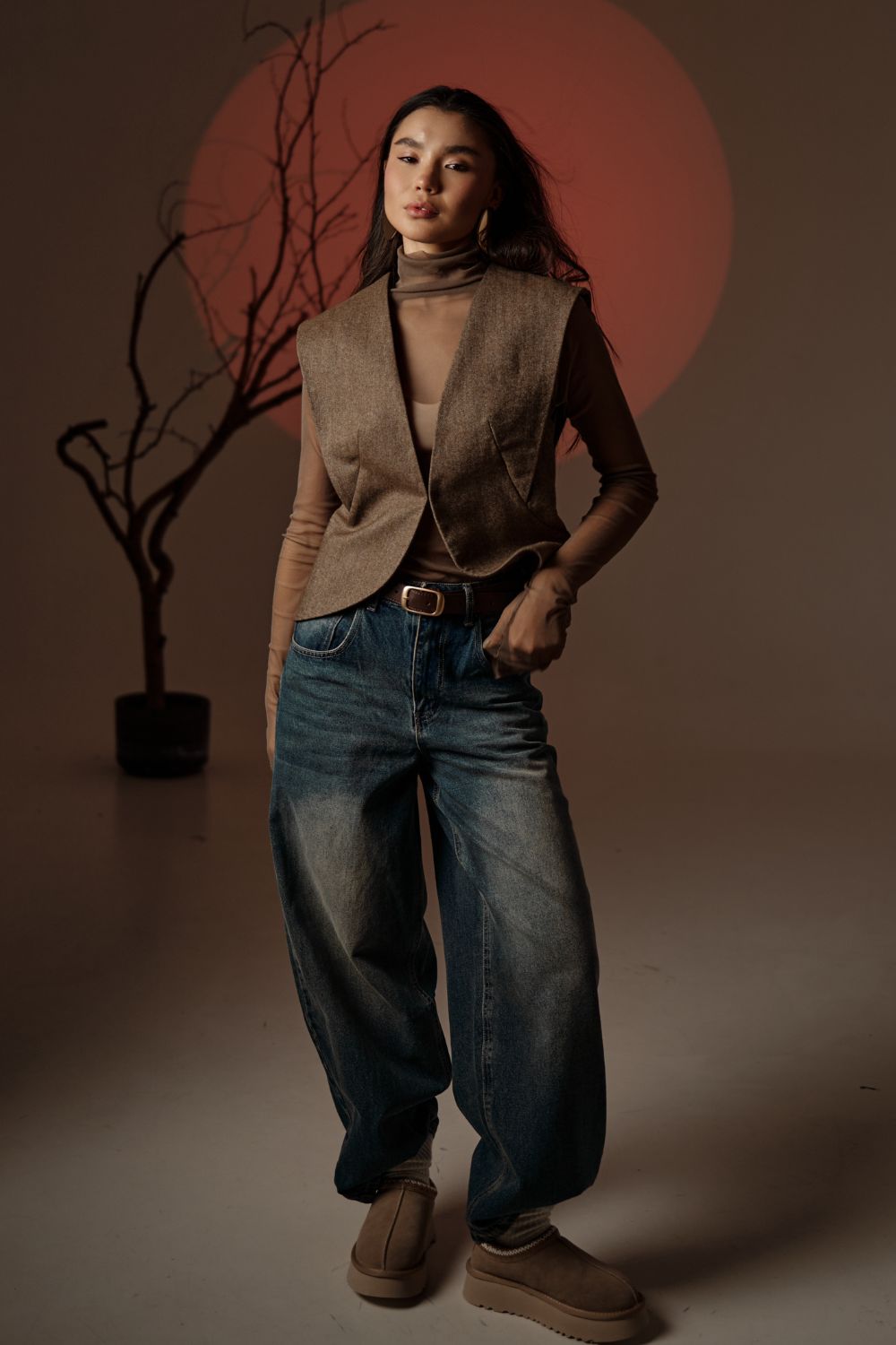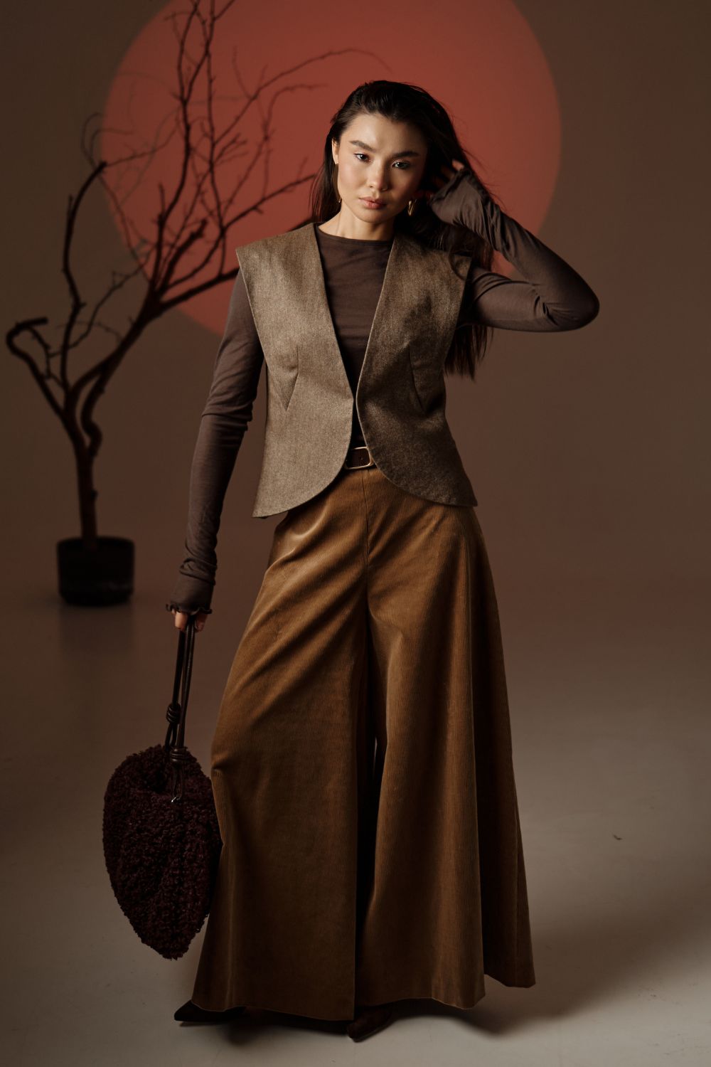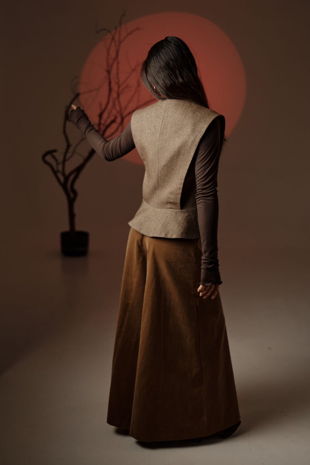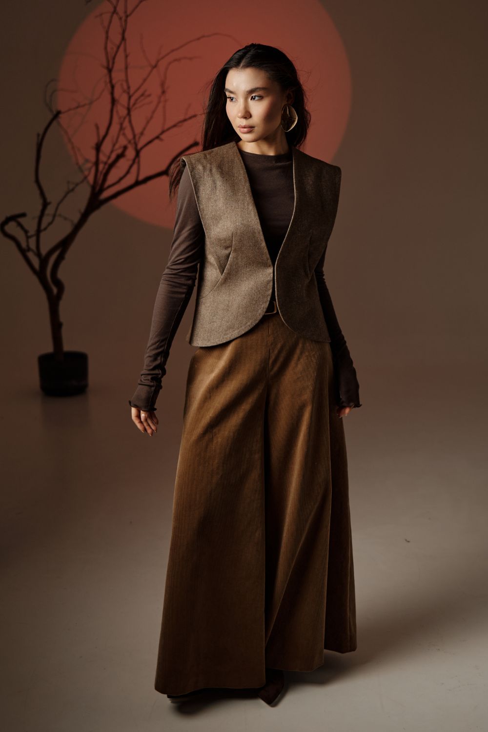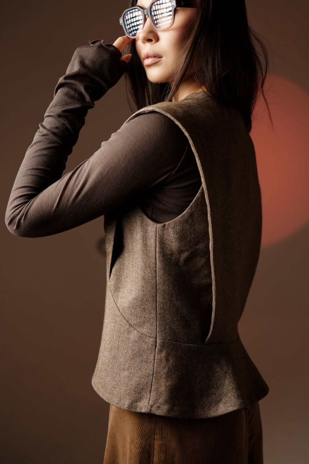 Выкройка женского жилета небольшого объёма с отрезной баской по спинке. Полочки с нагрудными вытачками, переходящими в шов баски и рельефными швами. Спинка со средним швом и рельефными швами. Конструкция плеч напоминает традиционный японский катагину — безрукавку с широкими плечами (элемент самурайского костюма).
