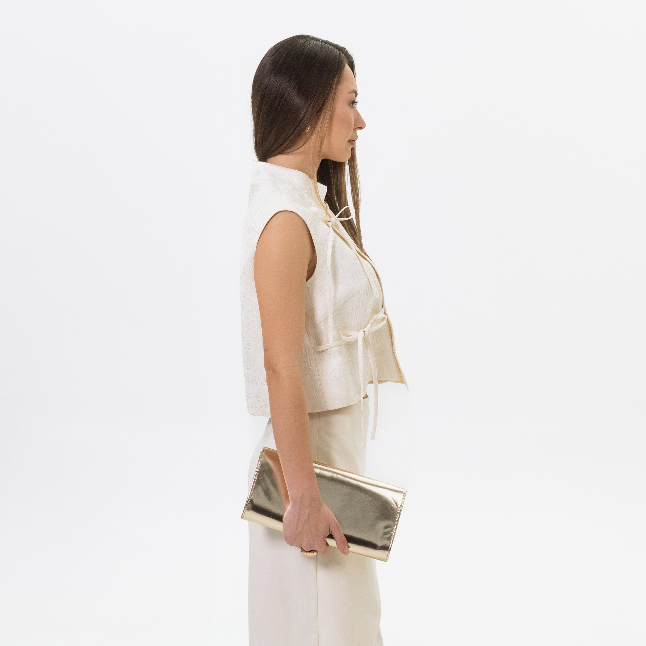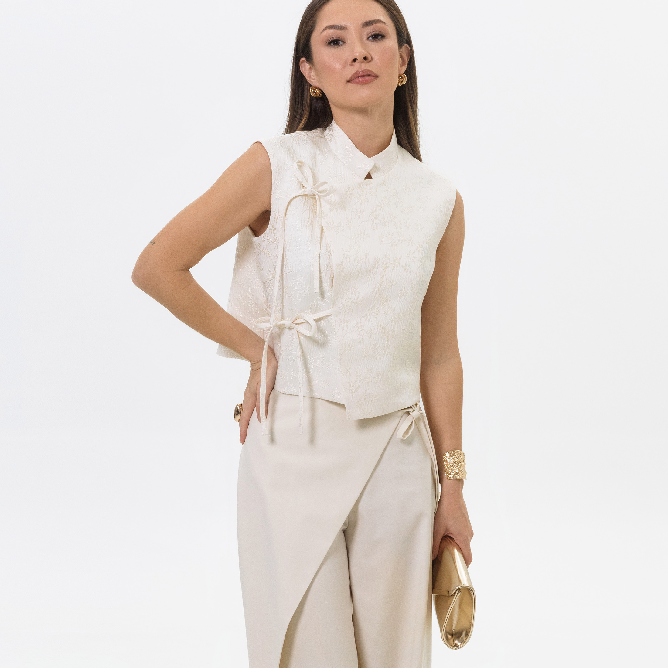 Жилет на запах прямого силуэта, умеренного объема, длиной ниже линии талии. На полочке – нагрудные вытачки. Застежка на запах на обтачные завязки в два ряда. На спинке – плечевые вытачки. Воротник – обтачная стойка, высотой 4 см. Жилет на притачной подкладке.
