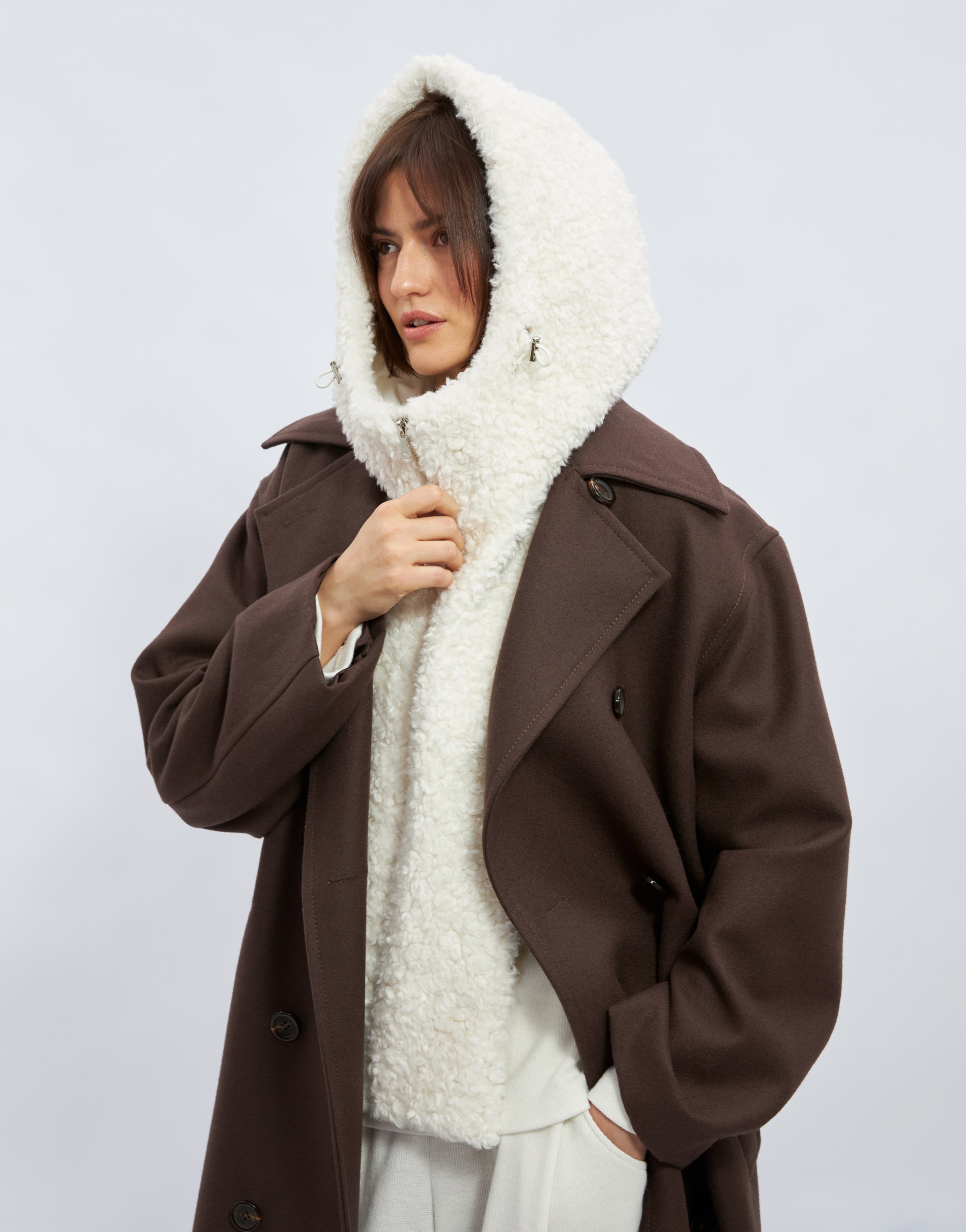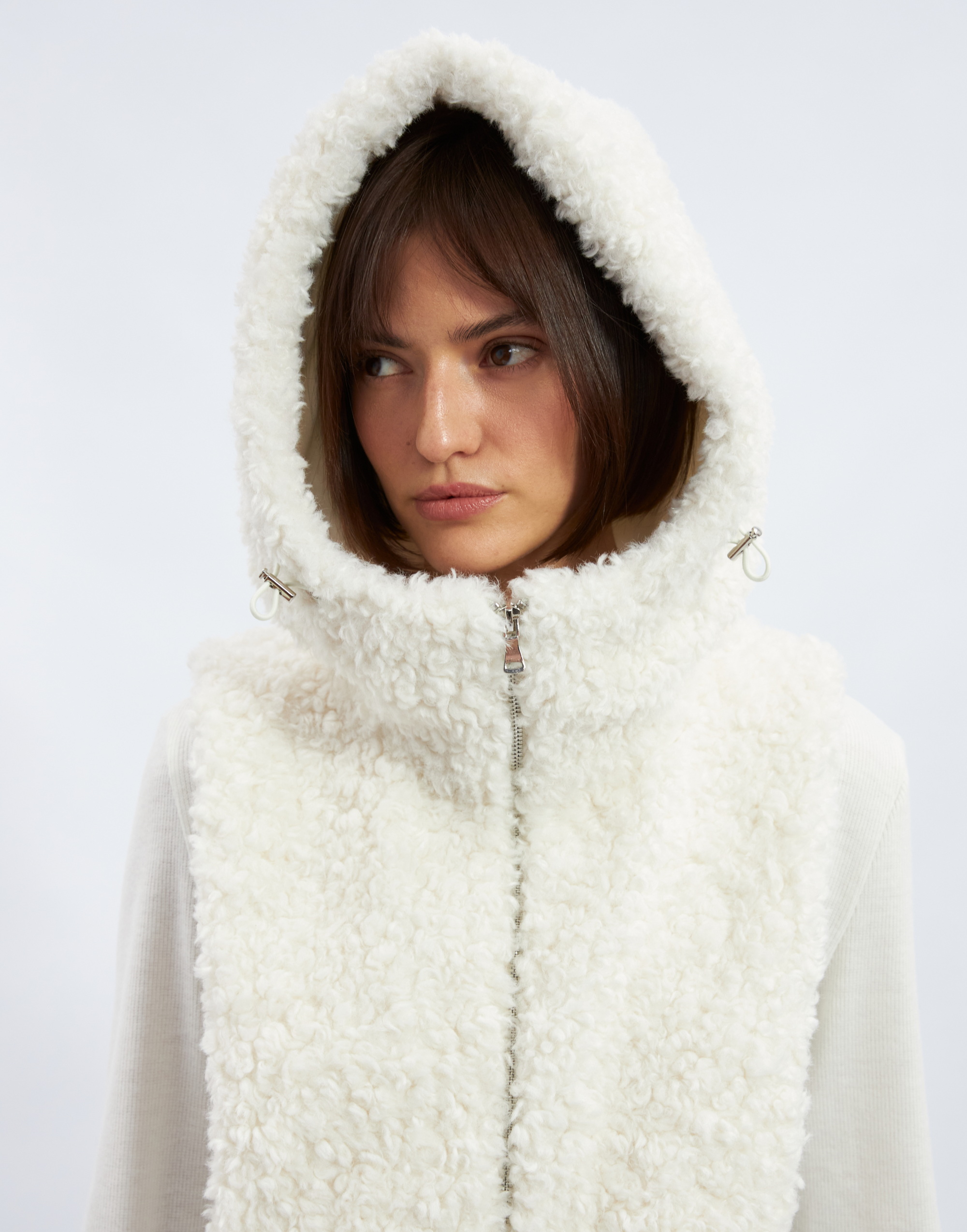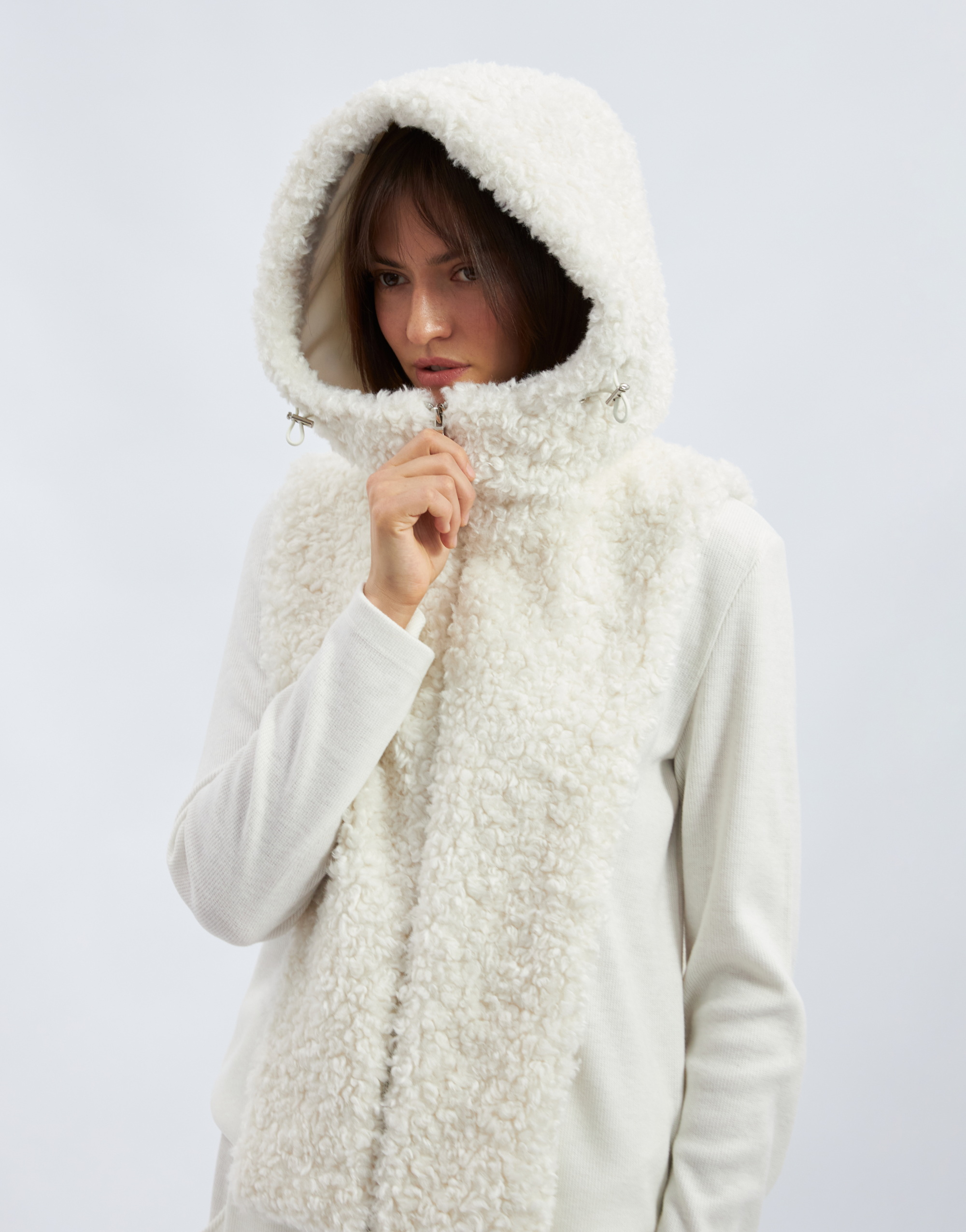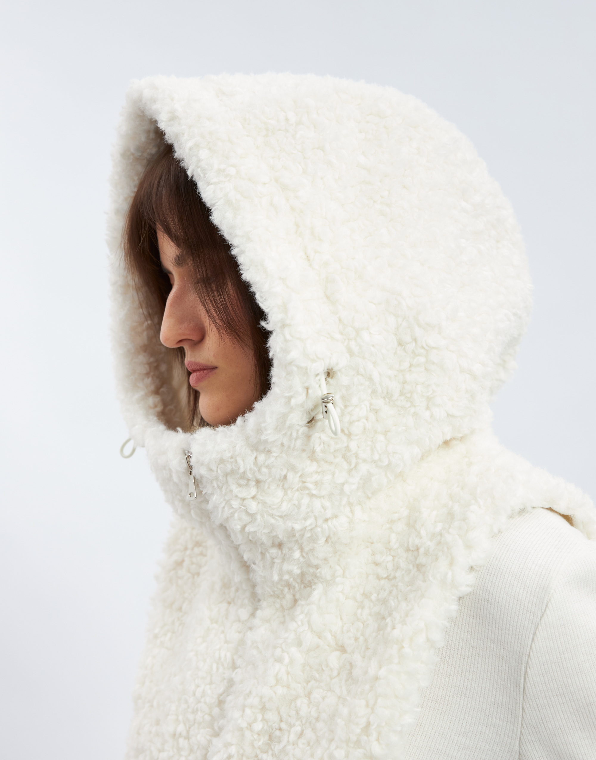 Капюшон с манишкой, на подкладке. Капюшон умеренного объёма с цельнокроеной стойкой и центральной частью. В переднем срезе капюшона спроектирована кулиска с регулировкой прилегания с помощью шнура, выведенного на лицевую сторону через люверсы. Длина манишки ниже уровня линии талии. Застежка на тесьму-молнию по центру переда и в переднем срезе капюшона.