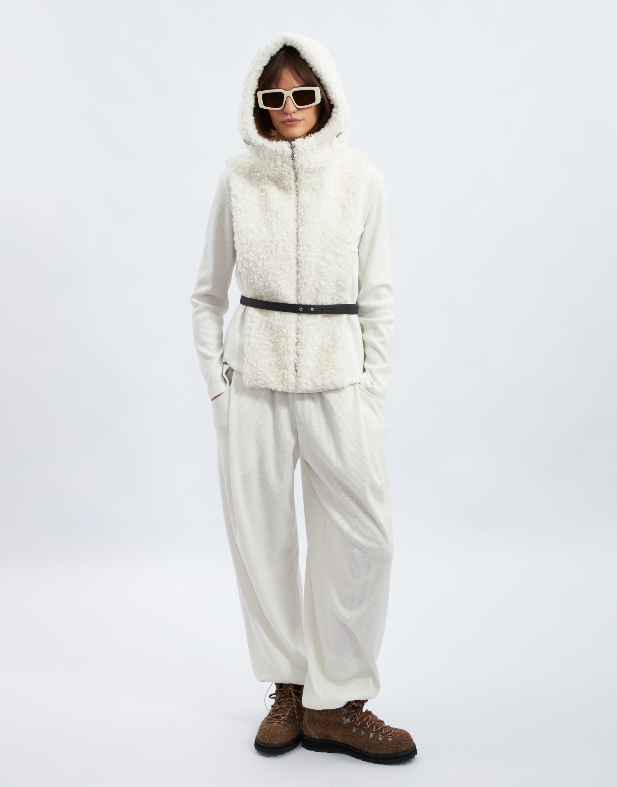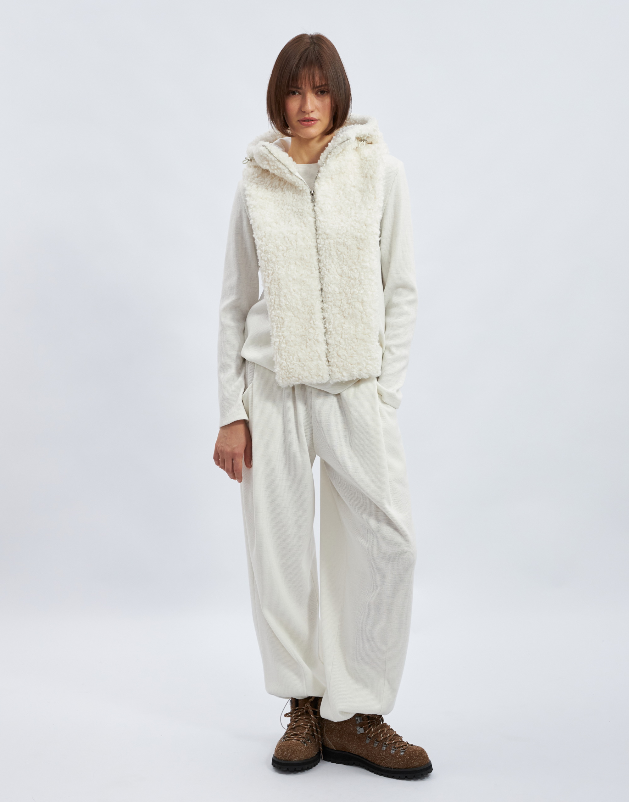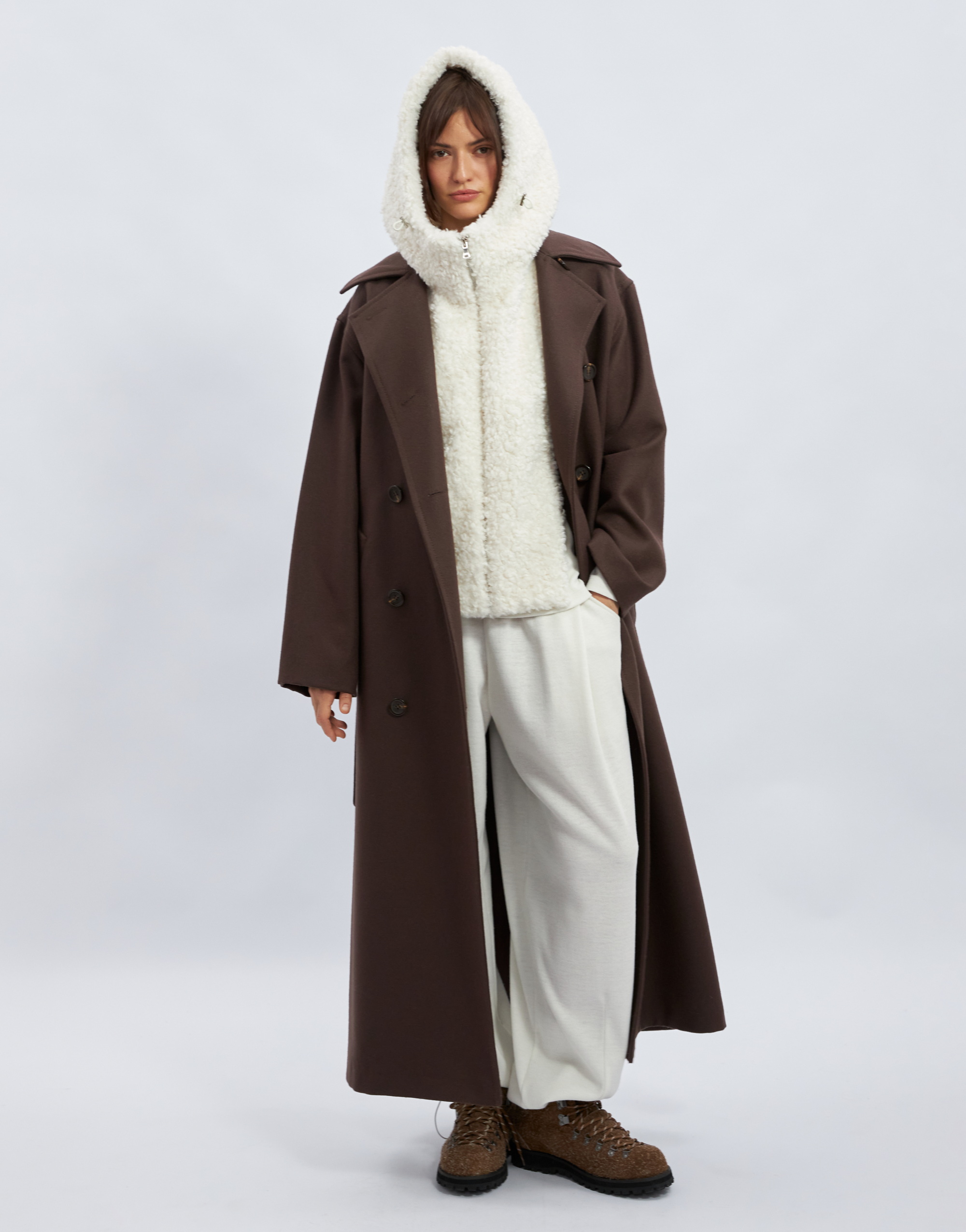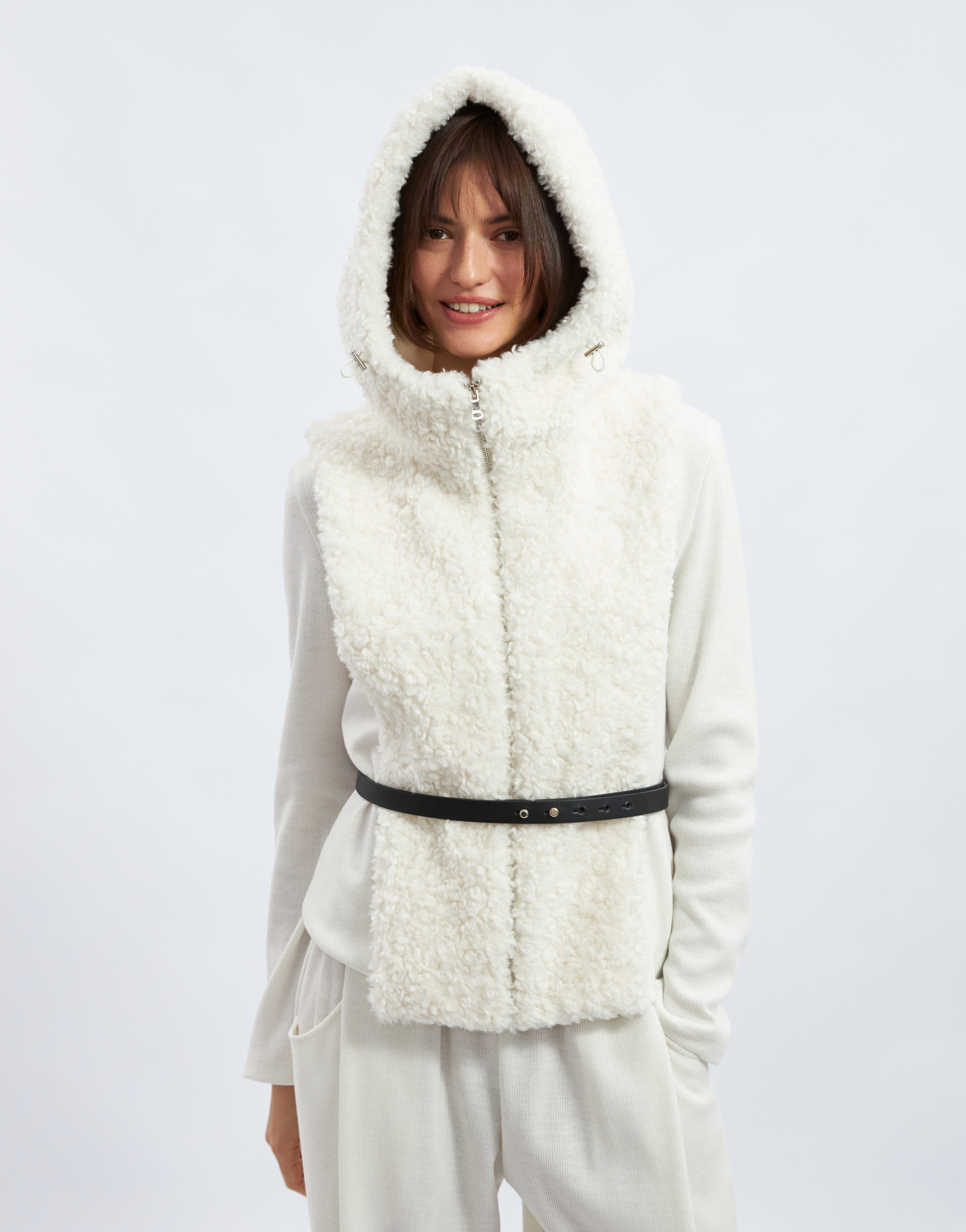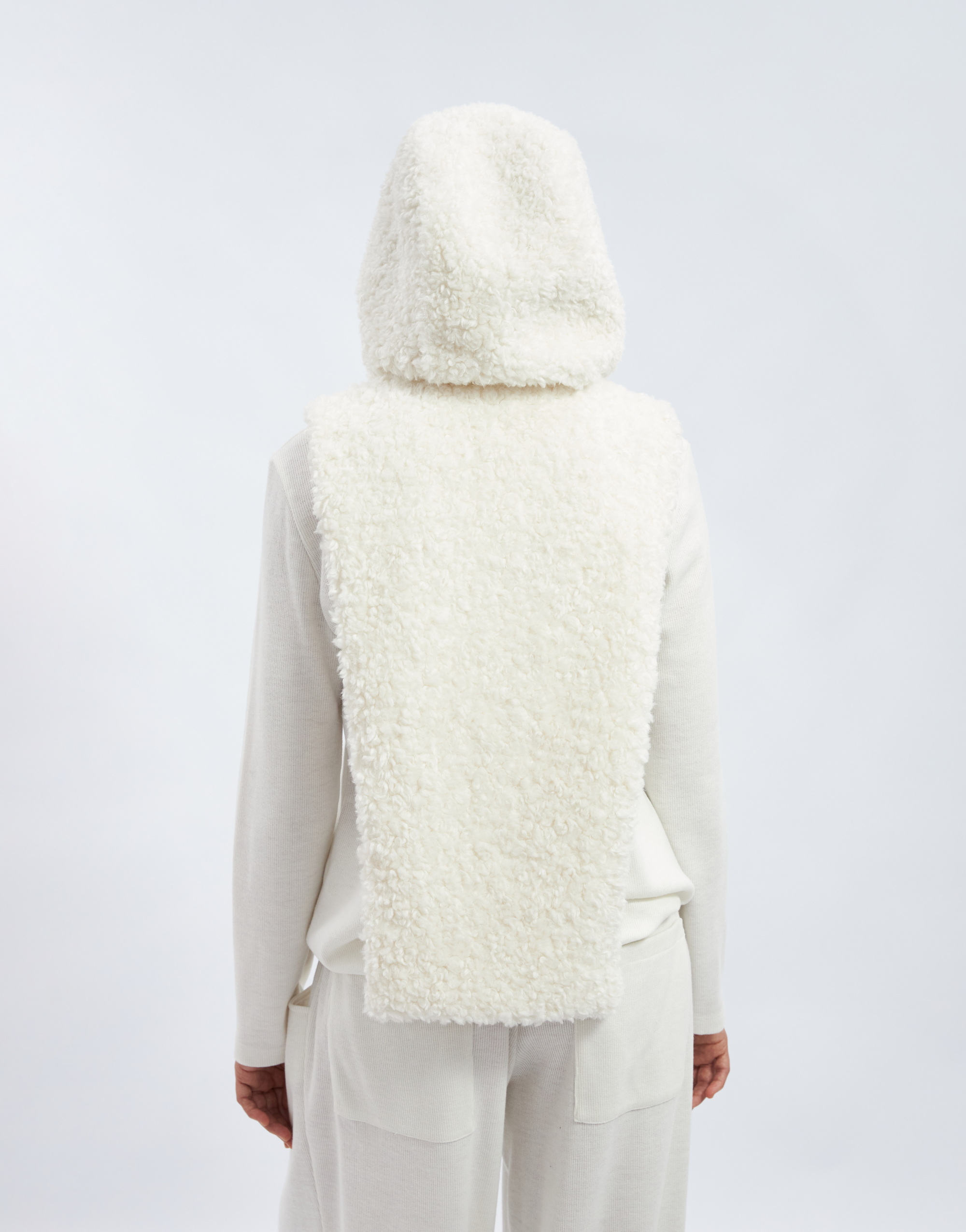 Капюшон с манишкой, на подкладке. Капюшон умеренного объёма с цельнокроеной стойкой и центральной частью. В переднем срезе капюшона спроектирована кулиска с регулировкой прилегания с помощью шнура, выведенного на лицевую сторону через люверсы. Длина манишки ниже уровня линии талии. Застежка на тесьму-молнию по центру переда и в переднем срезе капюшона.