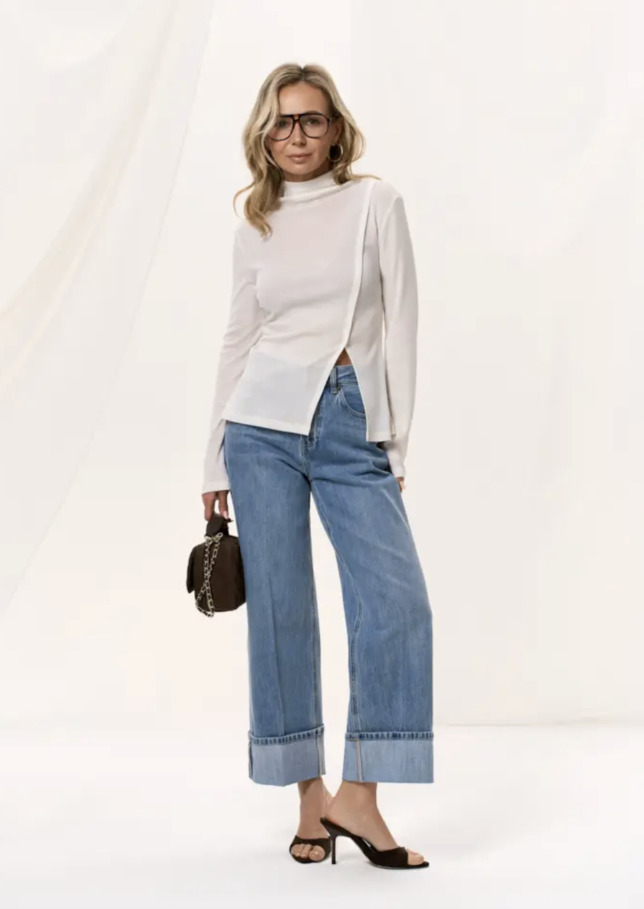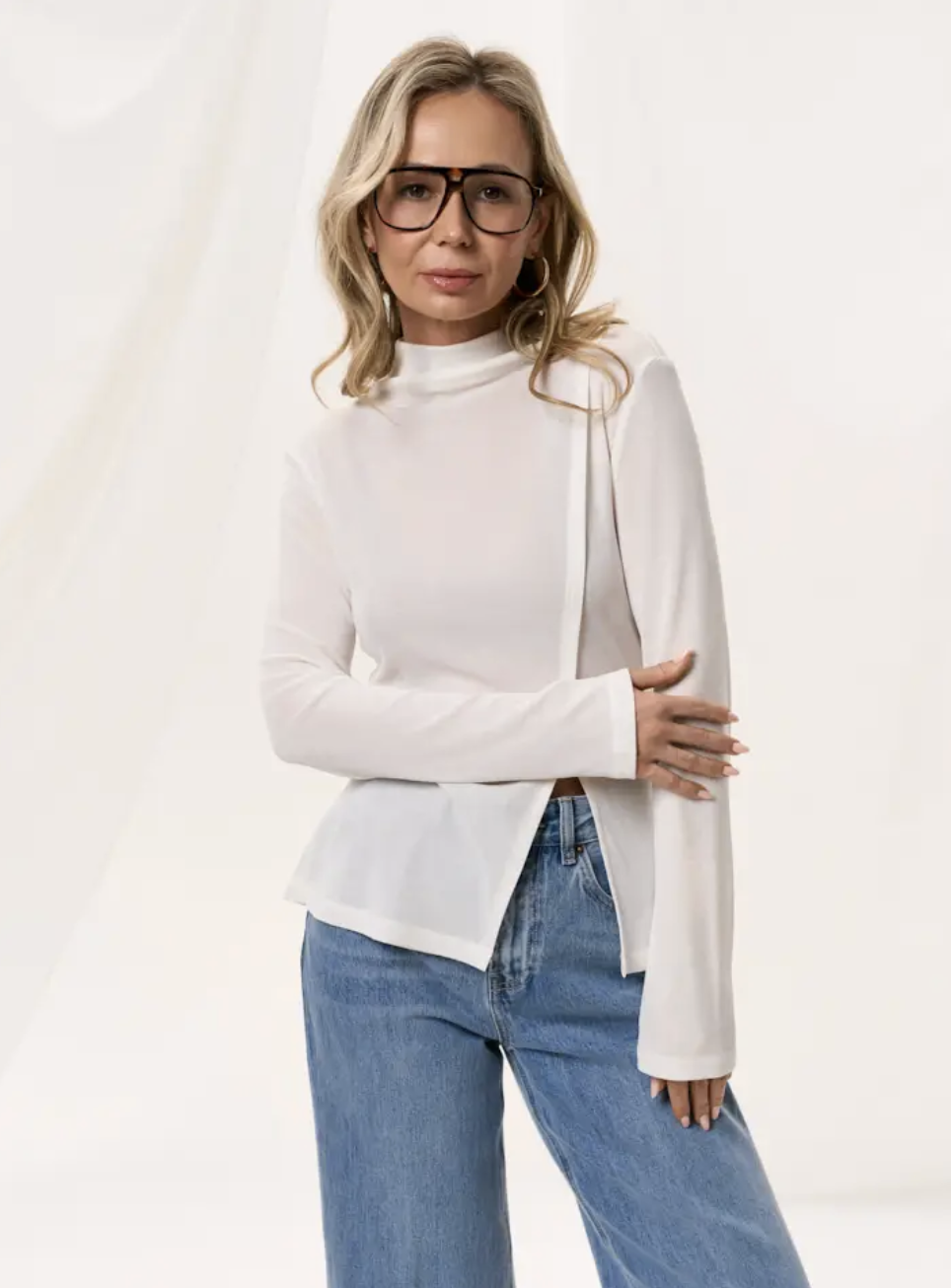 Перед ассиметричного кроя, рельеф, расположенный с правой стороны лонгслива, выходит из правого плечевого шва, стачан до линии талии, далее образуется разрез до линии низа. По рельефу выполнена складка, имитирующая планку. Горловина с цельнокроеной стойкой. Рукава втачные, длинные.