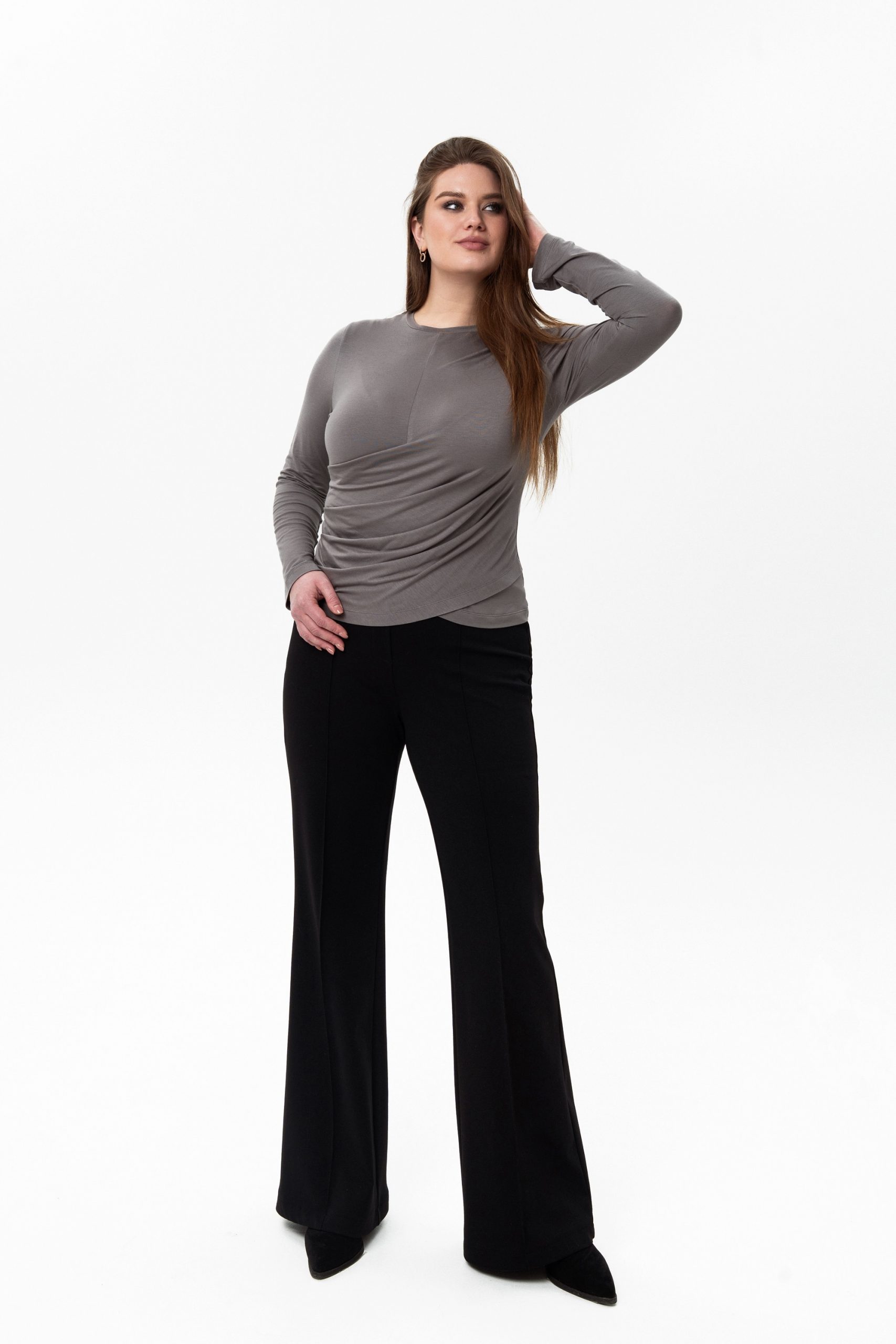 Лонгслив малого объёма, приталенного силуэта. По центру переда расположен шов, доходящий до линии груди и уходящий в подрез и в боковой шов. С правой стороны переда в боковом шве выполнена драпировка складками. Низ лонгслива фигурный. Вырез горловины округлой формы, обработан притачной обтачкой. Длинный втачной рукав. Изделие и рукава по низу обработаны на плоскошовной машине (можно заменить швом двойной иглой).