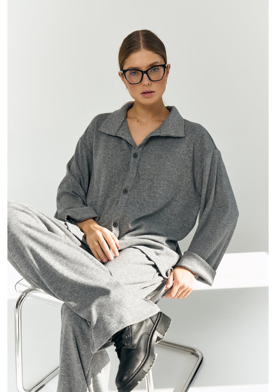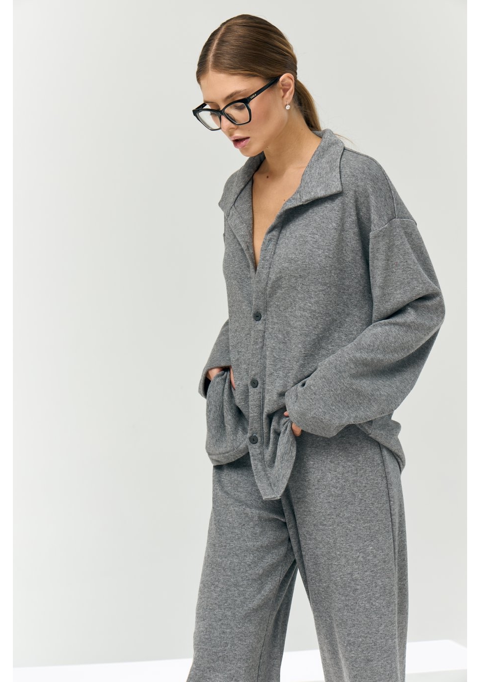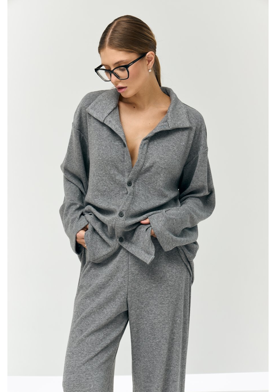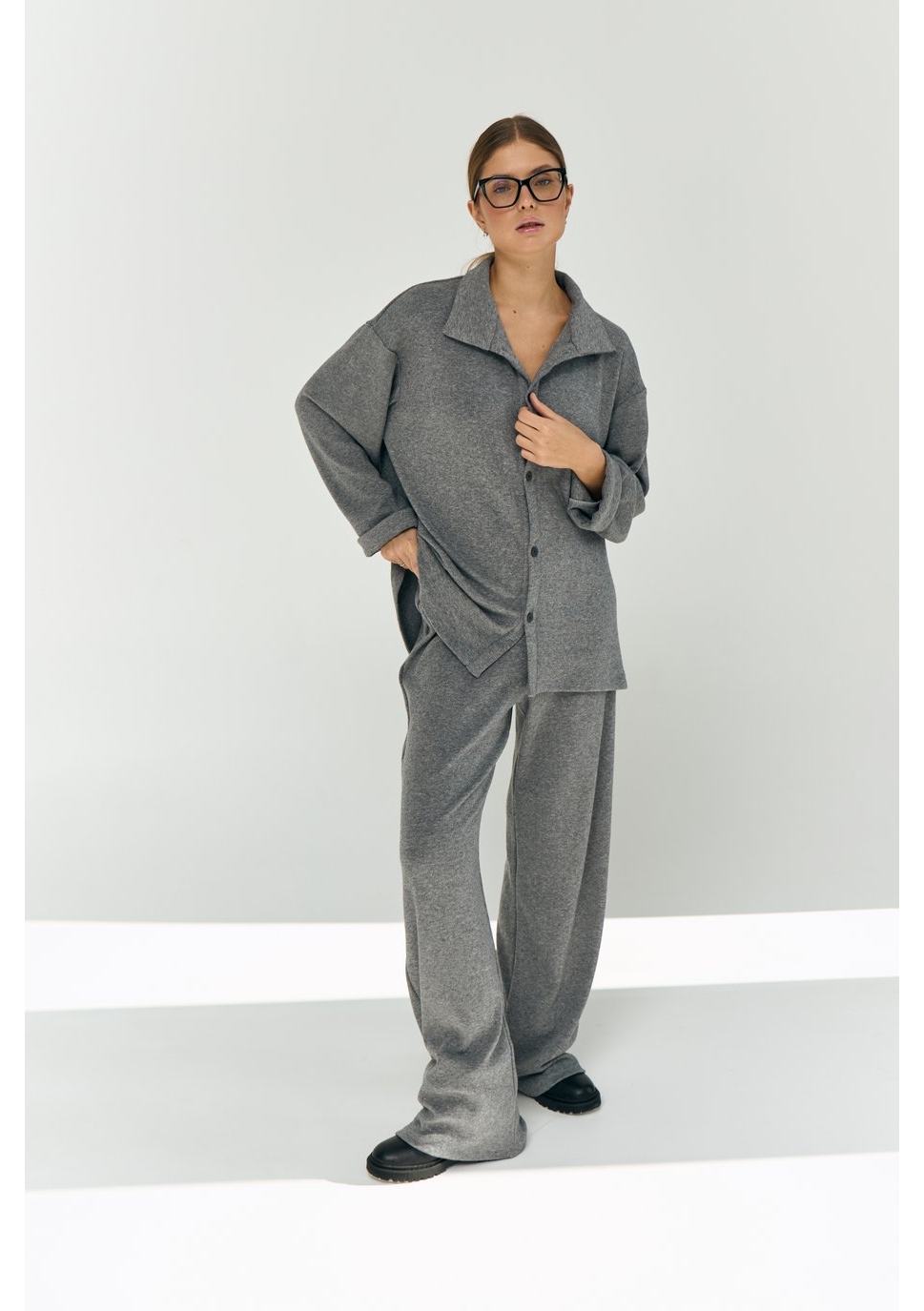 Рубашка свободного силуэта, большого объёма, длиной чуть выше середины бедра. Центральная застёжка на 5 пуговиц и 5 прорезных петель. Воротник отложной. Рукава рубашечные, длинные.