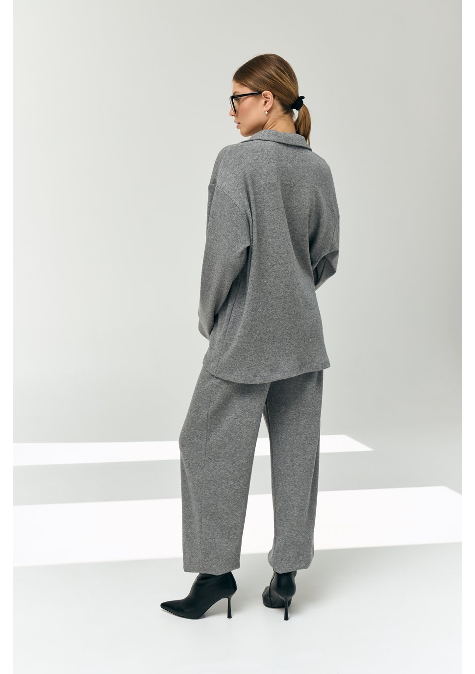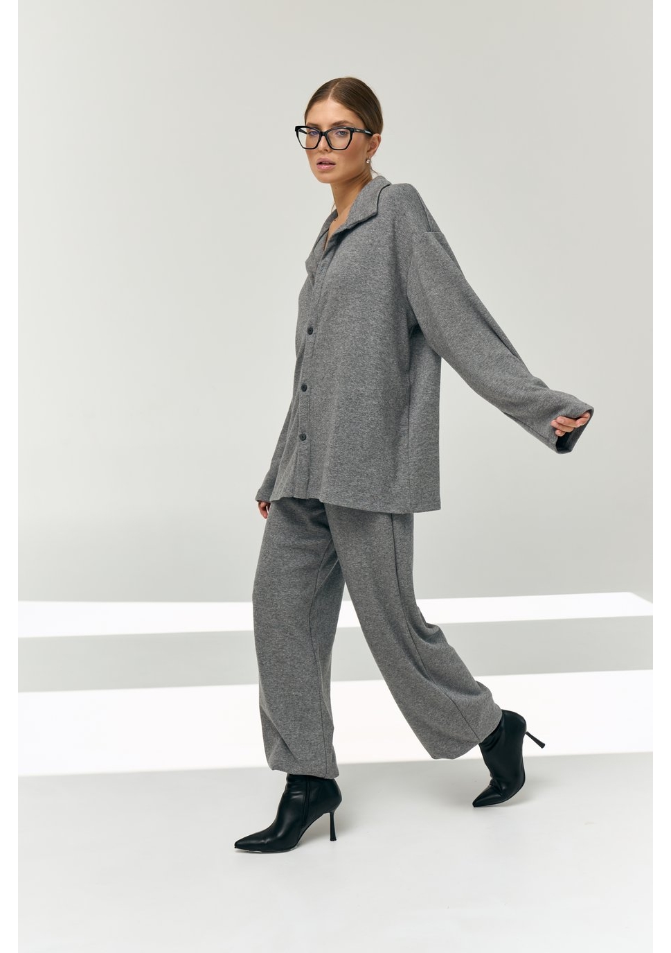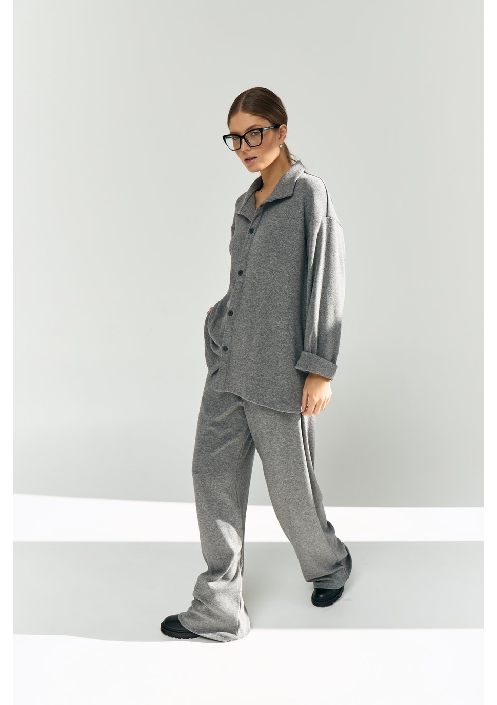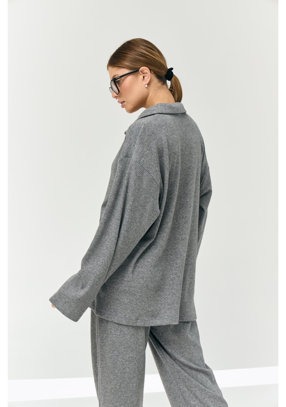 Рубашка свободного силуэта, большого объёма, длиной чуть выше середины бедра. Центральная застёжка на 5 пуговиц и 5 прорезных петель. Воротник отложной. Рукава рубашечные, длинные.
