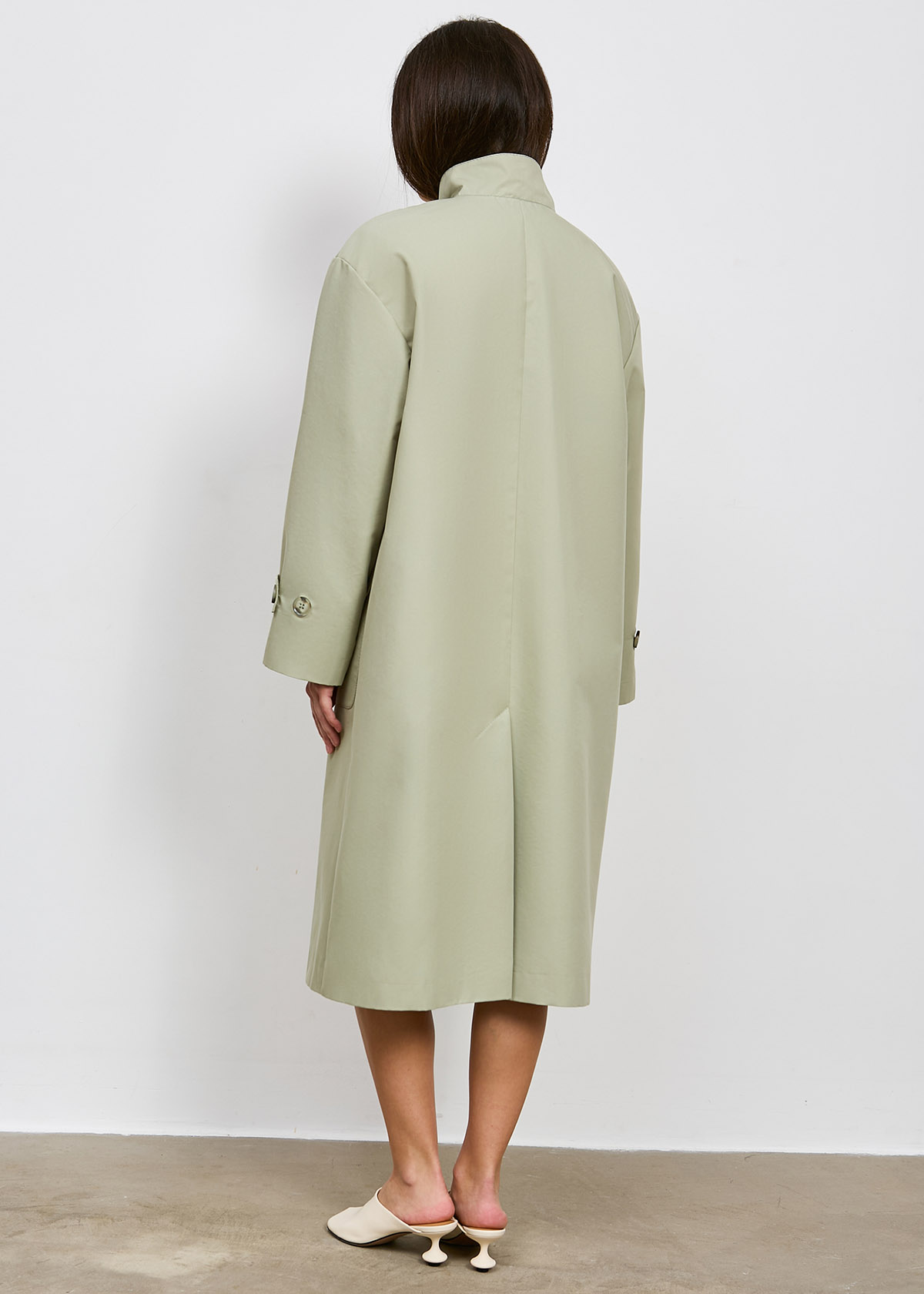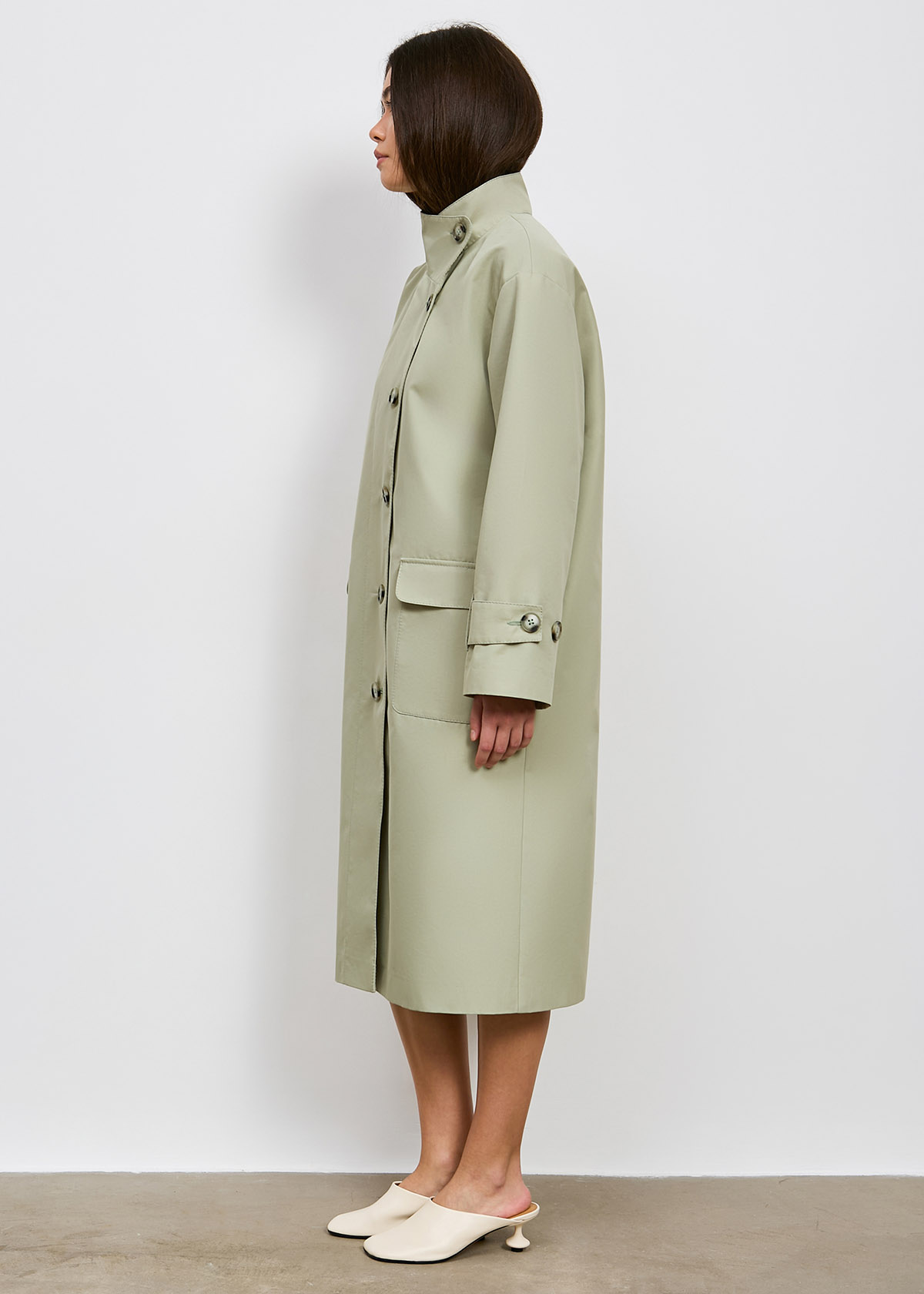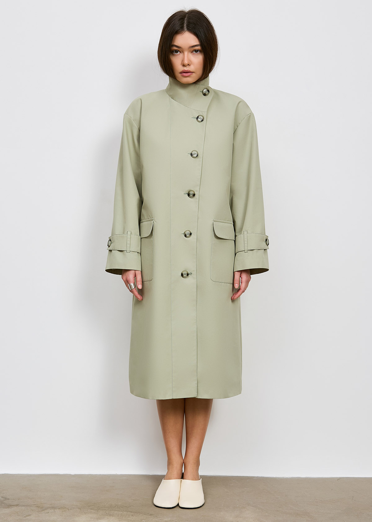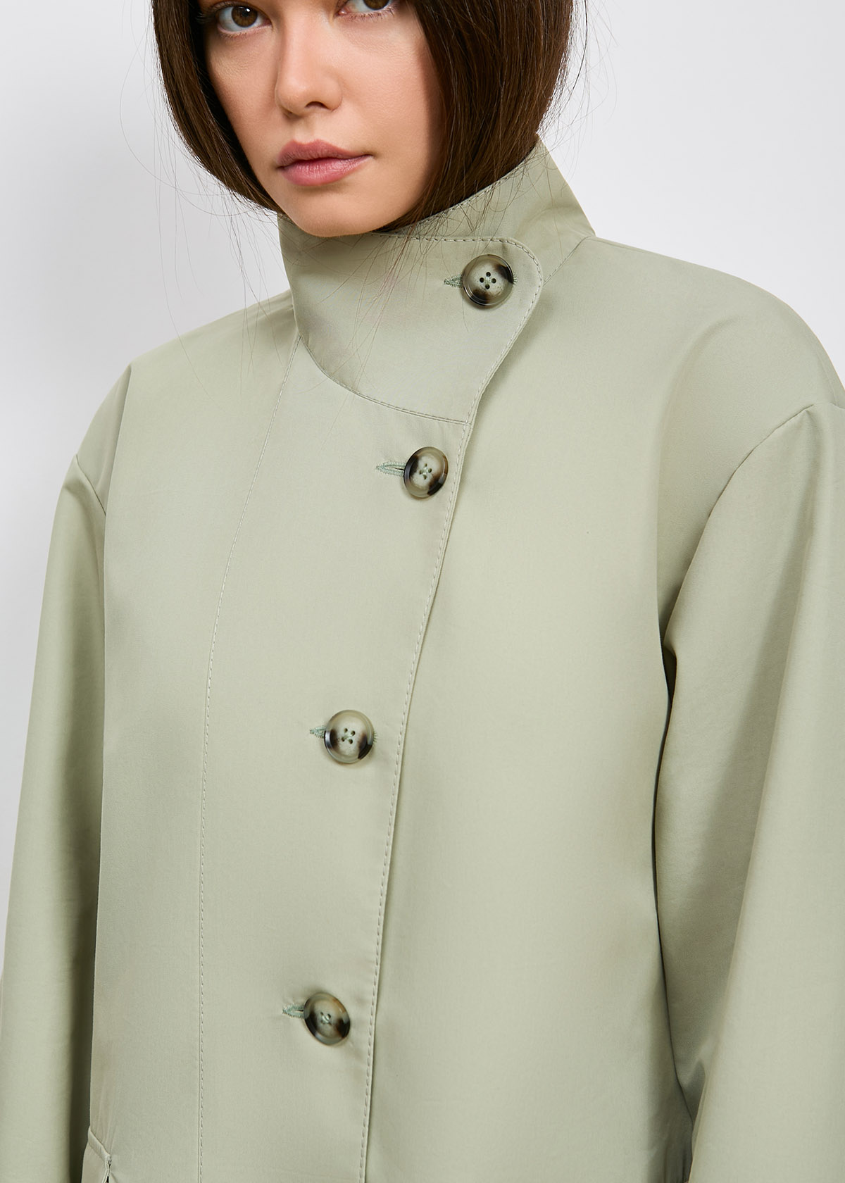 Тренч однобортный, среднего объема, прямого силуэта умеренно расширенного к низу, длиной ниже колена, со спущенной линией плеча, с ассиметричной застежкой на 6 прорезных петель и пуговиц.