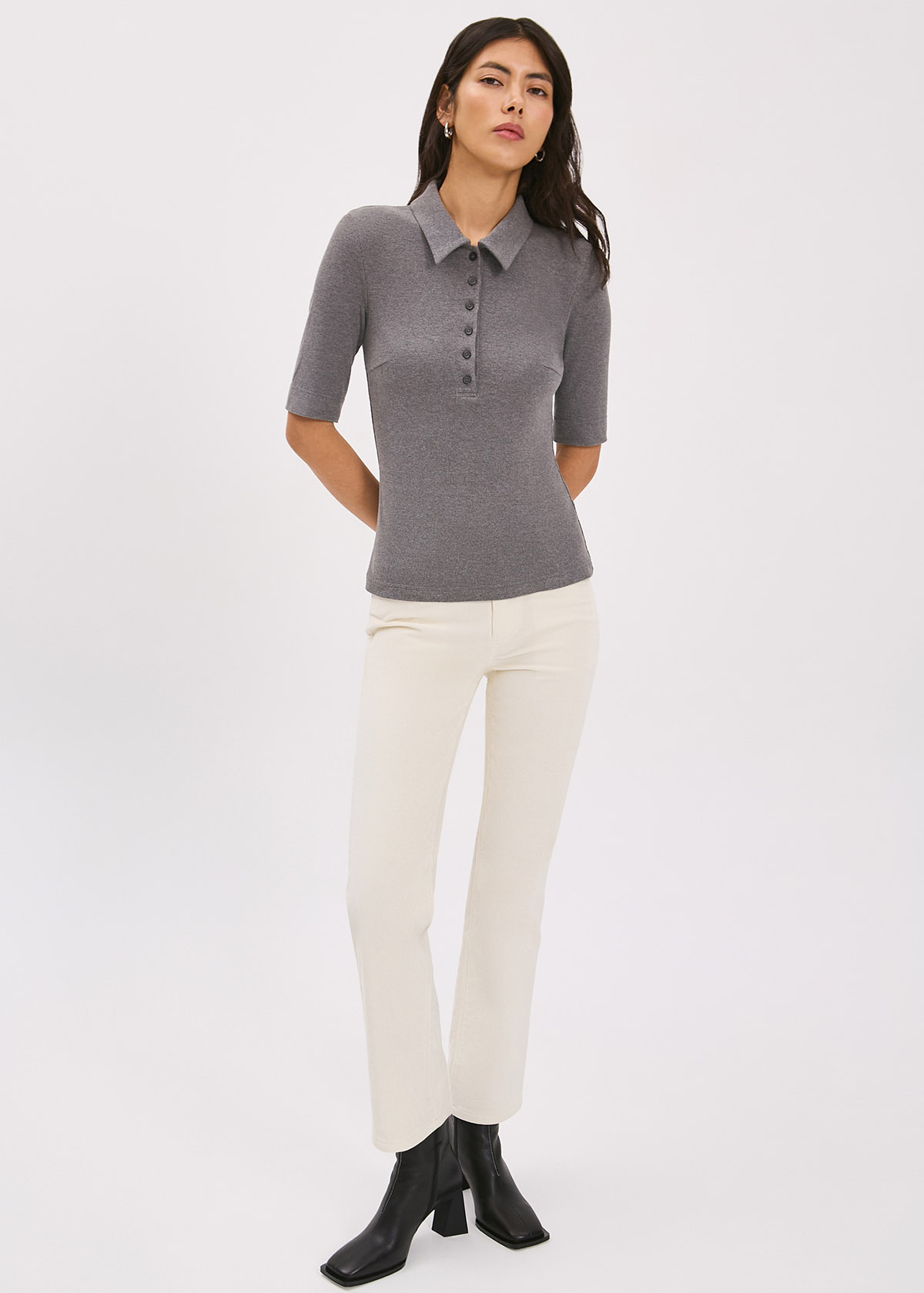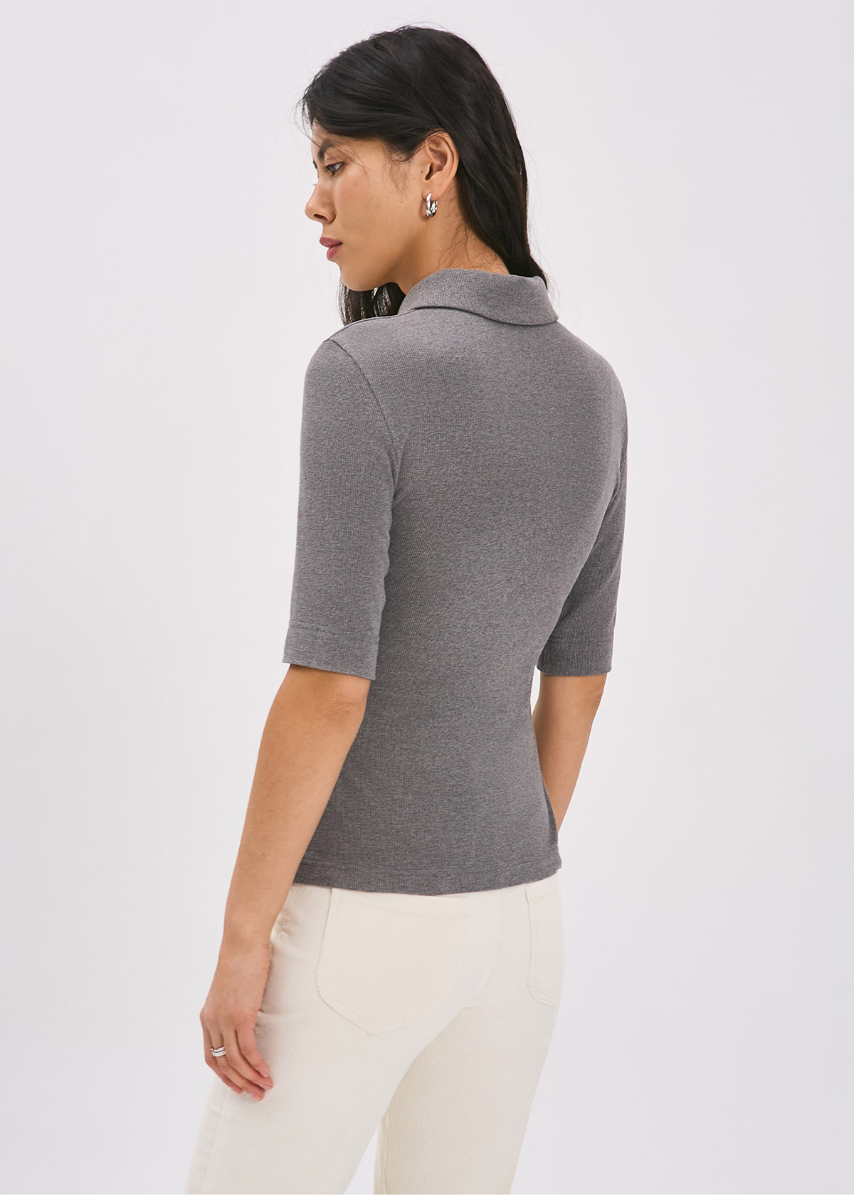 Футболка прилегающего силуэта с втачным рукавом. Застежка-поло на прорезные петли и пуговицы.