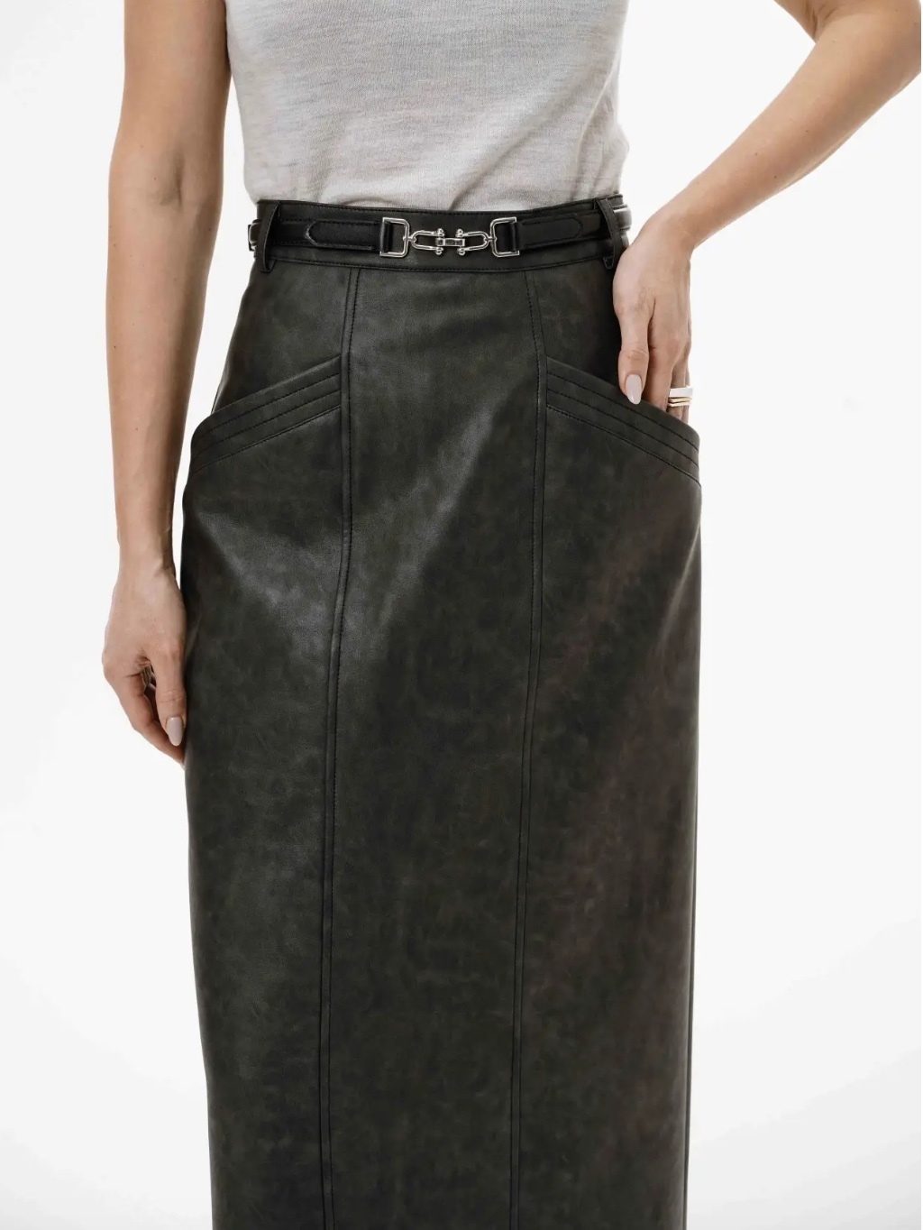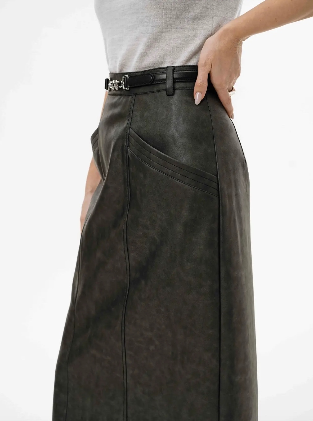 Перед с вертикальными рельефами, на боковых деталях переда оформлен отрезной наклонный карман с притачной листочкой. На задних деталях по две талиевые вытачки, по среднему шву спинки выполнена шлица. Пояс притачной со шлевками. Застежка на потайную тесьму молнию в среднем шве спинки.
