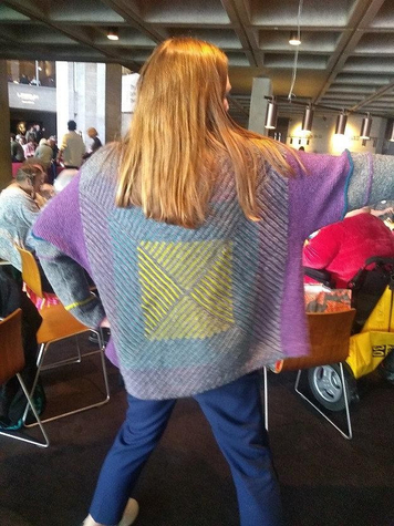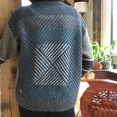 Передняя и задняя части состоят из одного большого квадрата. Каждый квадрат вяжется четырьмя секциями или треугольниками. Каждый треугольник вяжется отдельно, а затем следующий треугольник вяжется поверх предыдущего, поэтому сшивание не требуется. Кокетка и нижняя планка вяжутся по квадратам, кокетки соединяются вместе по плечам, а затем боковые части/рукава вяжутся от корпуса.