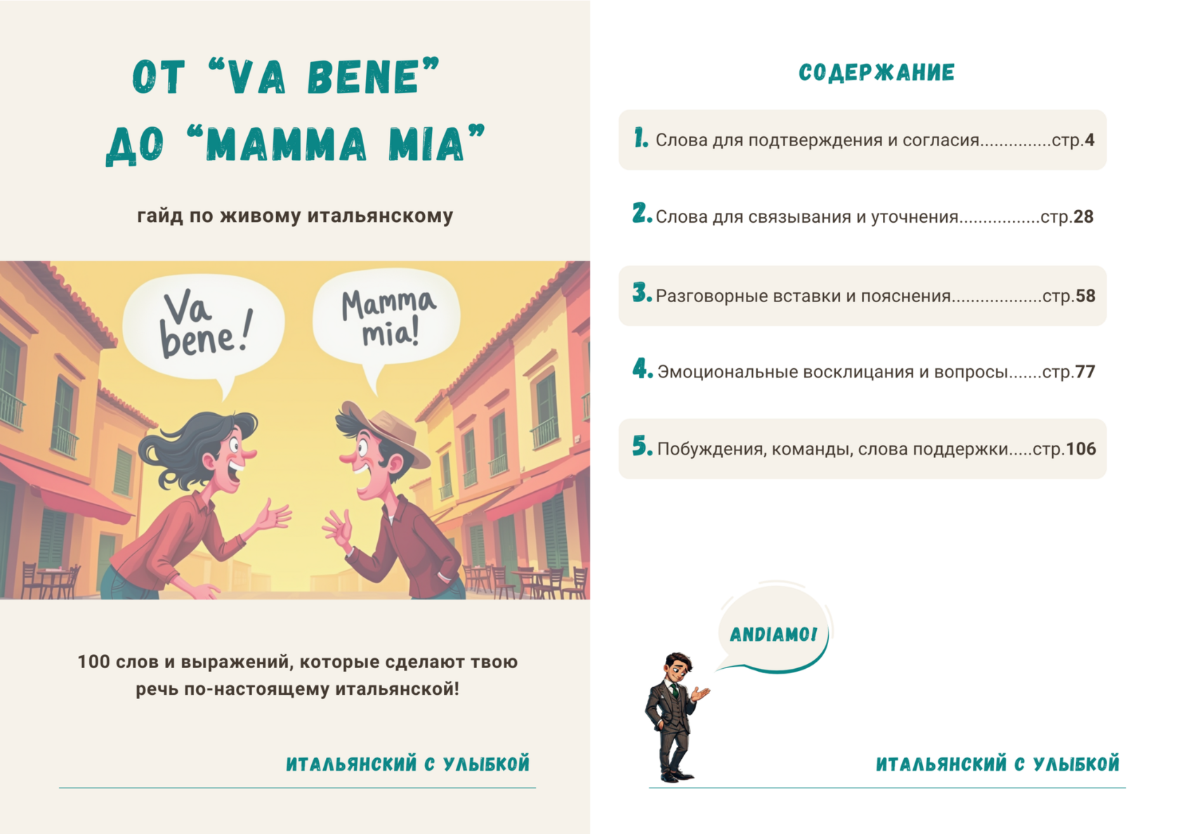 В гайде ты найдёшь более 100 разговорных слов и выражений, которые сделают твой итальянский живым!
