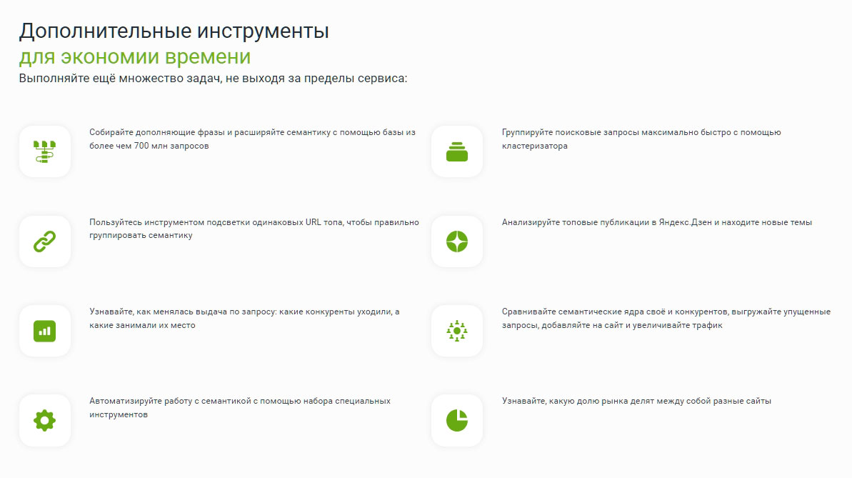 - Полезные инструменты: Дополняющие фразы, Подсветка топов, История выдачи SERP по запросу, Выделение уникальных слов, Комбинатор ключевых фраз, Сравнение списков и многое др.