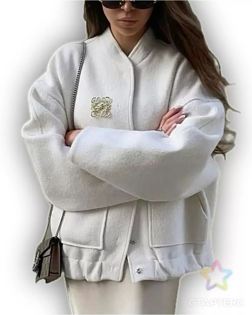 Бомбер оверсайз с воротником-стойка прямого силуэта на подкладке, с центральной застежкой на пять потайных кнопок, с притачным поясом на резинке. Перед с накладными карманами. Спинка цельная. Рукав втачной двухшовный с опущенной линией плеча. Низ обработан обтачкой.