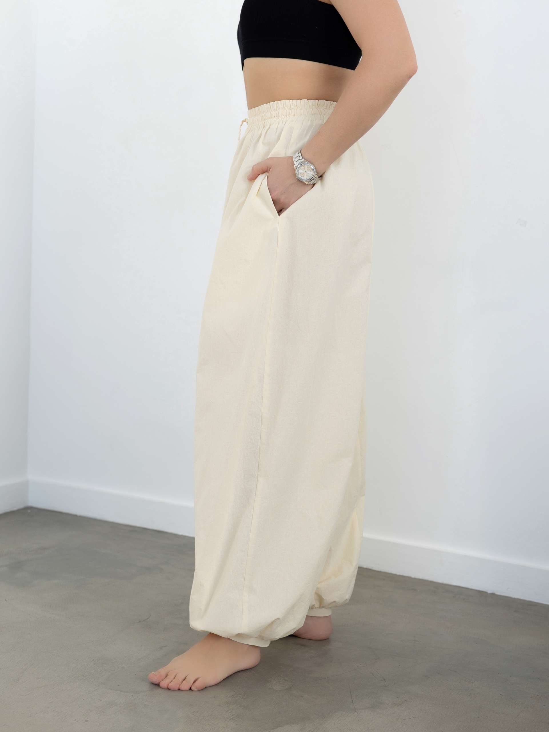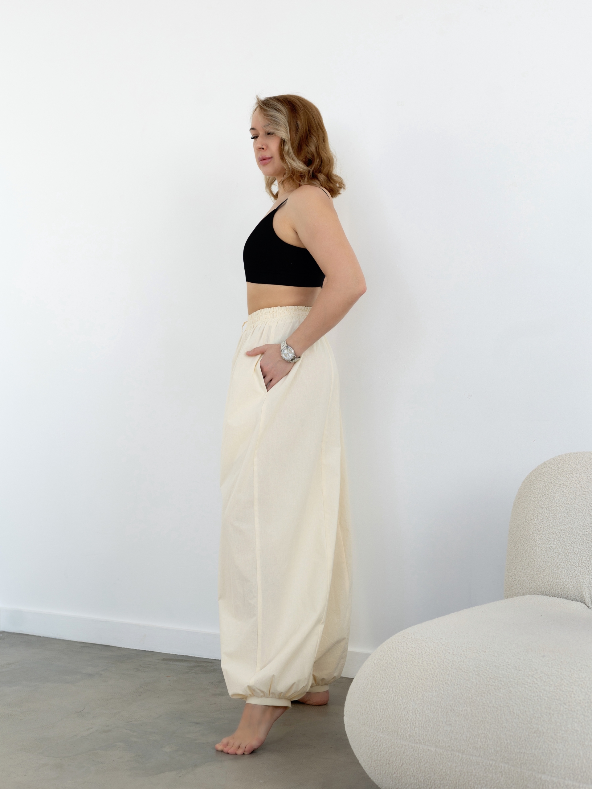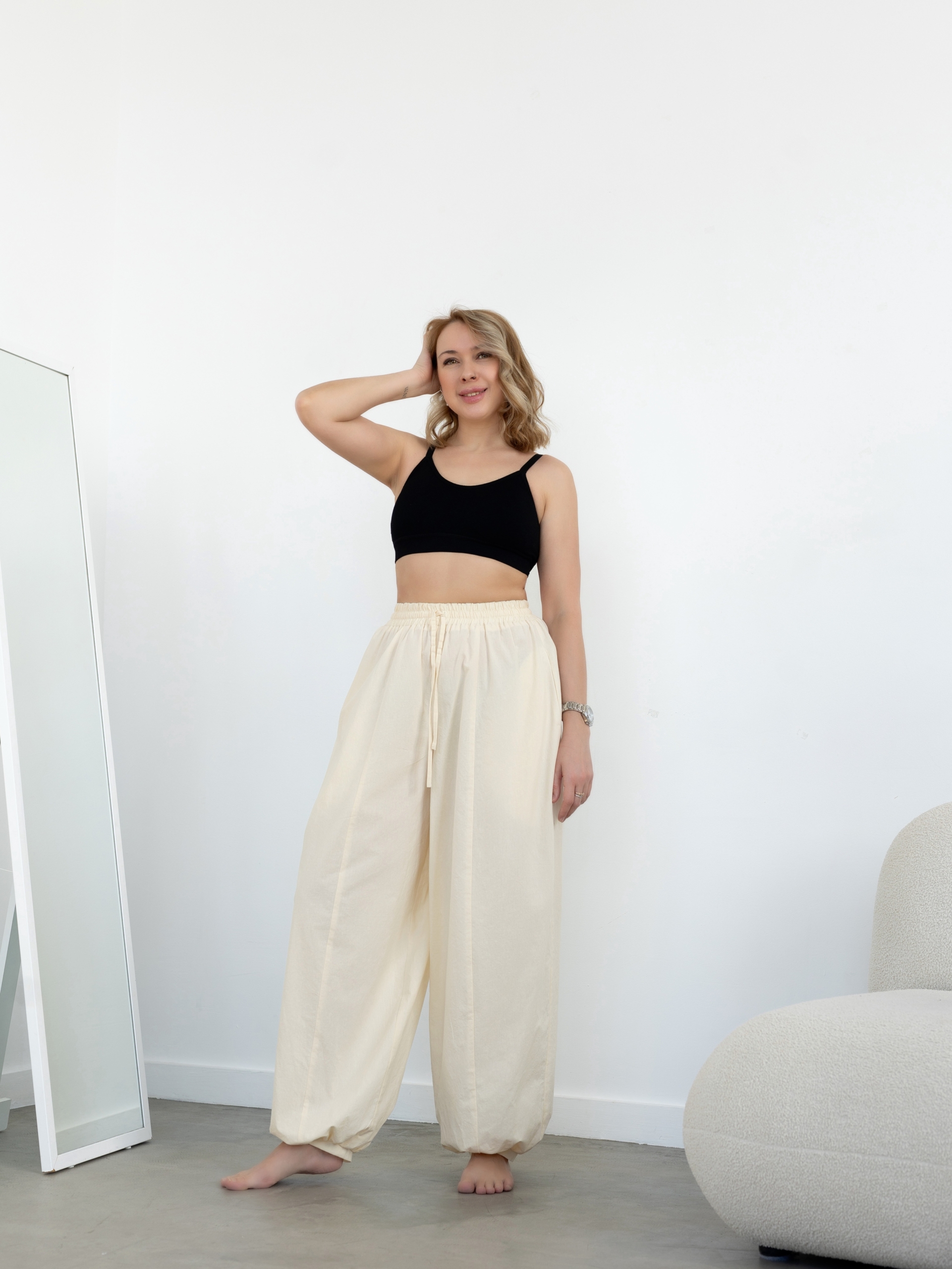 Модель Елена, брюки 44 размера рост 170 см, реальный размер (на момент фотосессии) по обхвату груди 44 рост 167 см. Параметры тела: ОГ 87 см, ОТ 72 см, ОБ 96 см. Размер выбран 44 по обхвату бедер. Черные брюки сшиты из ткани «Дубайский шелк», состав: 100% пэ, плотность: 195 гр/м2. Светло-желтые брюки сшиты из вареного 100% хлопка.