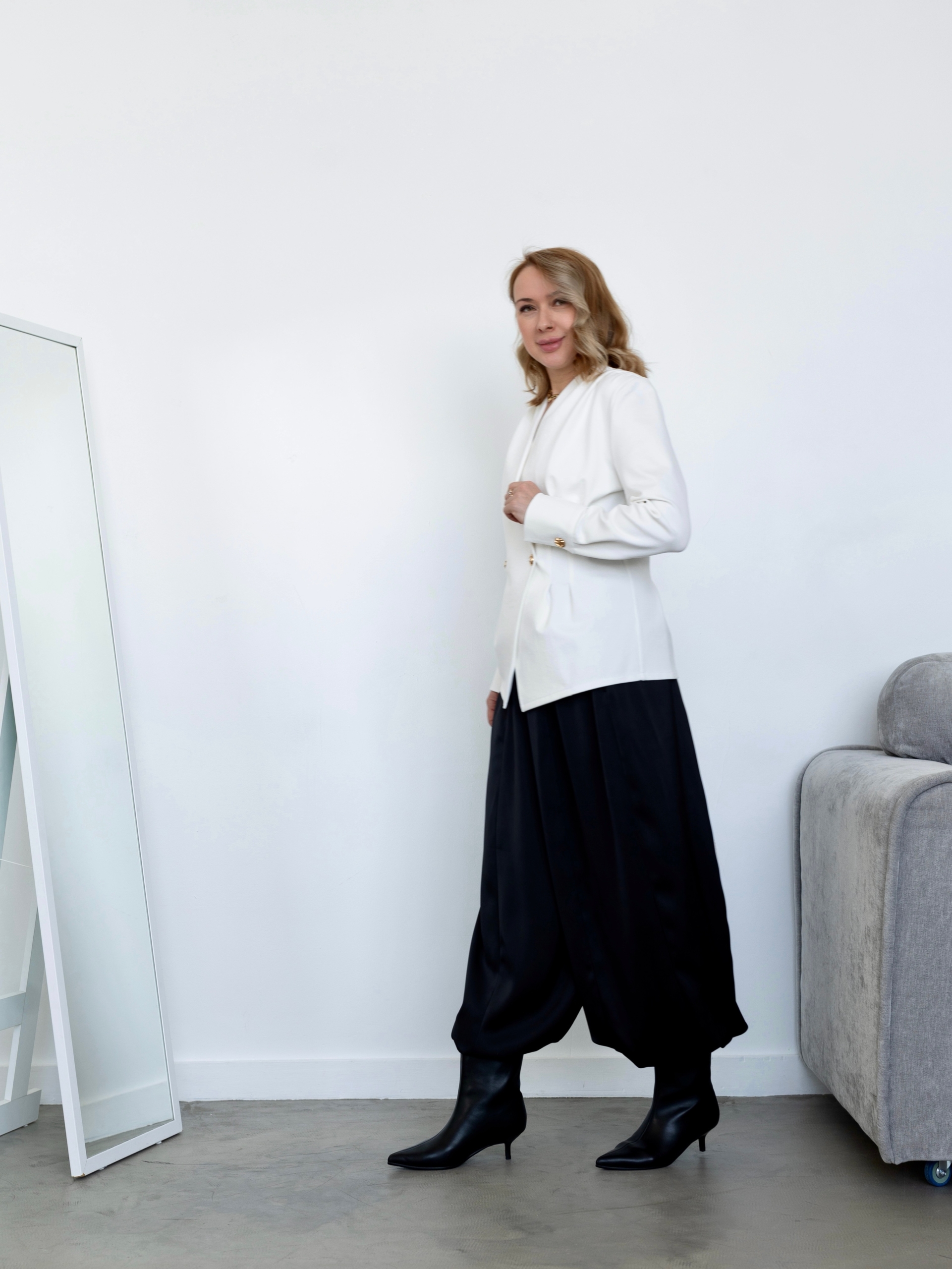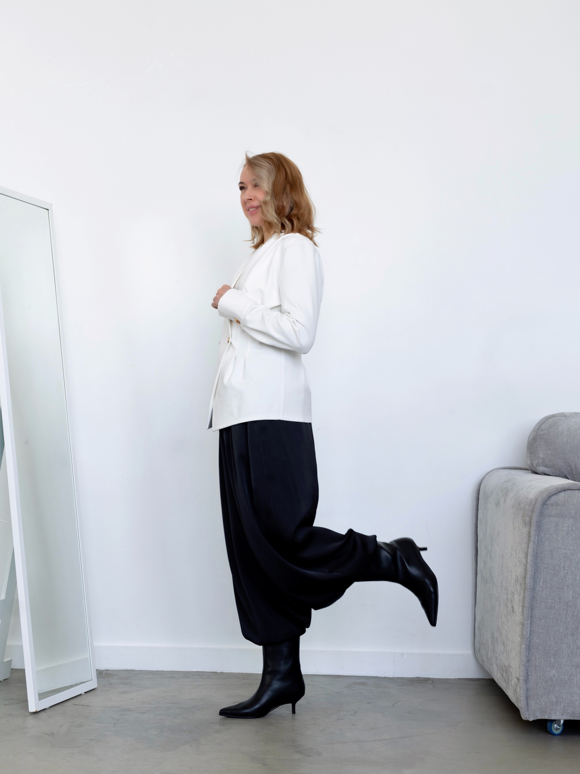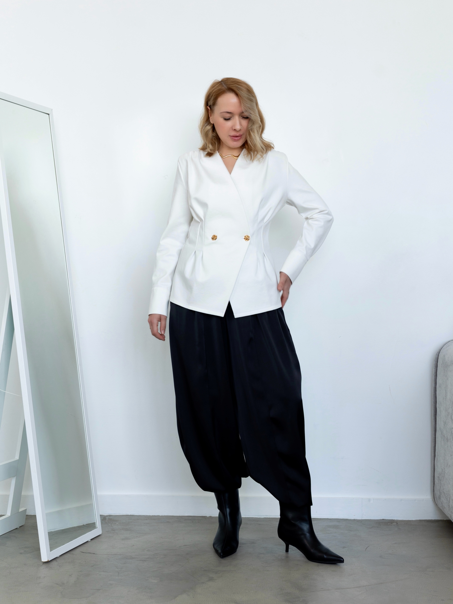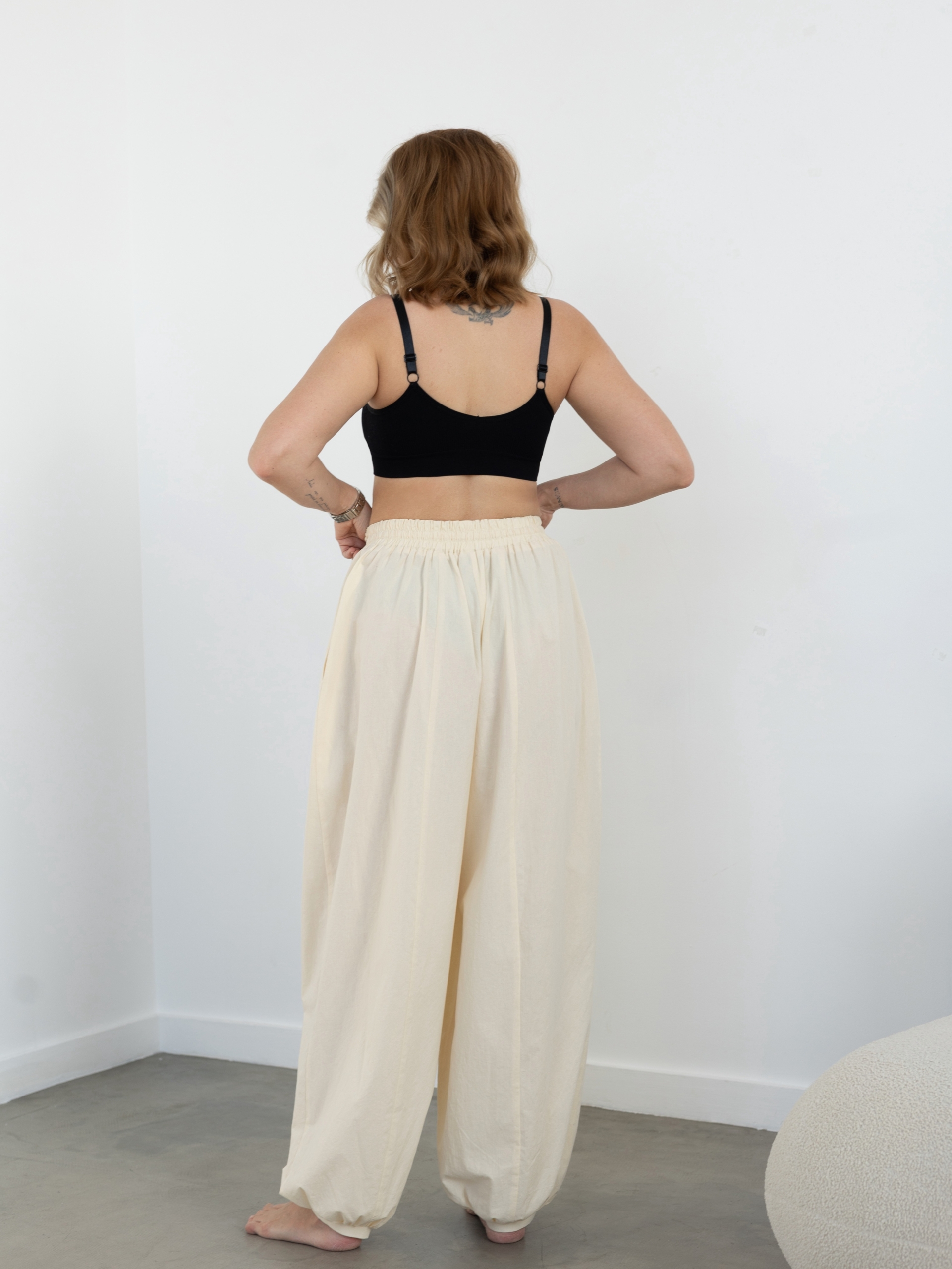Модель Елена, брюки 44 размера рост 170 см, реальный размер (на момент фотосессии) по обхвату груди 44 рост 167 см. Параметры тела: ОГ 87 см, ОТ 72 см, ОБ 96 см. Размер выбран 44 по обхвату бедер. Черные брюки сшиты из ткани «Дубайский шелк», состав: 100% пэ, плотность: 195 гр/м2. Светло-желтые брюки сшиты из вареного 100% хлопка.