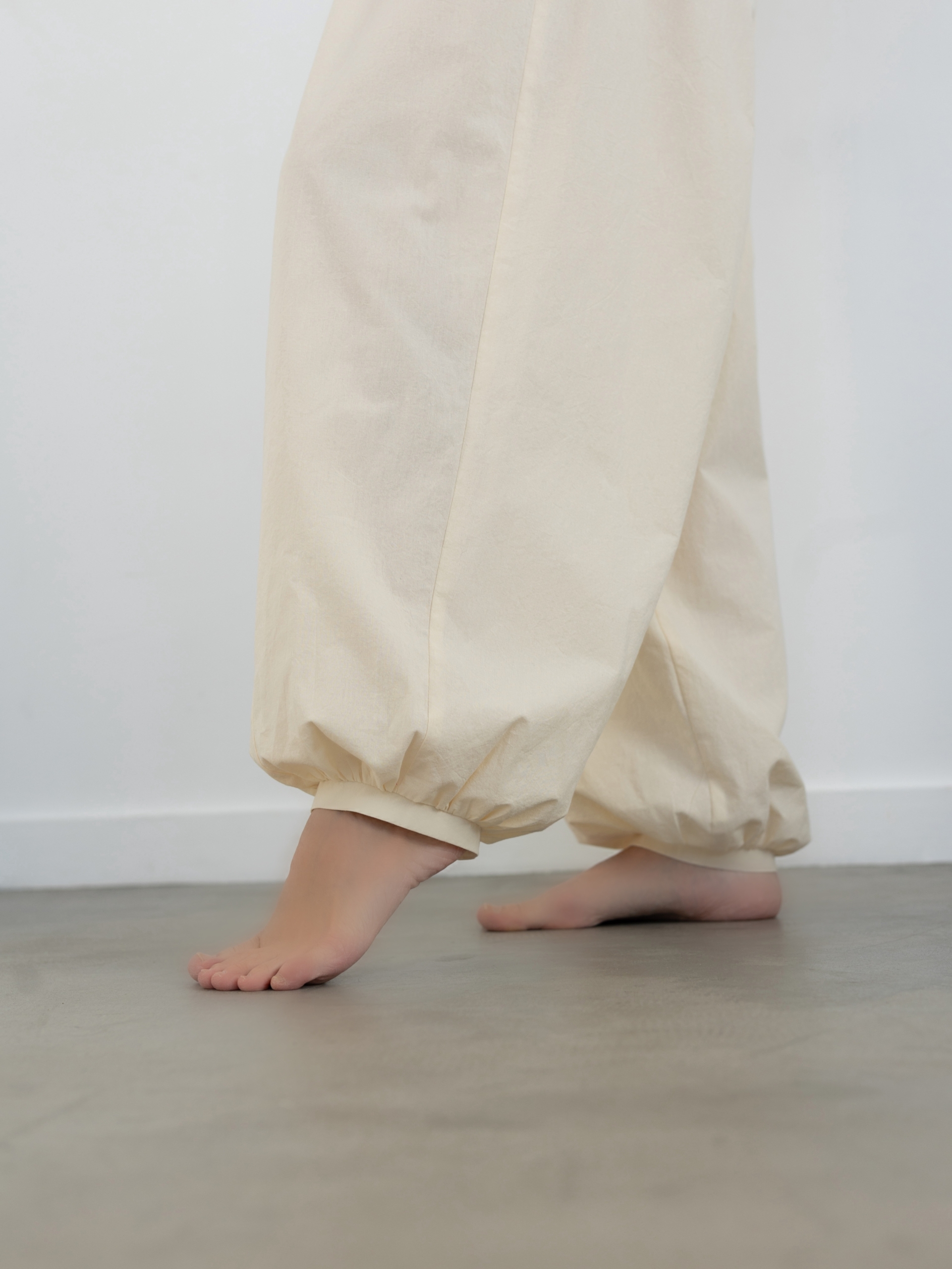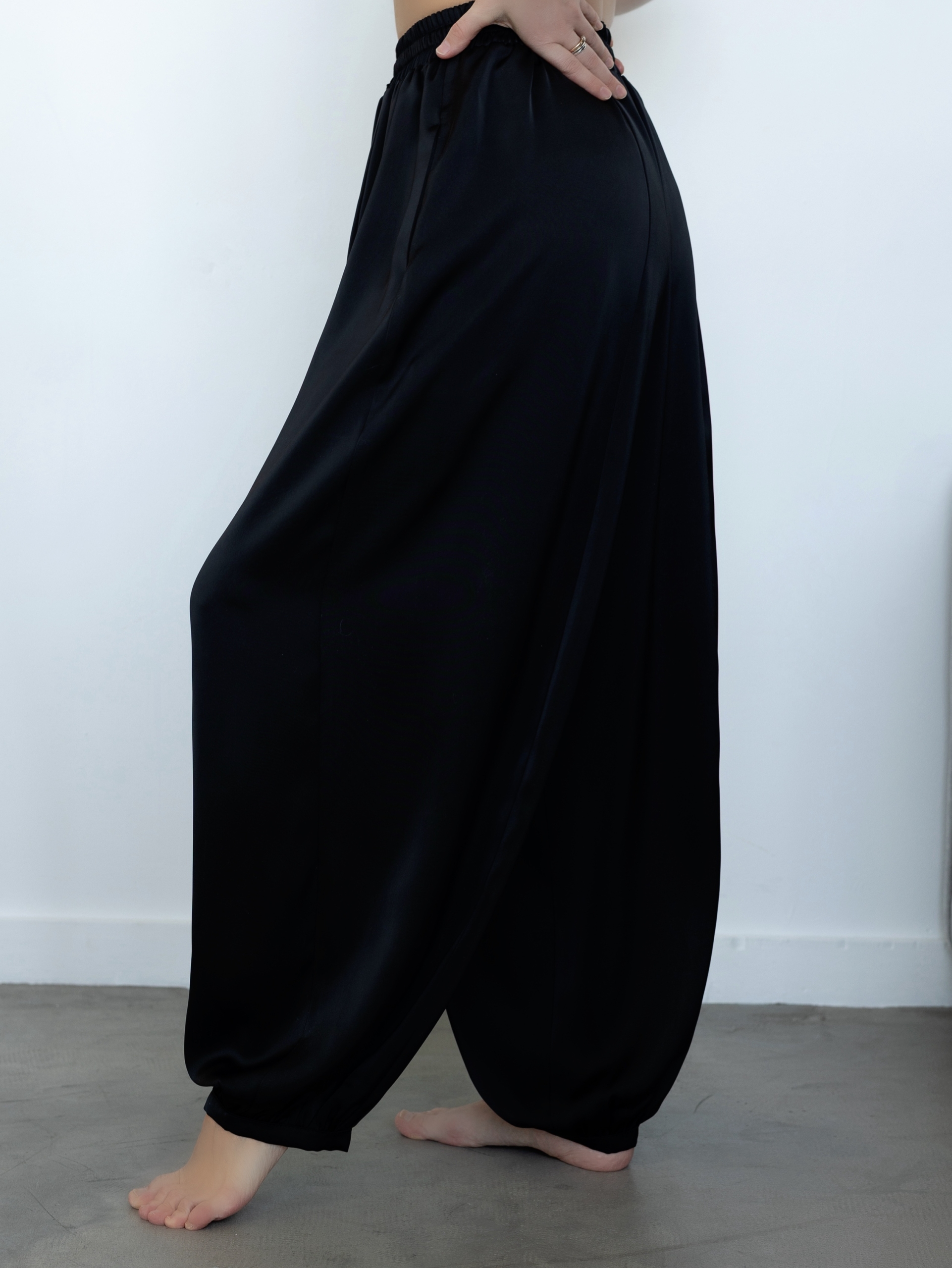 Женские брюки широкого кроя, на передних и задних половинках вертикальные подрезы, брюки немного заужены к низу, низ брюк на сборке, по низу притачная узкая манжета из основной ткани, верх брюк обработан притачным поясом из основной ткани с широкой резинкой внутри, пояс отстрочен двумя строчками, на поясе пробиты две петли, через которые продет шнур, карманы в боковых швах.