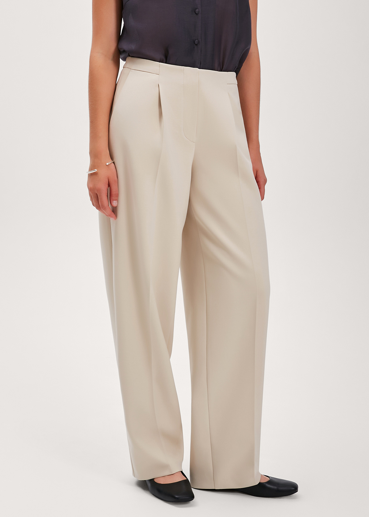 Брюки свободного силуэта с небольшим заужением к низу, средней посадки, с застежкой на брючную молнию и крючок. Верхний край пояса располагается ниже естественной линии талии на 4 см.