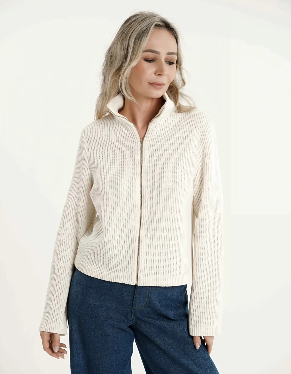 Горловина круглая с притачным высоким воротником-стойкой, по линии середины переда разъемная молния. Перед с нагрудной вытачкой, выходящей из бокового шва. Рукава втачные длинные.