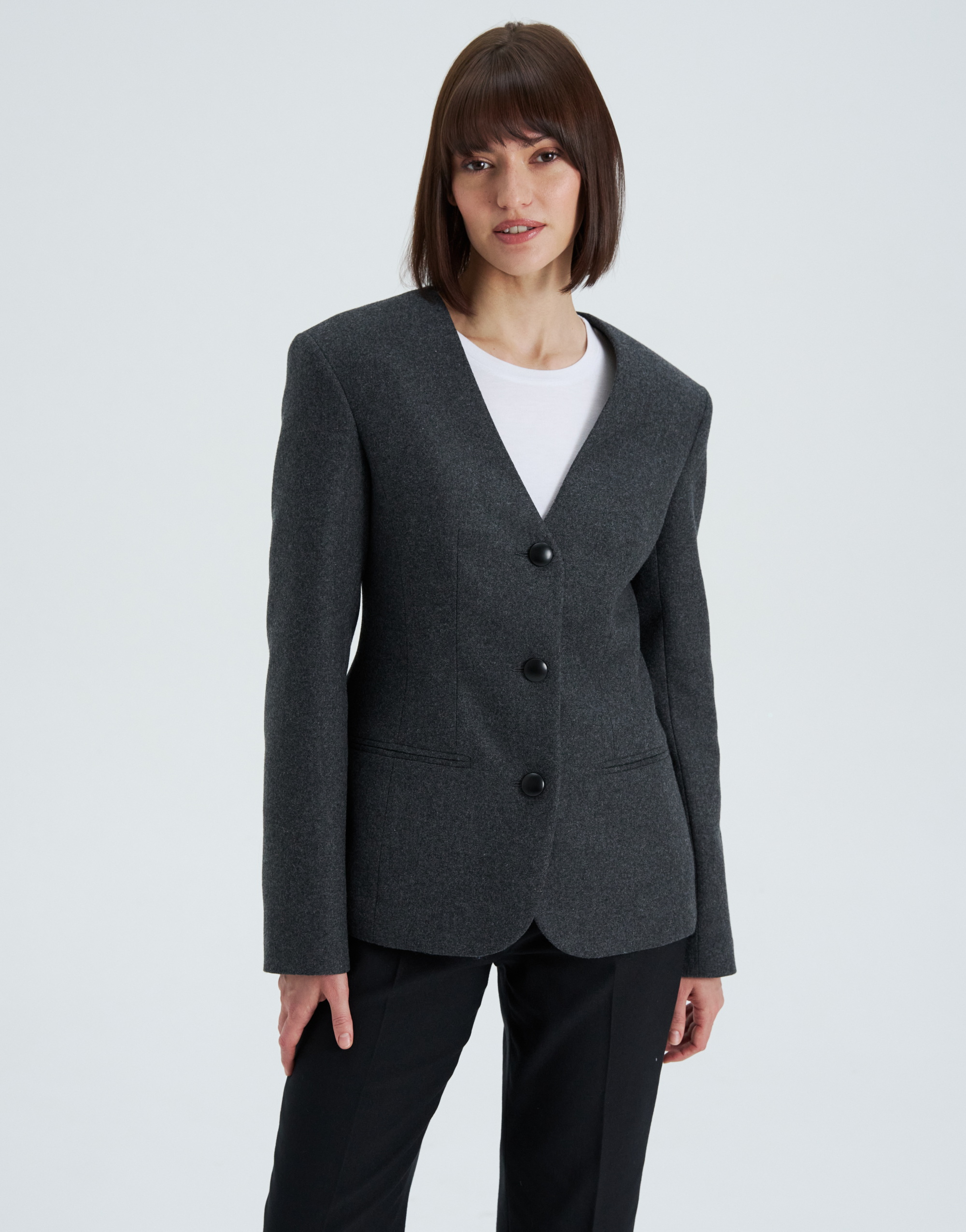 Жакет умеренного объёма, приталенного силуэта, длиной до линии бедер, на подкладке. Застежка центральная бортовая на 3 петли и 3 пуговицы. Нижний край борта закруглен. Перед с рельефами из проймы, вытачкой и карманами. Вытачка образована за счет объединения нагрудной вытачки с талиевой и заканчивается подрезом по линии входа в карман. Карман прорезной с обтачками. Спинка со средним швом, плечевыми вытачками, одной парой талиевых вытачек и рельефами из проймы. Линия плеч расширена. Рукав втачной, двухшовный, полной длины. Вырез горловины переда имеет V-образную форму.