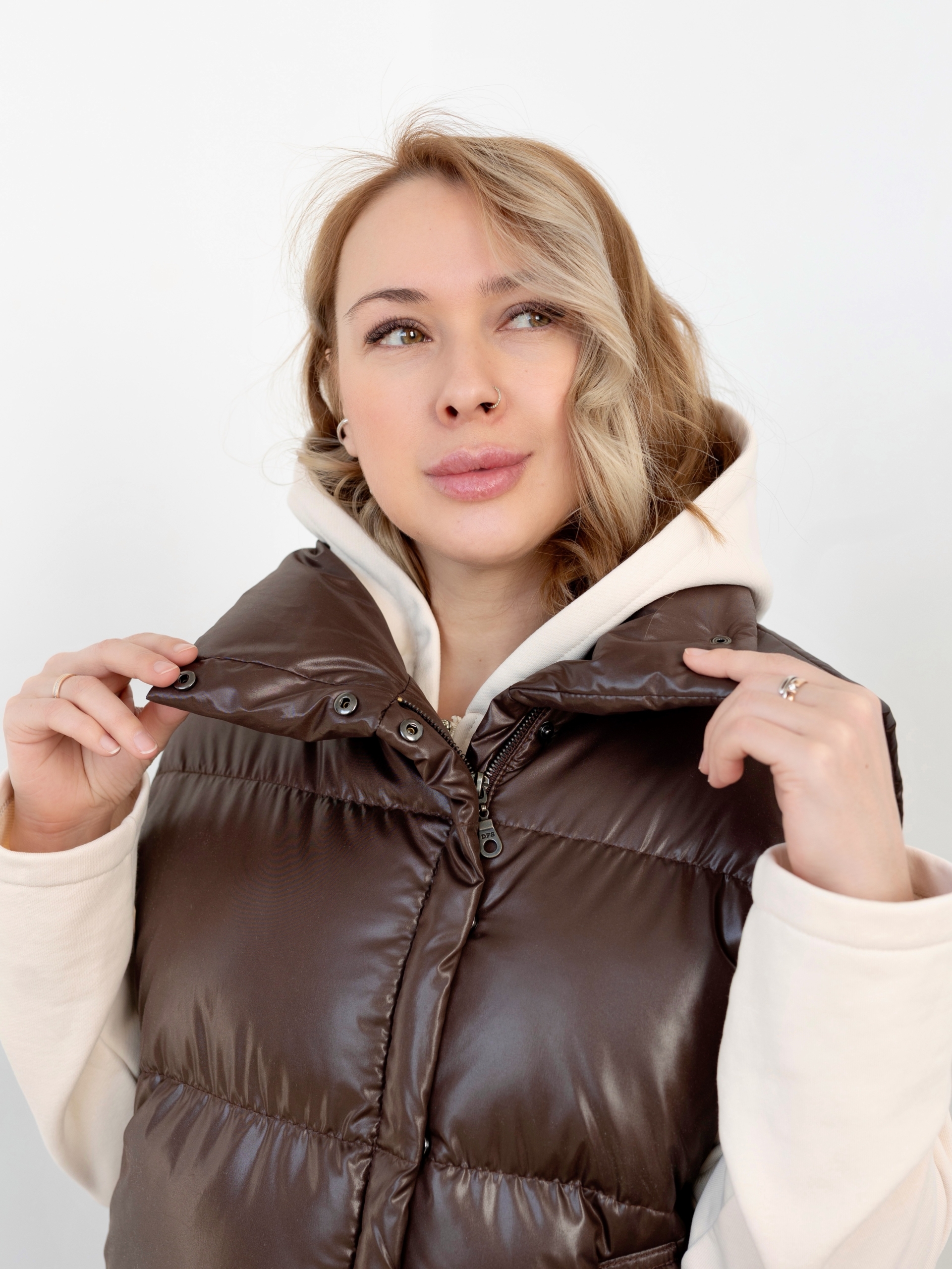 Модель Виктория, жилет 54 размера рост 176 см, реальный размер (на момент фотосессии) 54 рост 173 см. Параметры тела: ОГ 108 см, ОТ 95 см, ОБ 119 см. Размер выбран по обхвату груди. Ткань верха — курточная ткань дюспо с блеском, утеплитель — слайтекс 100 гр + лебяжий искусственный пух, на подкладке поливискозная подкладочная ткань.