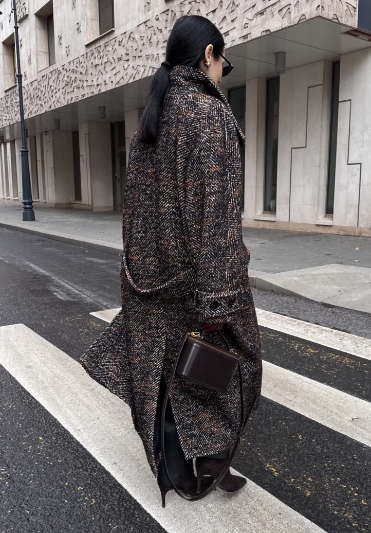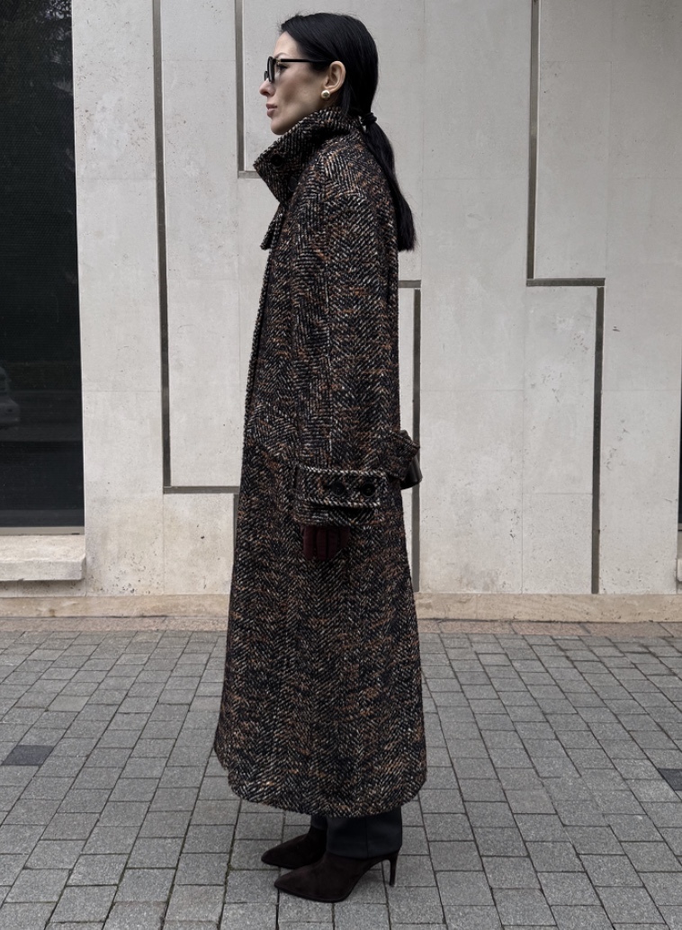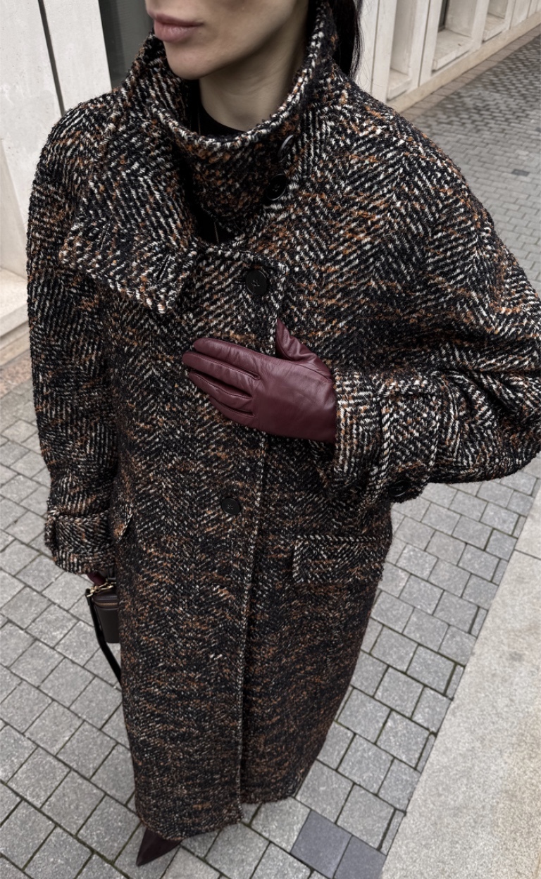 Пальто на фото сшито из пальтовой ткани по составу: шерсть 58%, альпака 15%, мохер 15%, полиамид 12%.