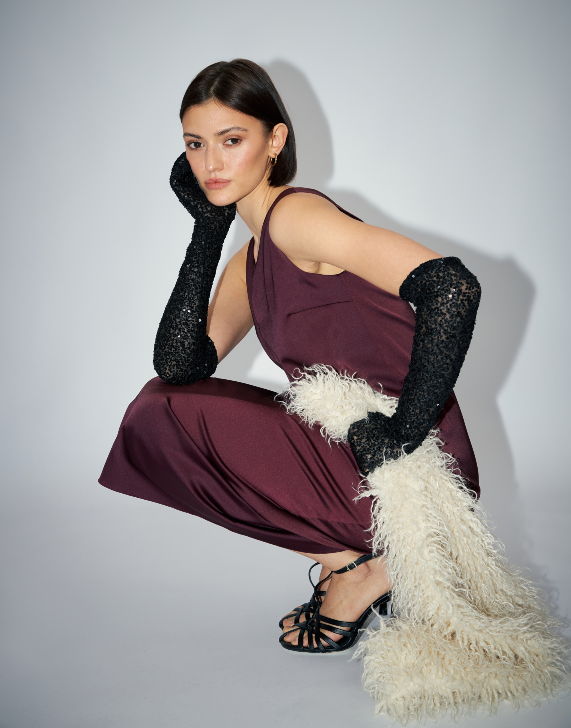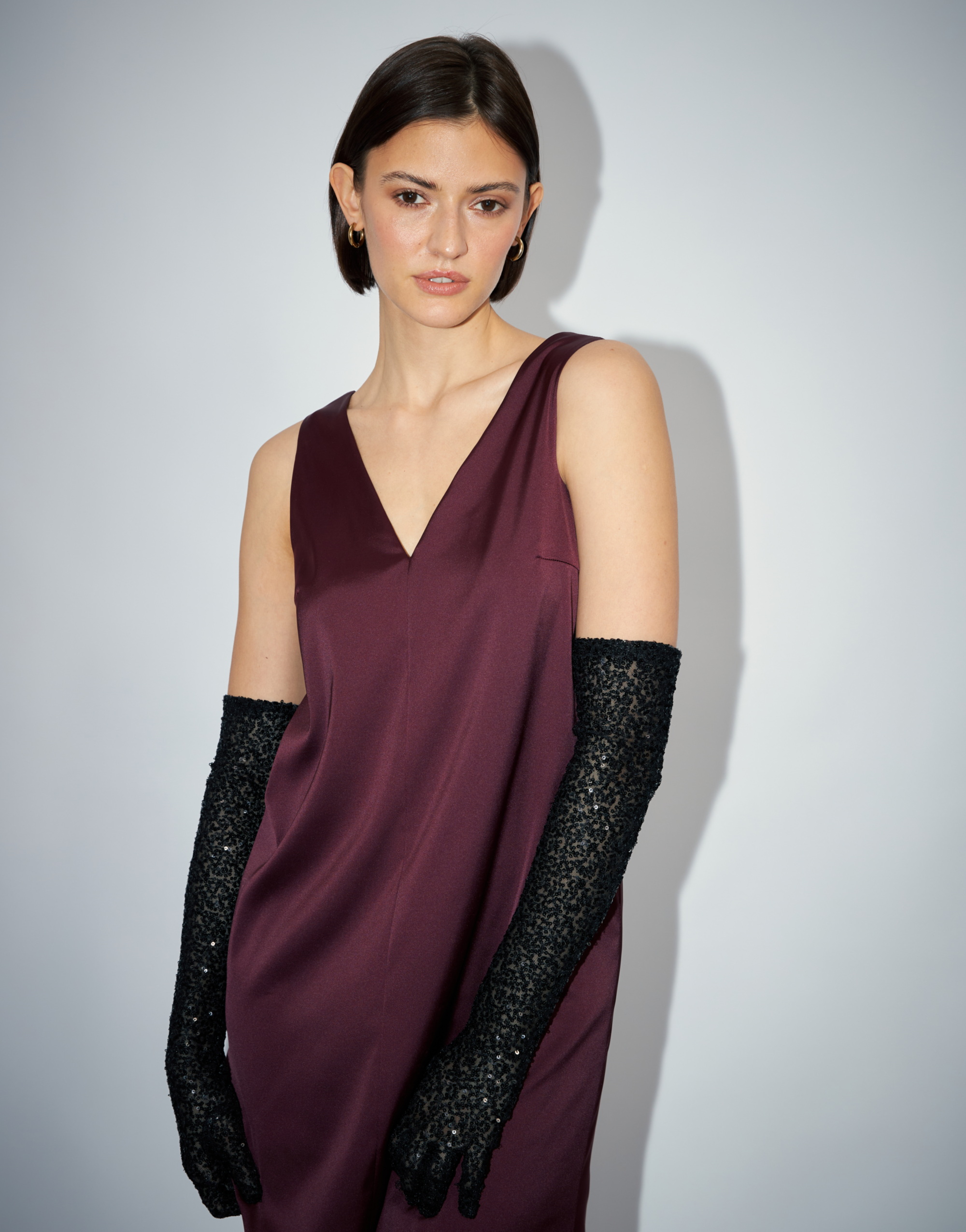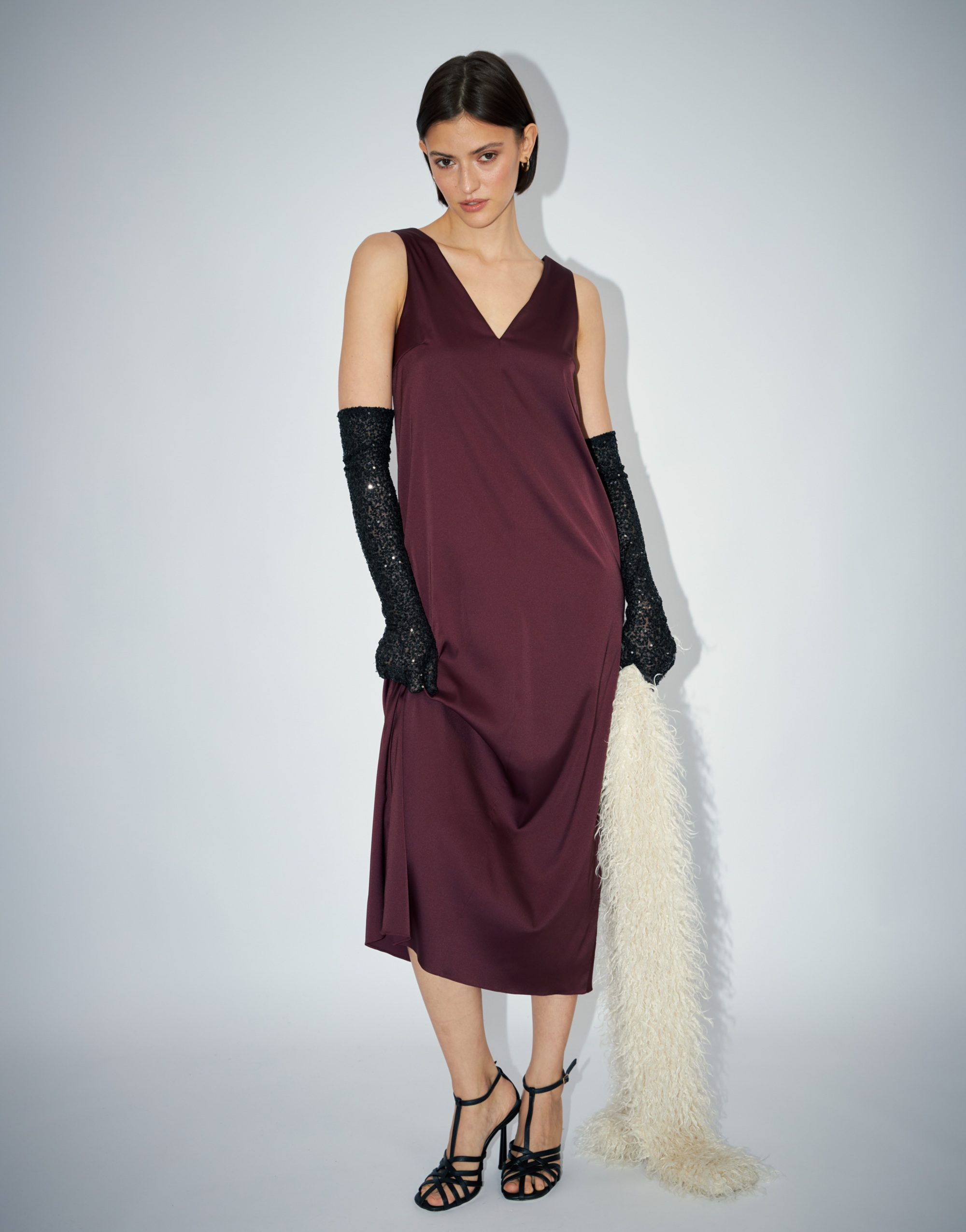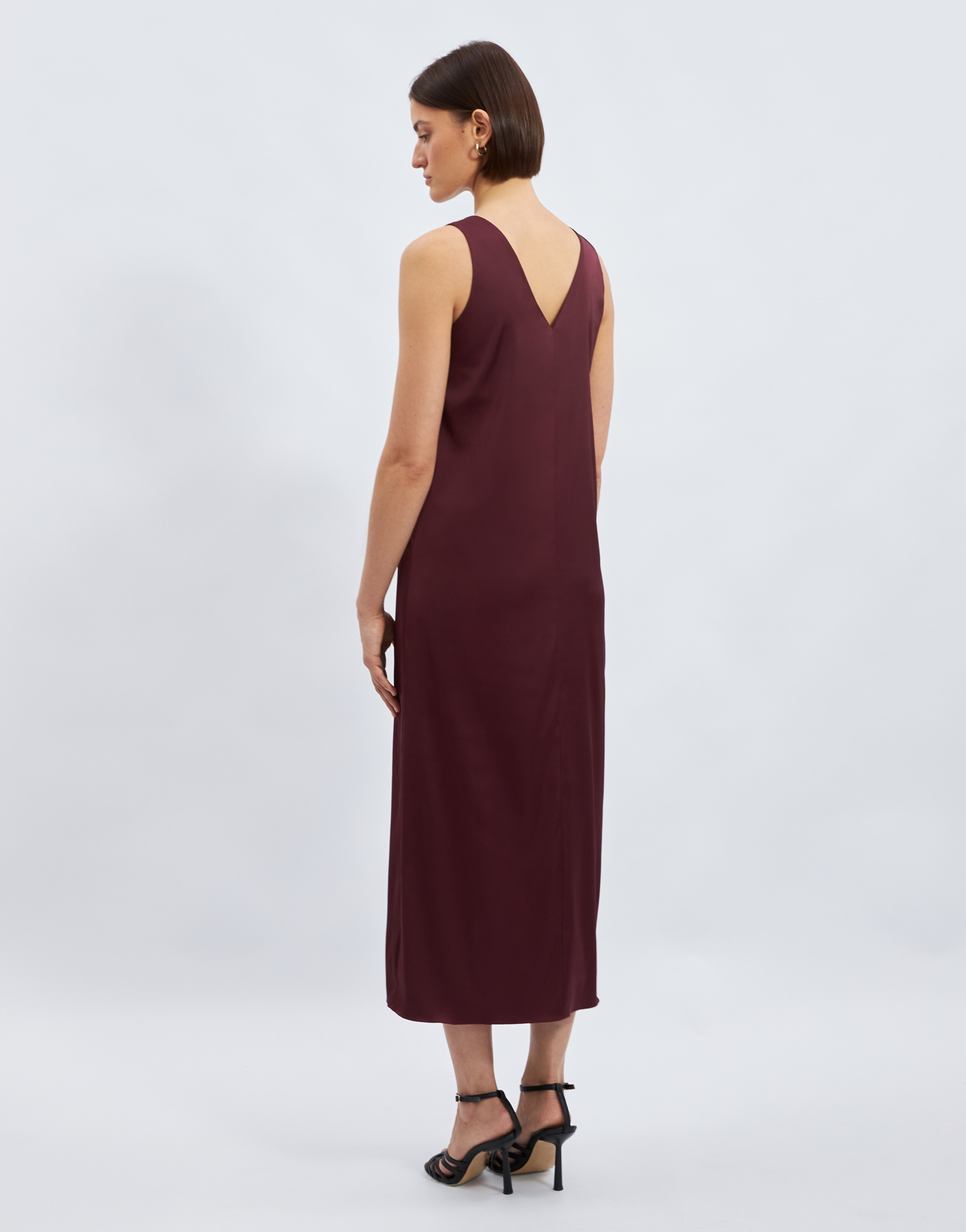 Платье малого объема, прямого силуэта, с небольшим расширением к низу, длиной выше щиколотки, на подкладке. Перед с нагрудной вытачкой из бокового шва и средним швом. Спинка со средним швом. Вырез горловины переда и спинки имеют V-образную форму.