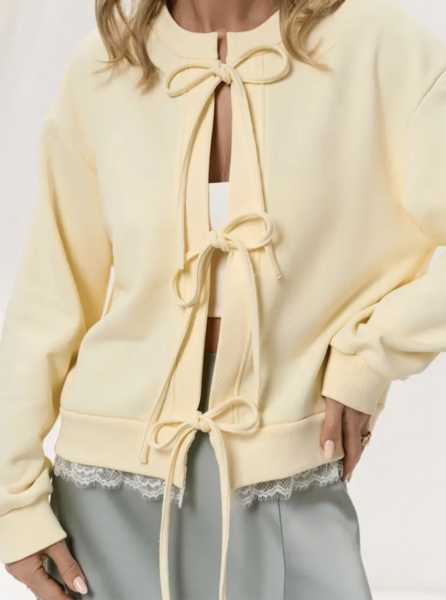 Полочка с притачными планками и завязками по линии середины переда. Спинка цельная. Рукава длинные, со спущенной линией плеча и притачными манжетами. Горловина круглая, с притачной обтачкой. По низу свитшота притачной пояс и кружево.