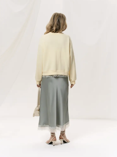 Свитшот среднего объема, длиной выше линии бедер.