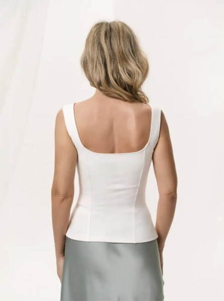 Передняя деталь топа с вертикальными рельефными швами и двойной центральной деталью с вытачками, по верхнему срезу центральной детали вставлено кружево. Спинка с вертикальными рельефными швами. Бретели, срез горловины переда и спинки обработаны обтачкой. Топ застегивается на потайную молнию в левом боковом шве. Длина топа чуть выше линии бедер.