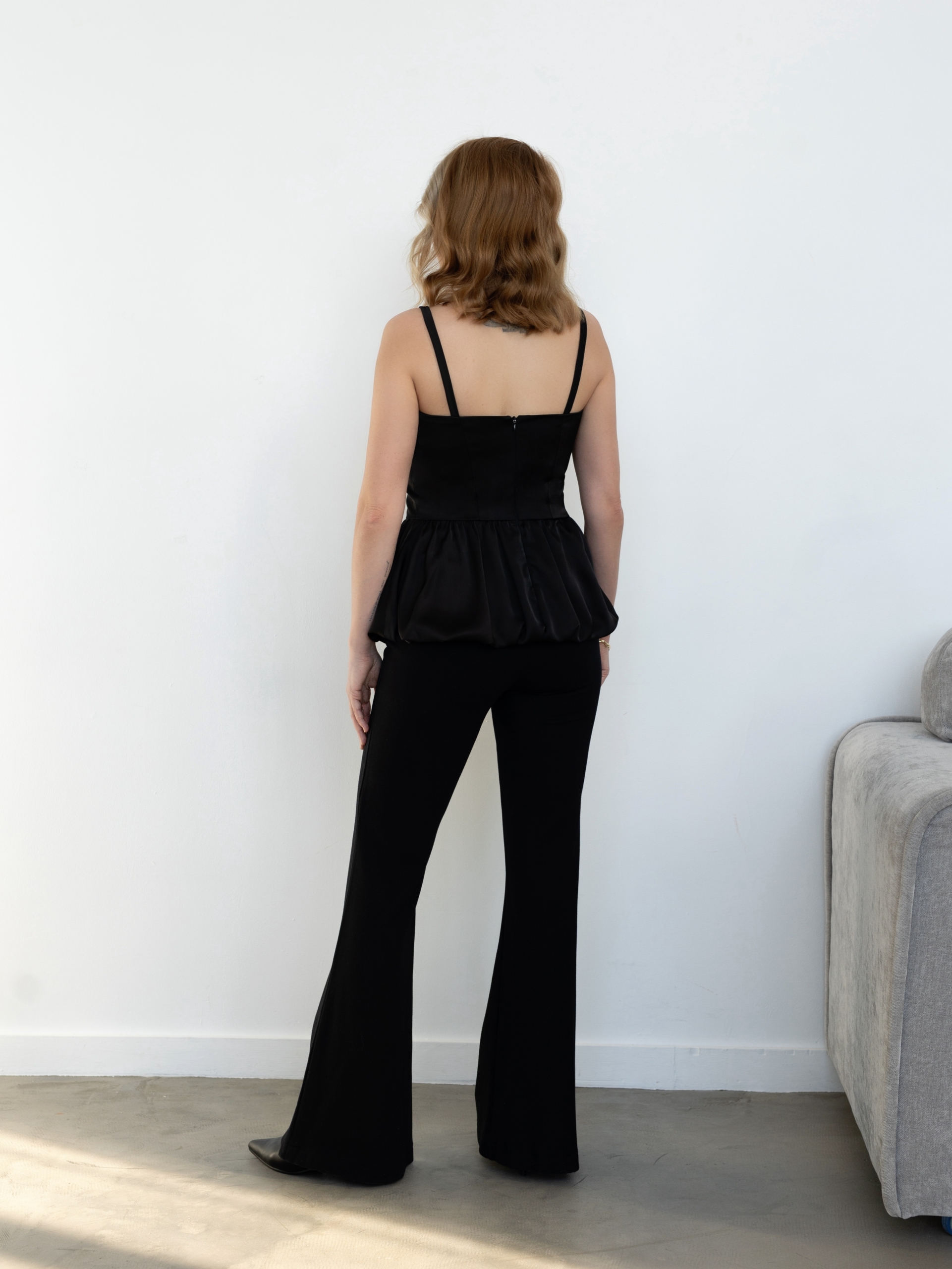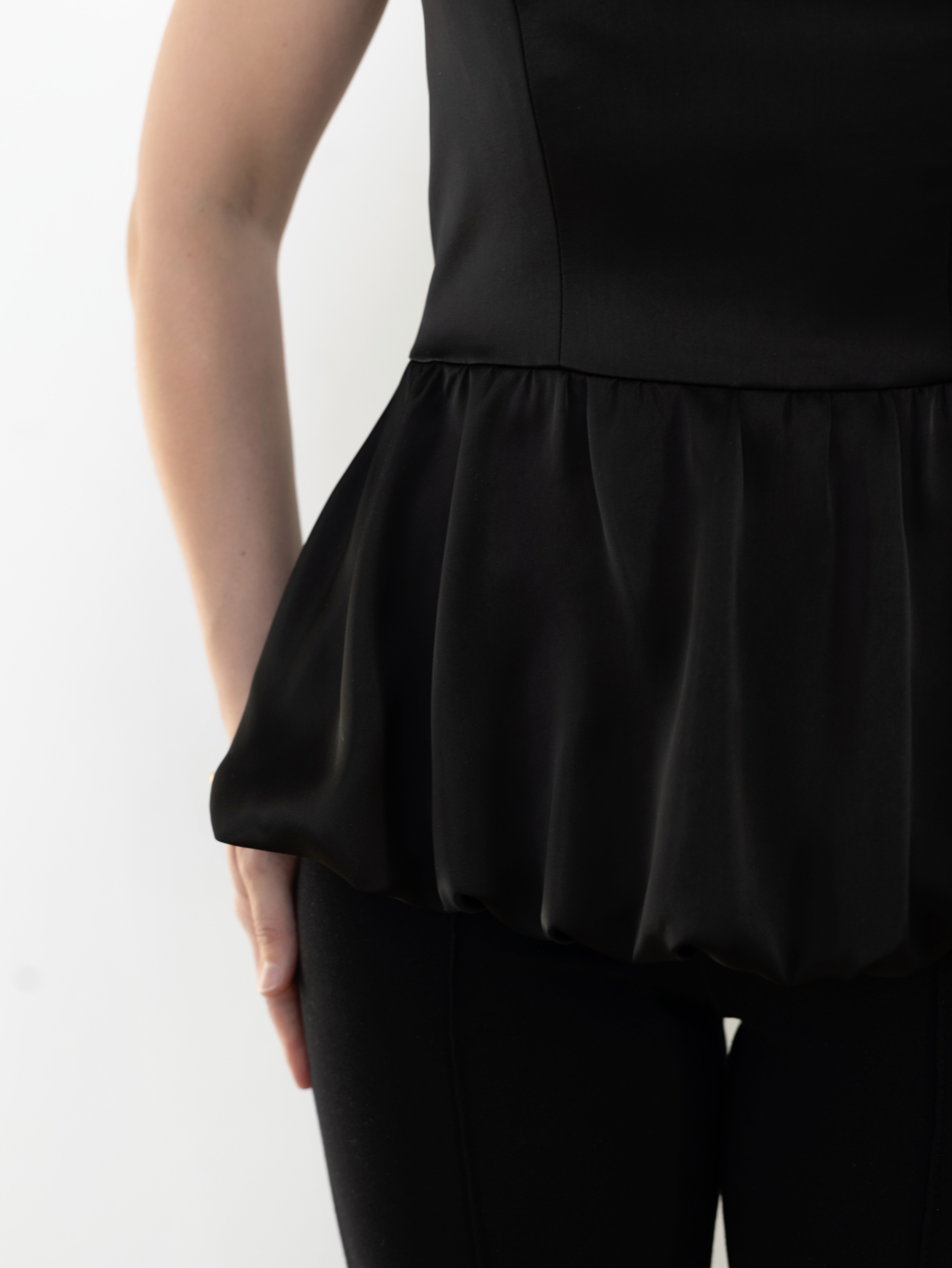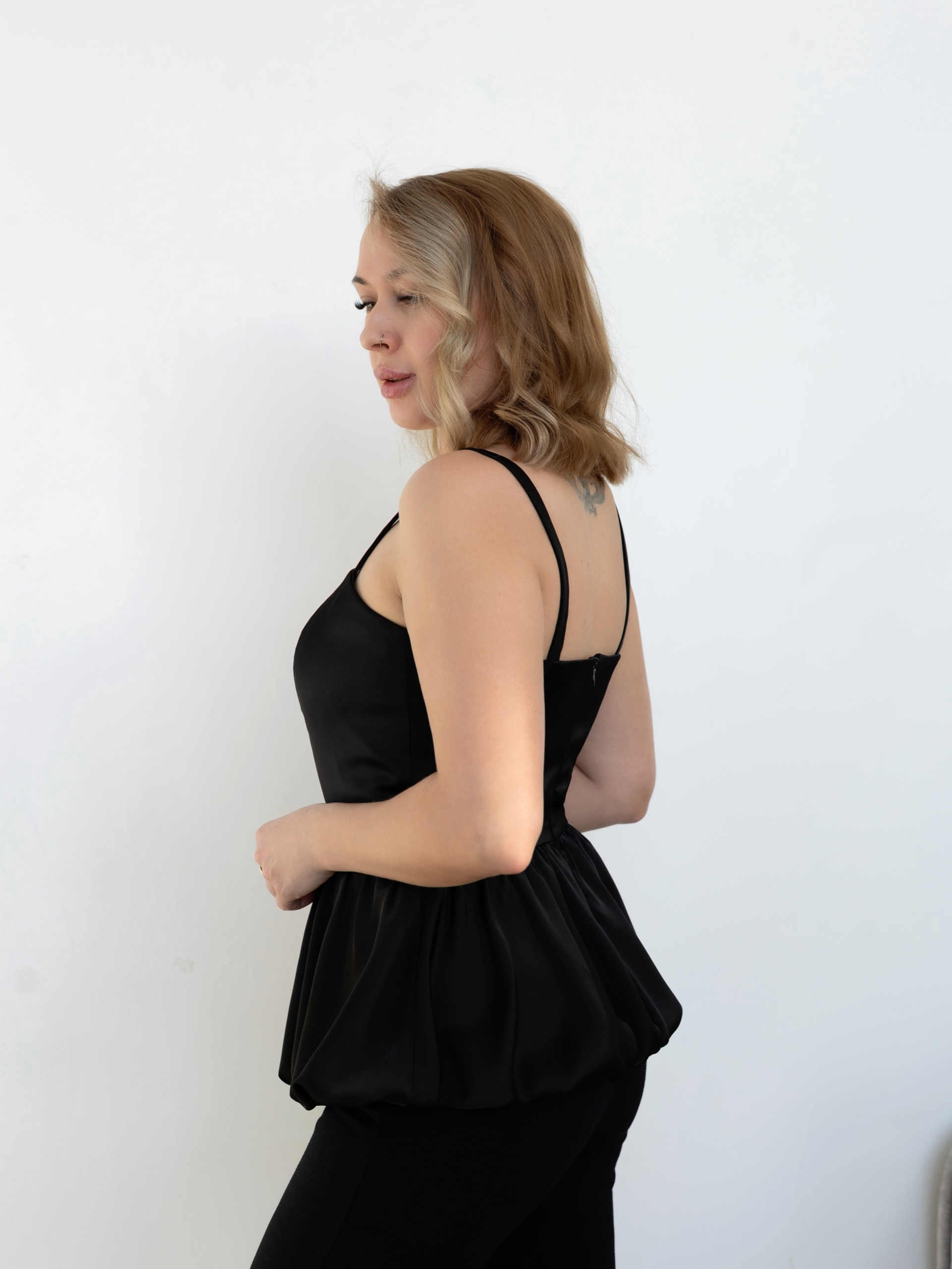 Женский топ на широких бретелях, с лифом прилагающего силуэта, отрезной по линии талии, нижняя часть топа кроя «баллон», по переду и спинке вертикальные рельефы, по центру спинки застежка на потайную молнию.