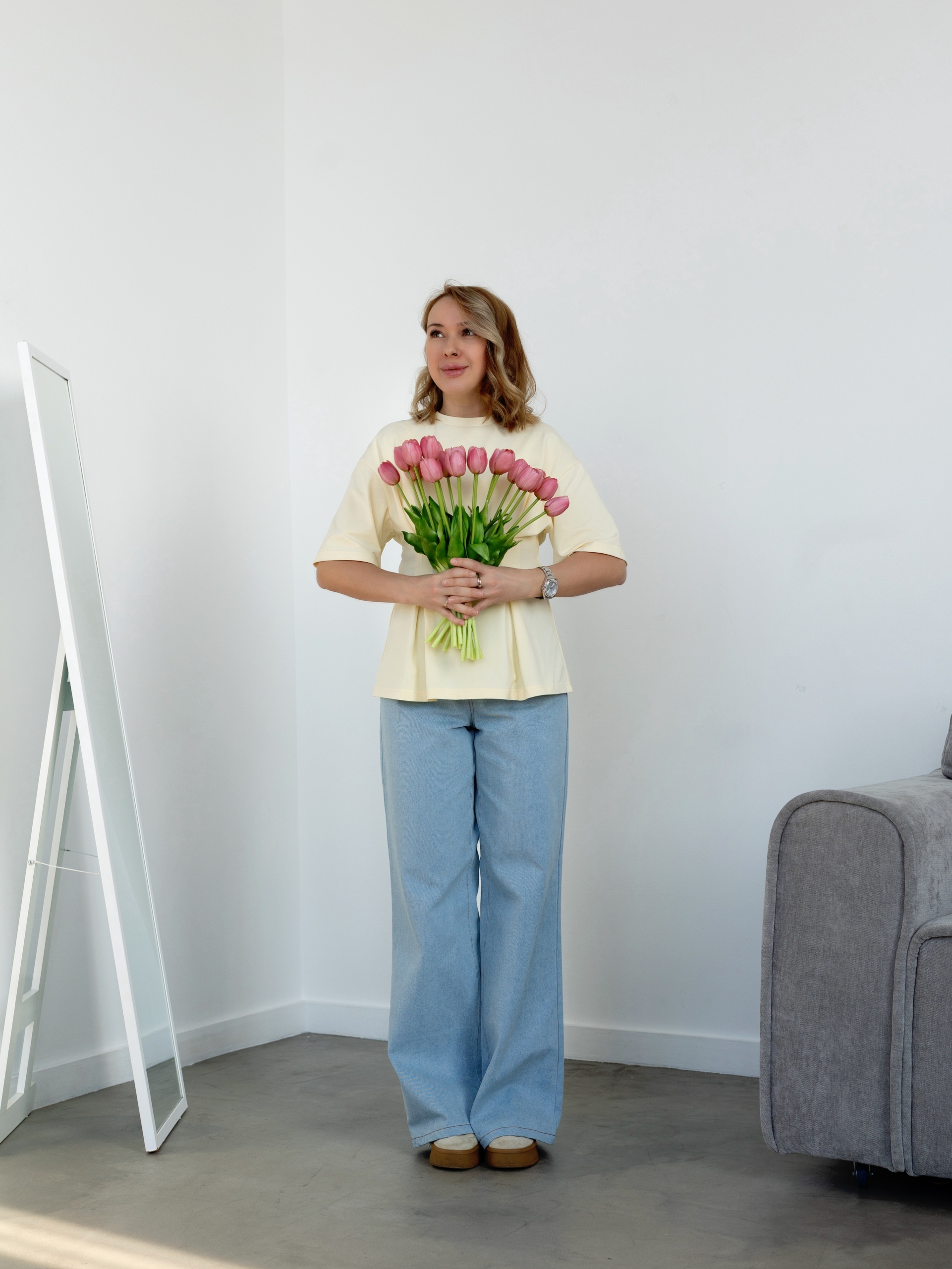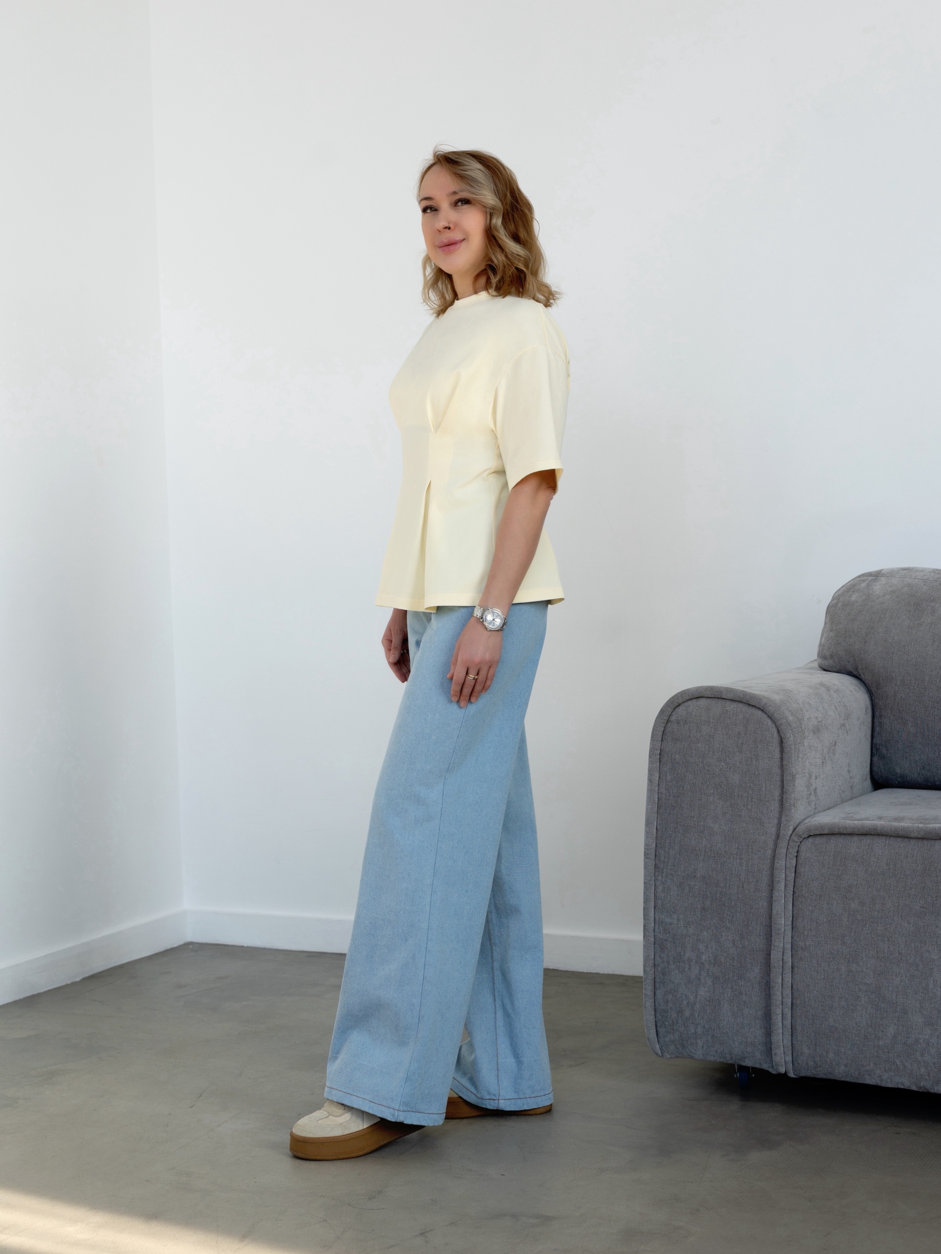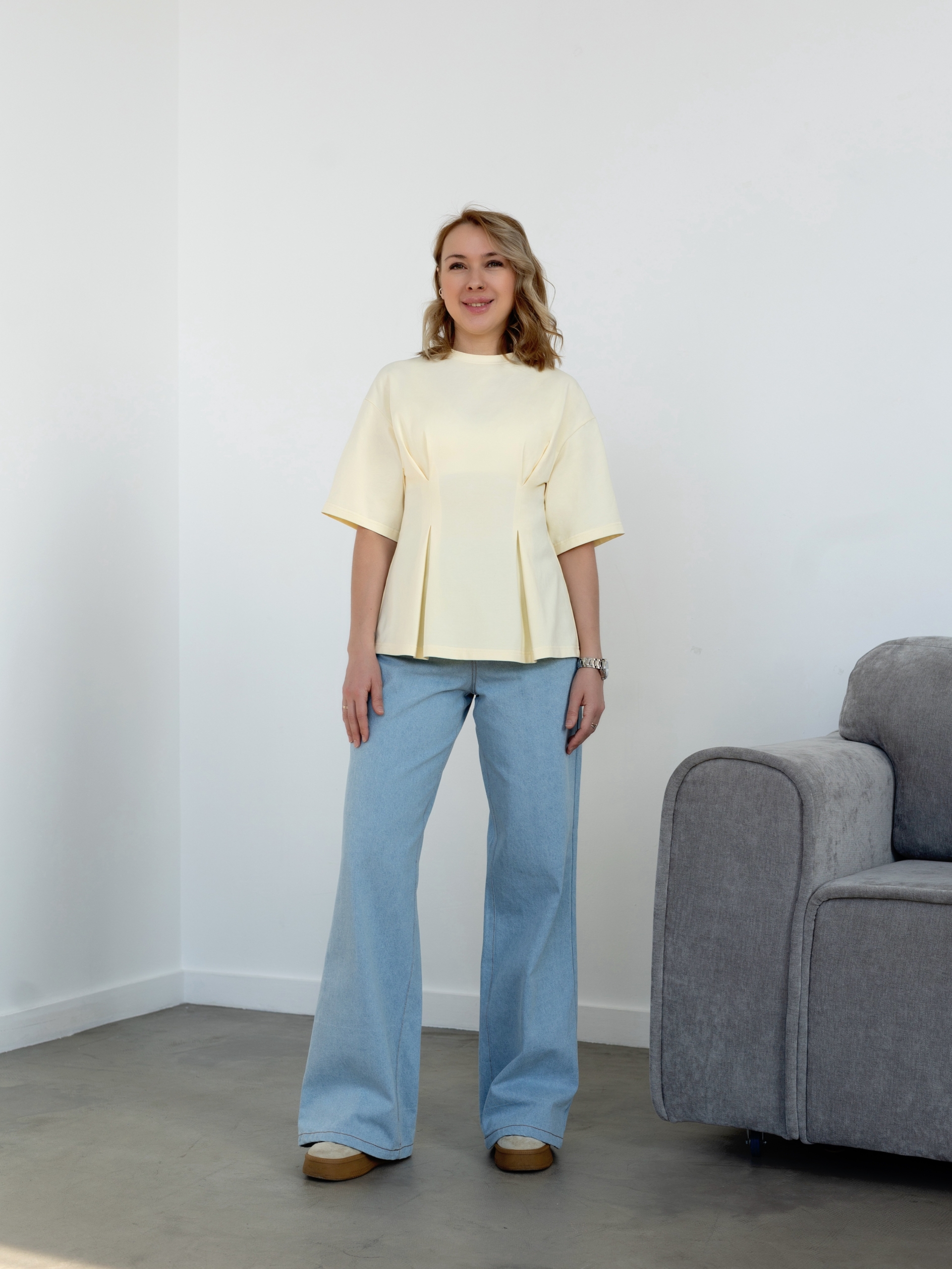 Модель Елена, футболка 44 размера рост 170 см, реальный размер (на момент фотосессии) по обхвату груди 44 рост 167 см. Параметры тела: ОГ 87 см, ОТ 72 см, ОБ 96 см. Размер по обхвату груди. Сшита из кулирки с лайкрой плотность: 220 гр/м2, цвет: сливочное масло.