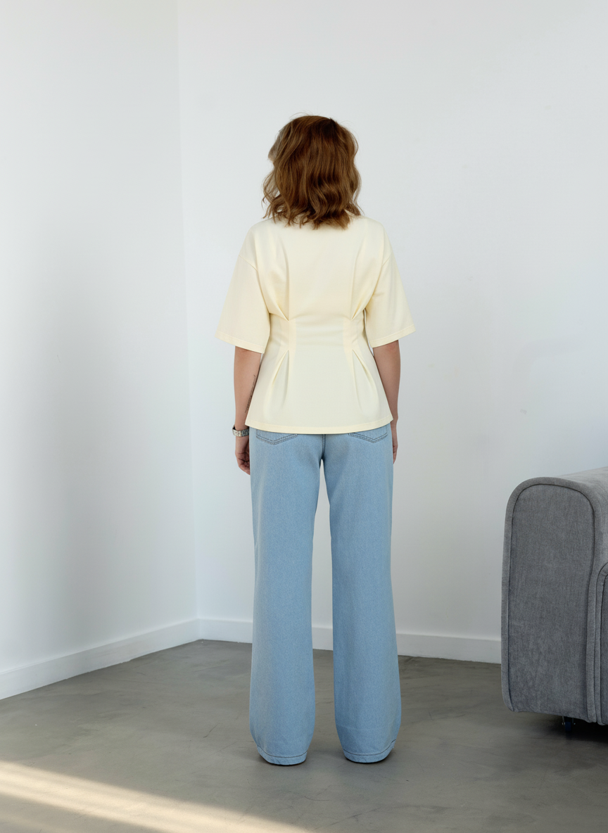 Женская трикотажная свободная футболка, приталенная за счет складок по талии переда и спинки, линия плеча спущена, короткий рукав, горловина округлой формы и обработана обтачкой из основного трикотажа, длина изделия немного выше линии бедер.