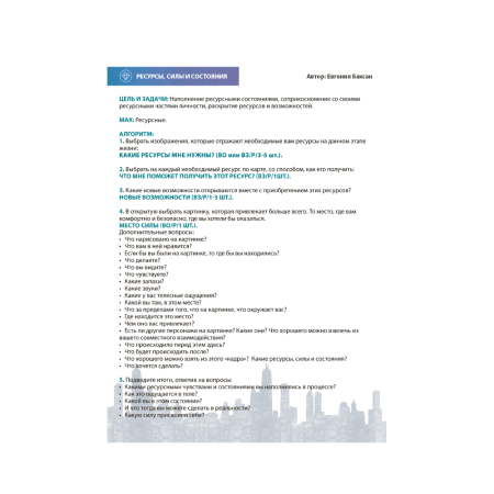 Инструмент представляет собой тематический набор карточек, с подробными инструкциями и краткими схемами техник для работы с МАК.