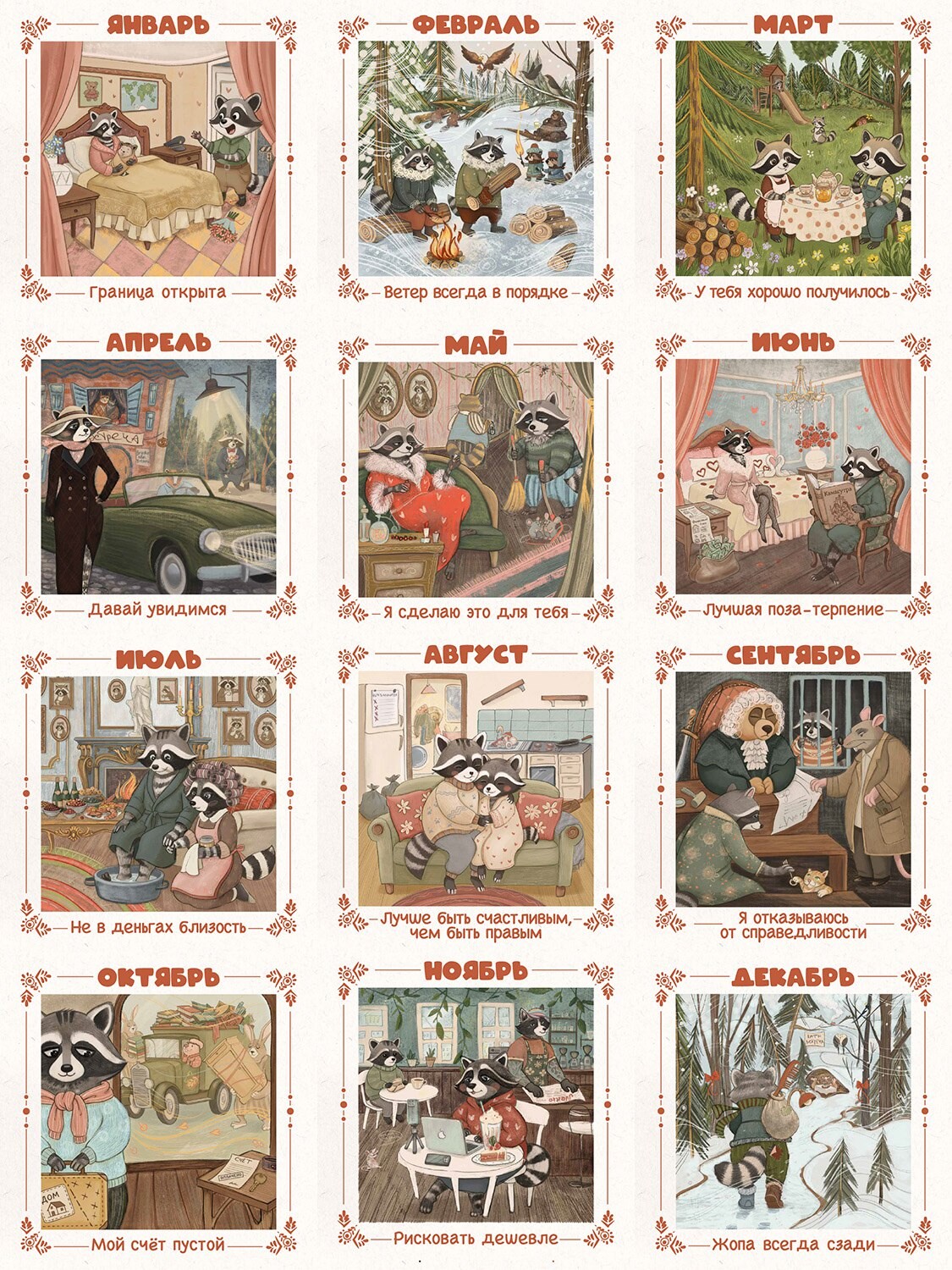 Этот календарь создан Еленой Веселаго в содружестве с художницей Ириной Хрущевой. На каждой странице календаря — картинка из жизни енотов, а также расстановочная фраза-решение, авторства Берта Хеллингера, Елены Веселаго или «слова народные».