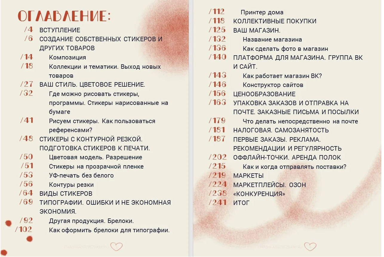 На втором фото вы можете ознакомиться с содержанием, там есть буквально все, что я хотела знать в начале своего пути. Я совершала разные ошибки с типографиями, коллективными покупками. А вам предлагаю купить время - время на то, чтобы пойти быстрым путем, избегая моих глупых ошибок. А главное, начать зарабатывать больше на своем творчестве как можно раньше.