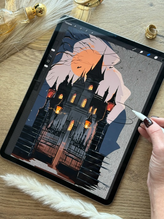 Здесь мы выстроим сложную композицию с глубоким тёмным фоном и эффектом свечения в окнах. Разберём, как делить рисунок на планы, вводить туман и усиливать драматичность. Работа выглядит кинематографично, но построена на простых приёмах. Это урок о том, как с помощью свето-тональных решений и пары акцентов создавать иллюстрации с магией.