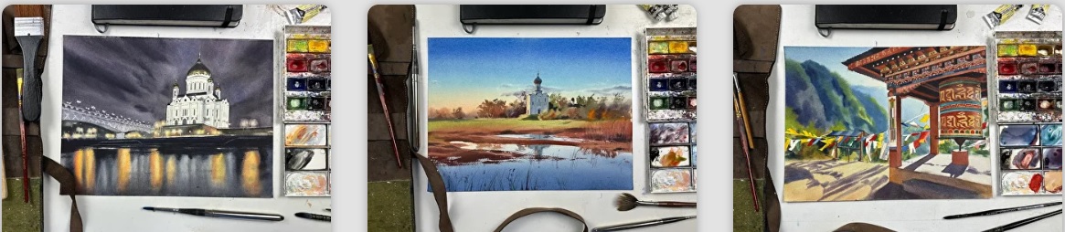 Курс «Церкви и храмы акварелью» — это очередное наше признание в любви архитектуре. Двигаясь от простого к сложному, вы напишете православные, католические и лютеранские храмы, белоснежную мечеть и многоцветный буддистский храм. Референсы выбраны так, чтобы вы научились писать разные фактуры, показывать ночное и дневное освещение, отражения в воде и мягкие облака.