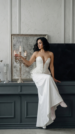 Нижняя часть выполнена с двойной баской с фигурным краем, которая усиливает эффект тонкой талии и добавляет объём по линии бёдер. Удлинённый стан делает модель выразительной и подходит для торжественных образов.