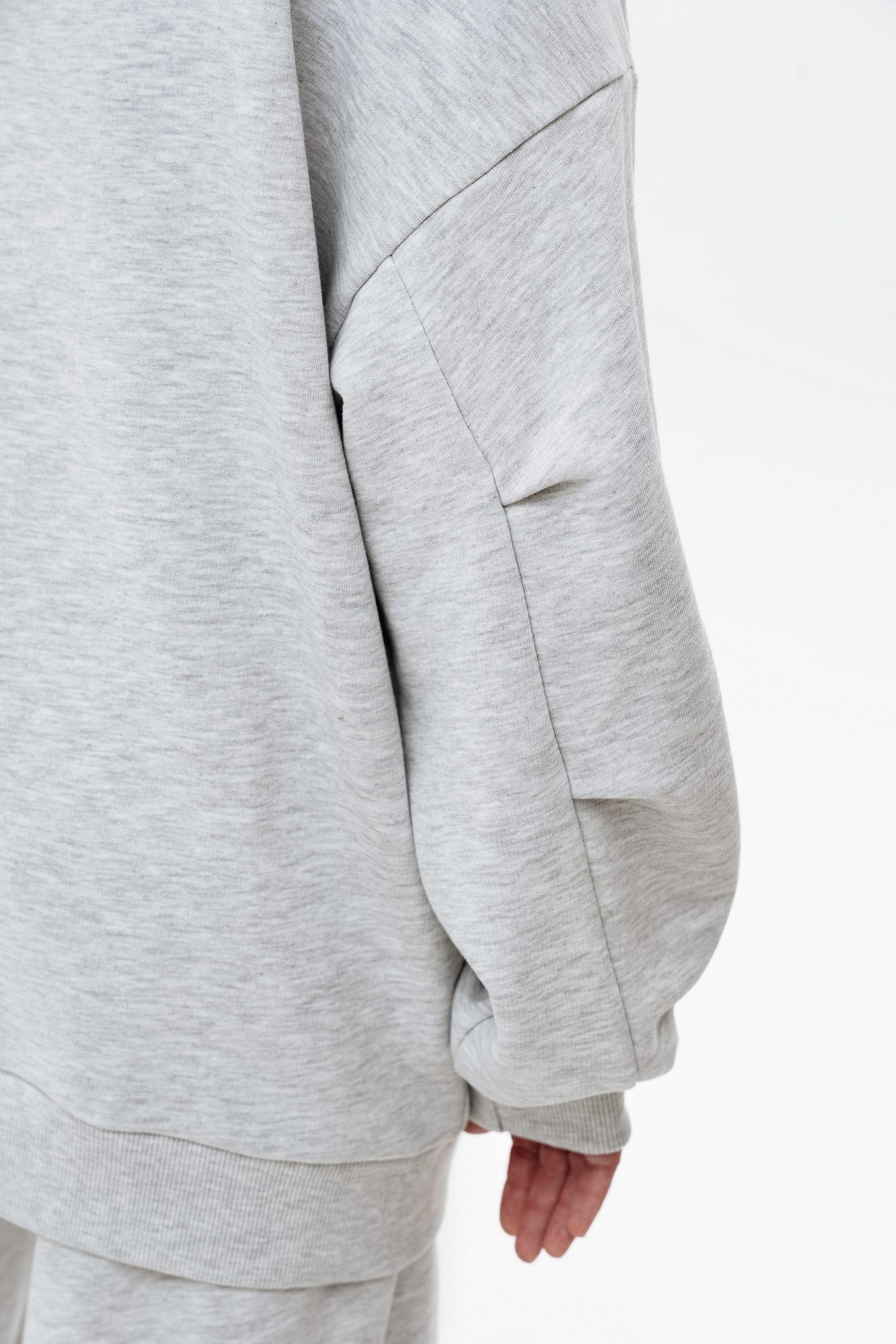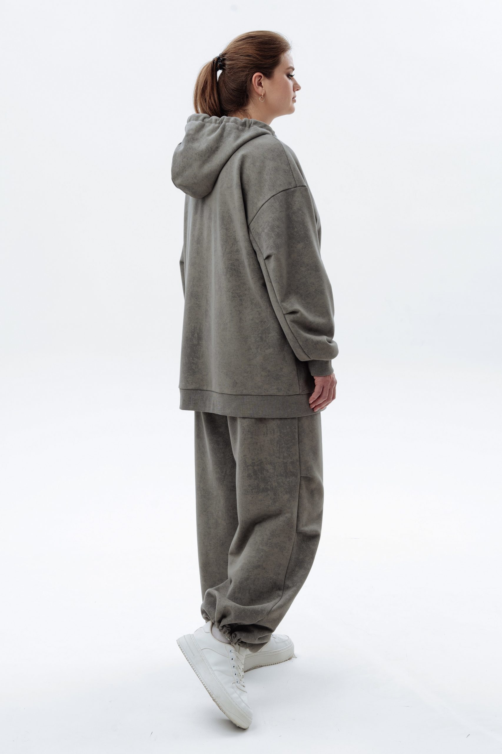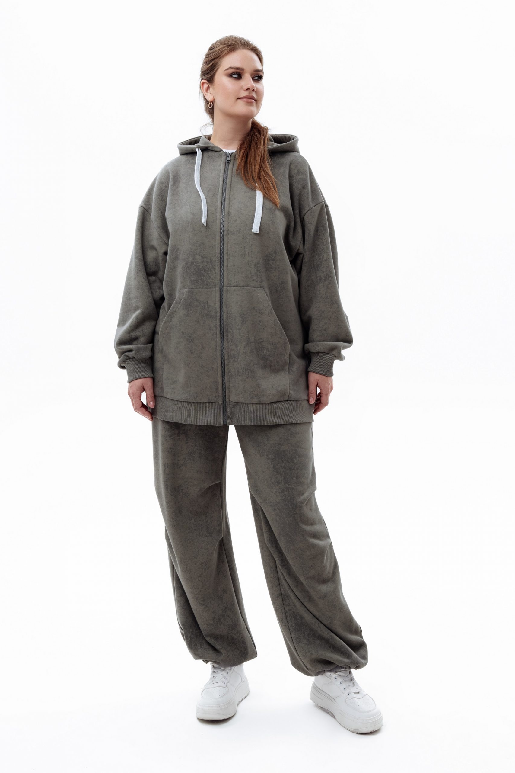 Толстовка большого объёма, с капюшоном. Спереди расположена застежка на разъемную молнию, два накладных кармана. Линия плеча спущена, рукав рубашечного покроя. По локтевому шву рукава, в области локтя, заложены две односторонние складки. По низу рукава обработаны притачными манжетами. По переднему краю капюшона - кулиска со шнуром. Низ изделия обработан поясом. Пояс и манжеты выполнены из кашкорсе.
