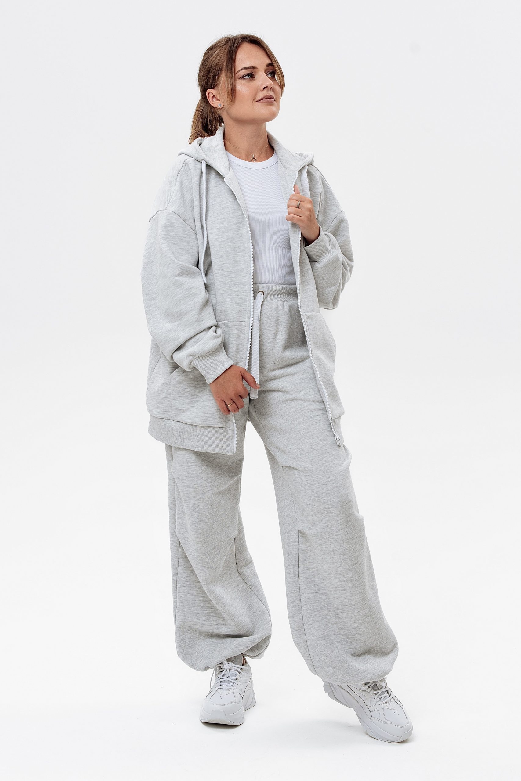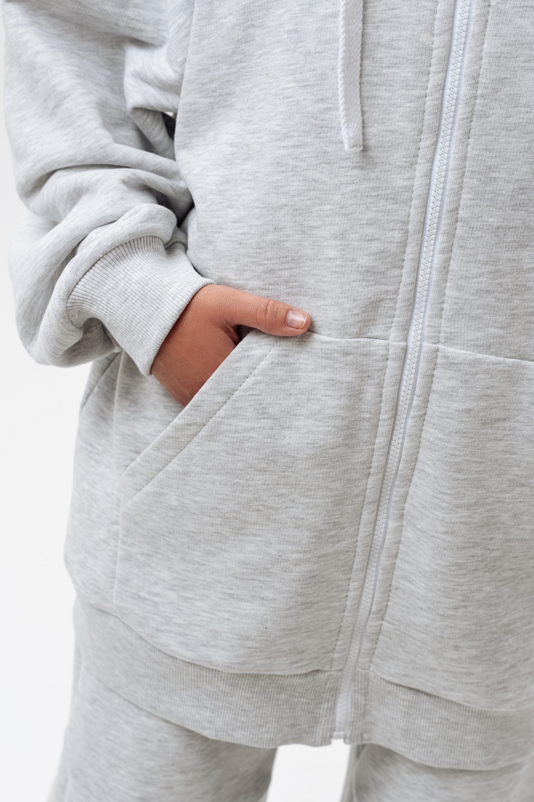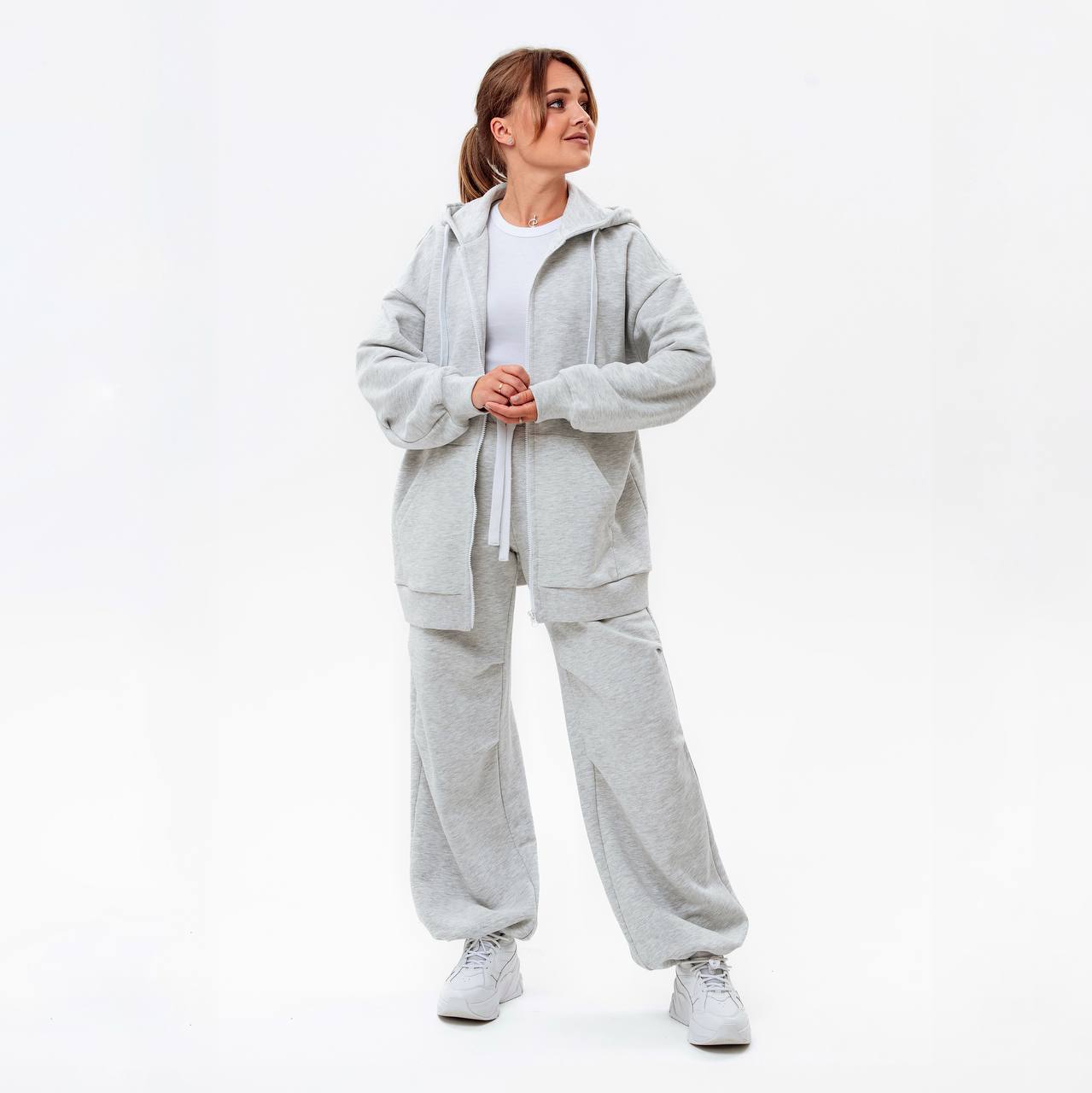 Толстовка большого объёма, с капюшоном. Спереди расположена застежка на разъемную молнию, два накладных кармана. Линия плеча спущена, рукав рубашечного покроя. По локтевому шву рукава, в области локтя, заложены две односторонние складки. По низу рукава обработаны притачными манжетами. По переднему краю капюшона - кулиска со шнуром. Низ изделия обработан поясом. Пояс и манжеты выполнены из кашкорсе.